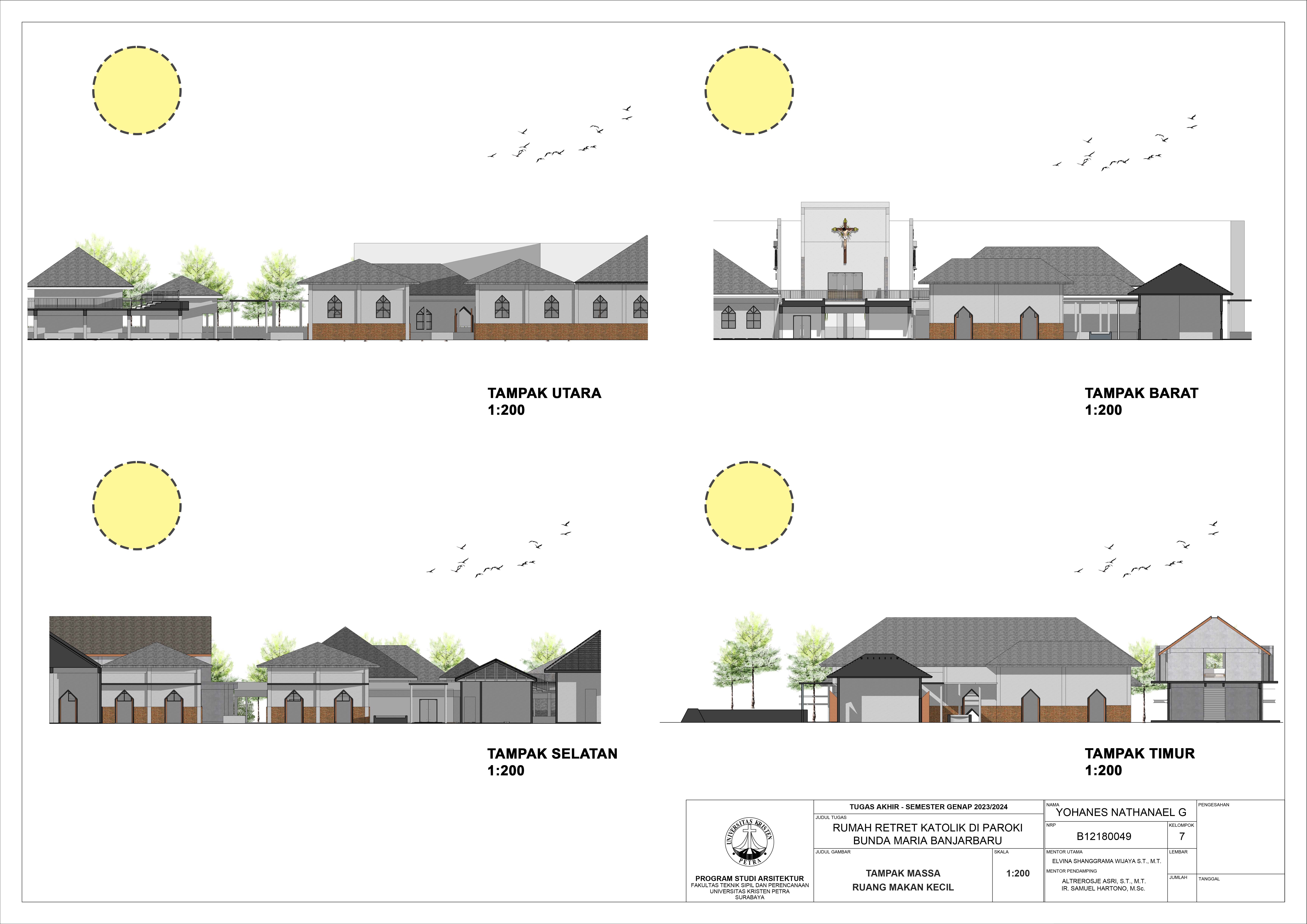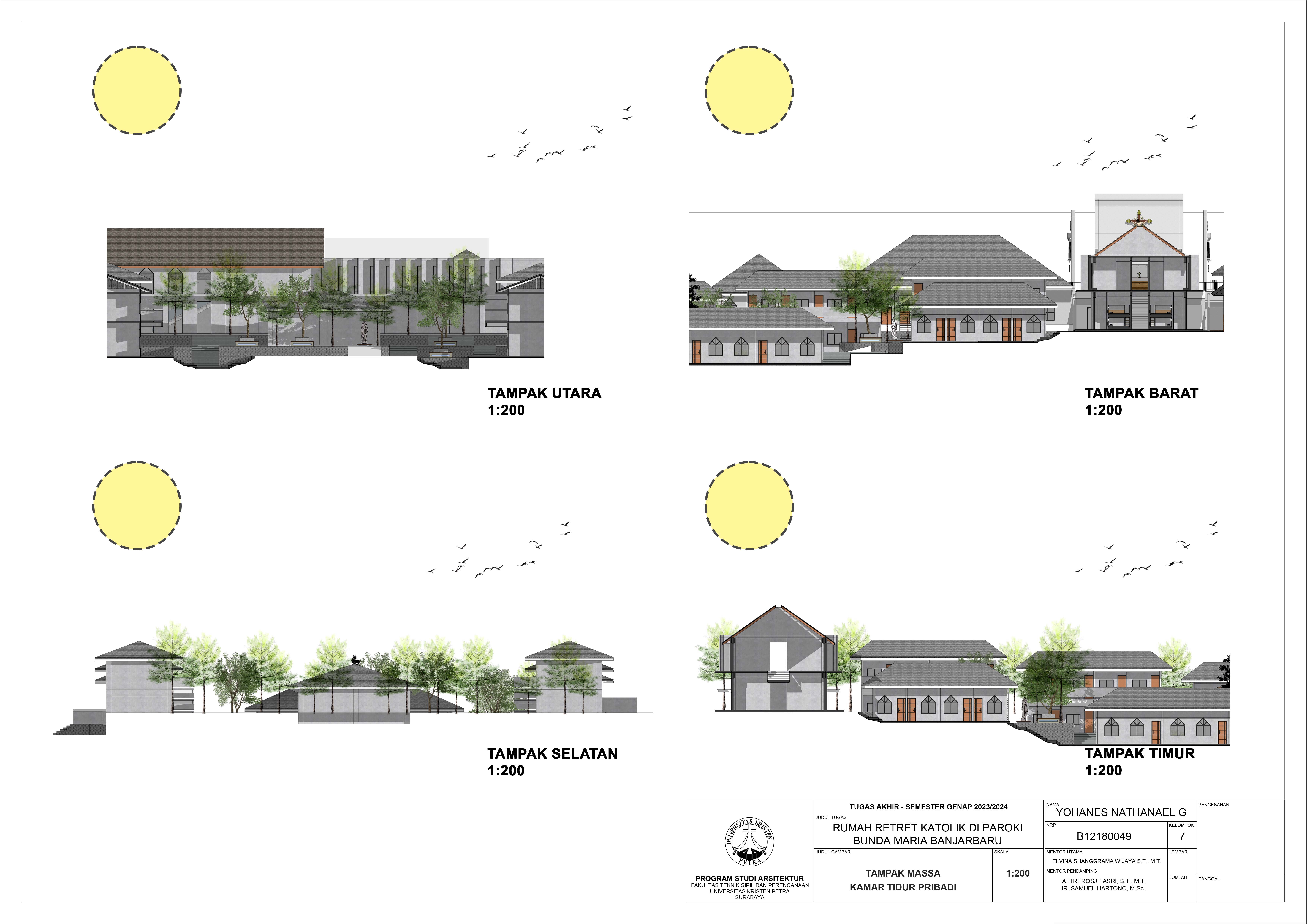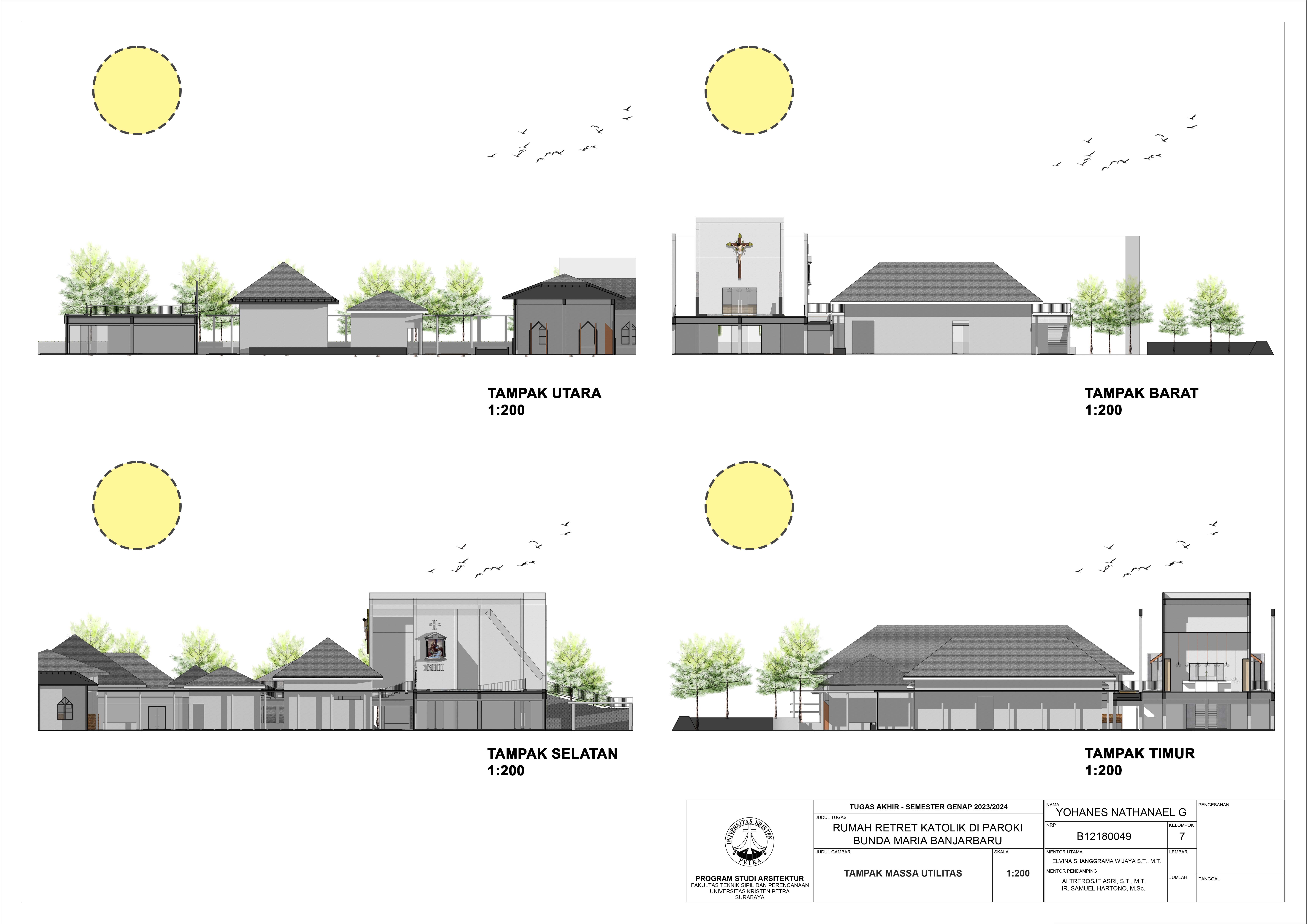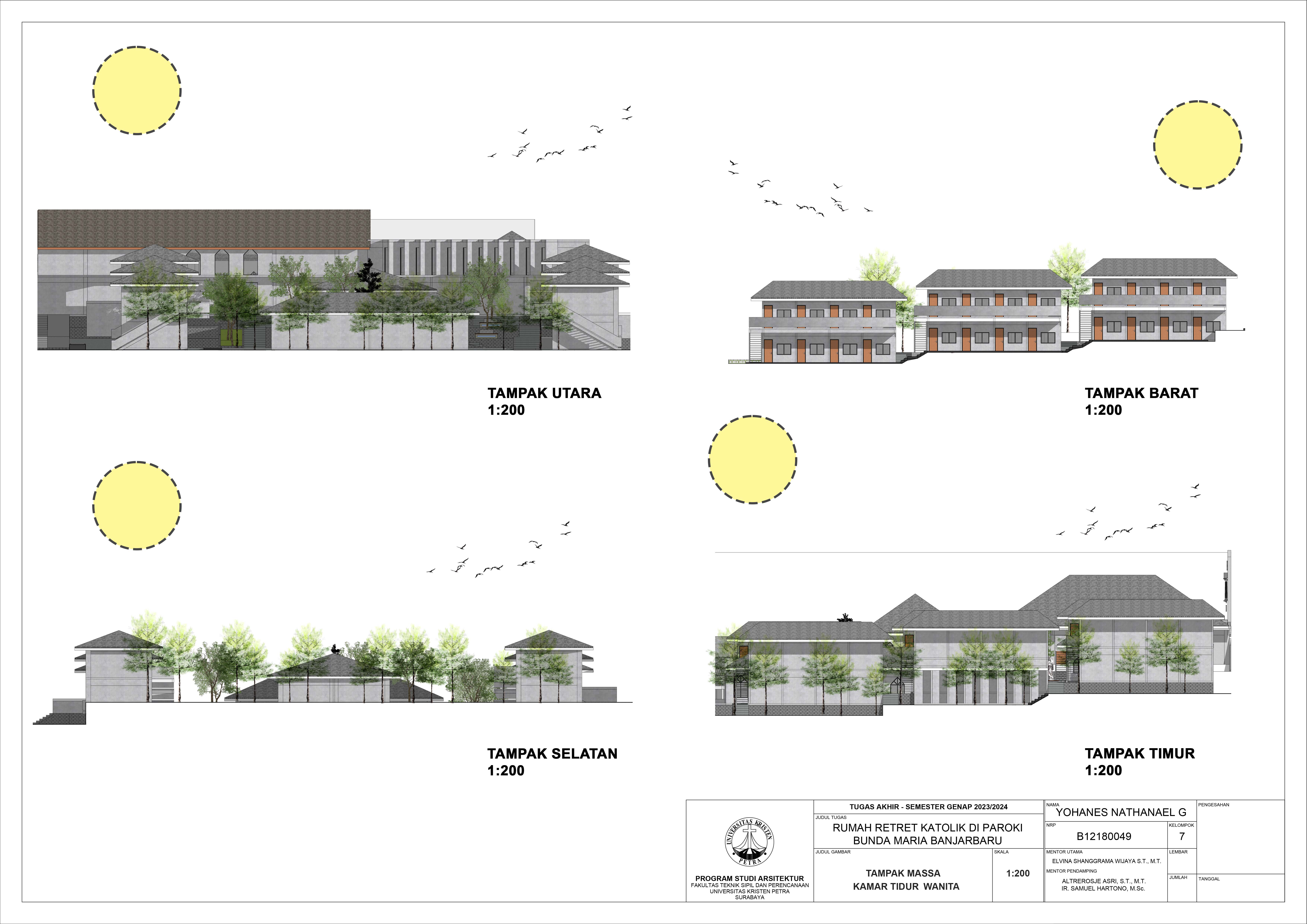 dan juga dihadapkan pada tantangan Ekonomi yang meningkat. Situasi ini menyoroti perlunya ruang-ruang suciuntuk memperdalam iman dan spiritualitas di tengah kesibukan dan tekanan kehidupan modern. Rumah RetretKatolik di Paroki Bunda Maria Banjarbaru adalah sebuah respons kebutuhan mendalam komunitas Katolik diKalimantan Selatan untuk memiliki tempat refleksi spiritual yang tenang dan mendalam. Perancangan RumahRetret ini menawarkan solusi dengan menyediakan fasilitas komprehensif termasuk kapel, ruang doa, aula, areahunian, ruang makan, serta fasilitas pendukung lainnya seperti toilet umum dan area parkir. Desainnyamengutamakan kesakralan dan kenyamanan personal dengan pendekatan holistik melalui penggunaan pencahayaan alami, lanskap yang terintegrasi, dan akustik yang mendukung. Penggunaan material yang dipilih dengan hati-hati dan penempatan strategis elemen religius juga memperkuat konsep desain yang mengutamakan kontemplasi dan interaksi spiritual. Inisiatif ini bertujuan untuk memperbarui dan memodernisasi fasilitas spiritual, yang ditunjukkan dengan transformasi dari Wisma Sikhar yang sudah tua menjadi Rumah Retret modern yang memenuhi kebutuhan spiritual saat ini sambil mempertahankan signifikansi historis dan spiritualnya.