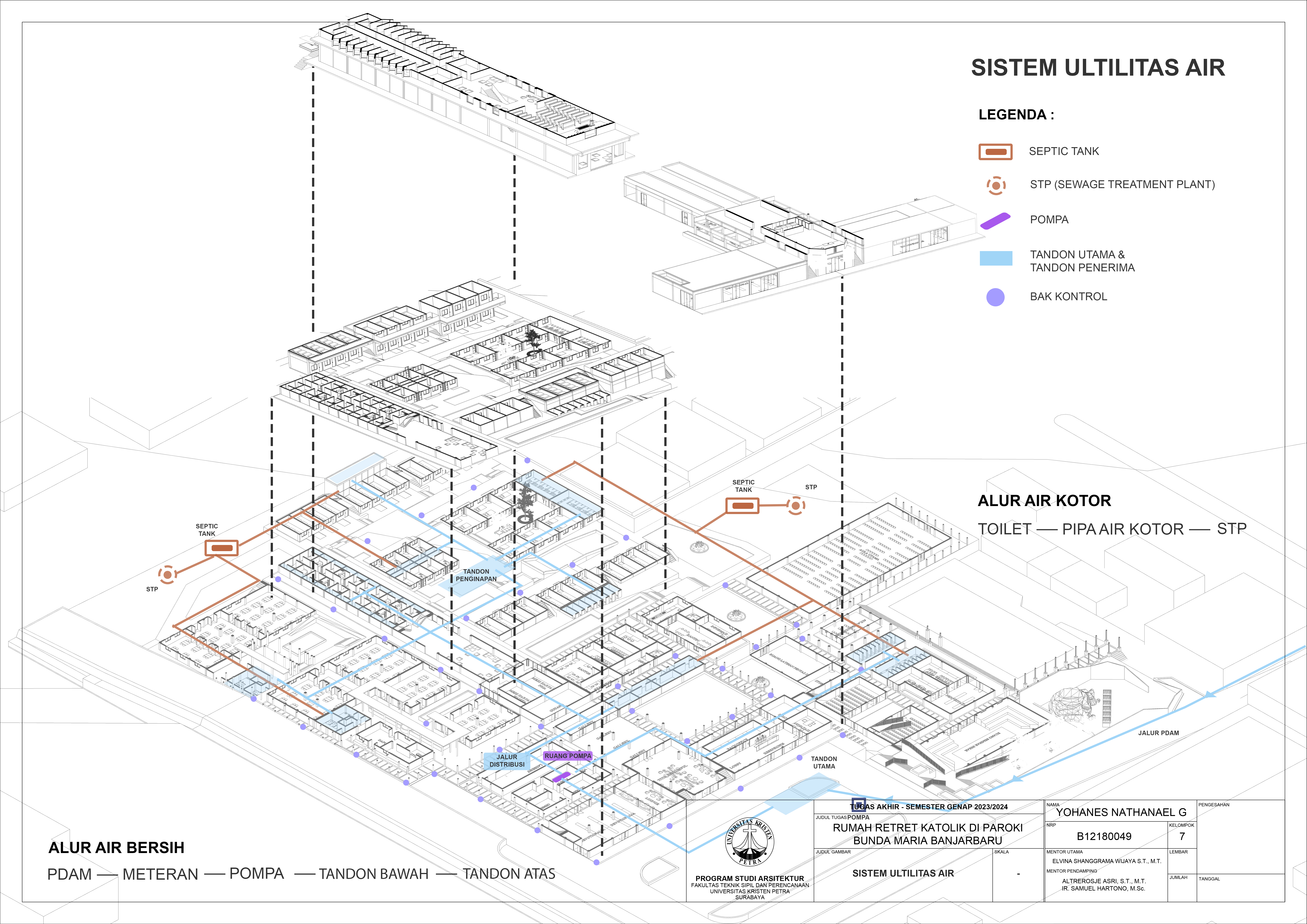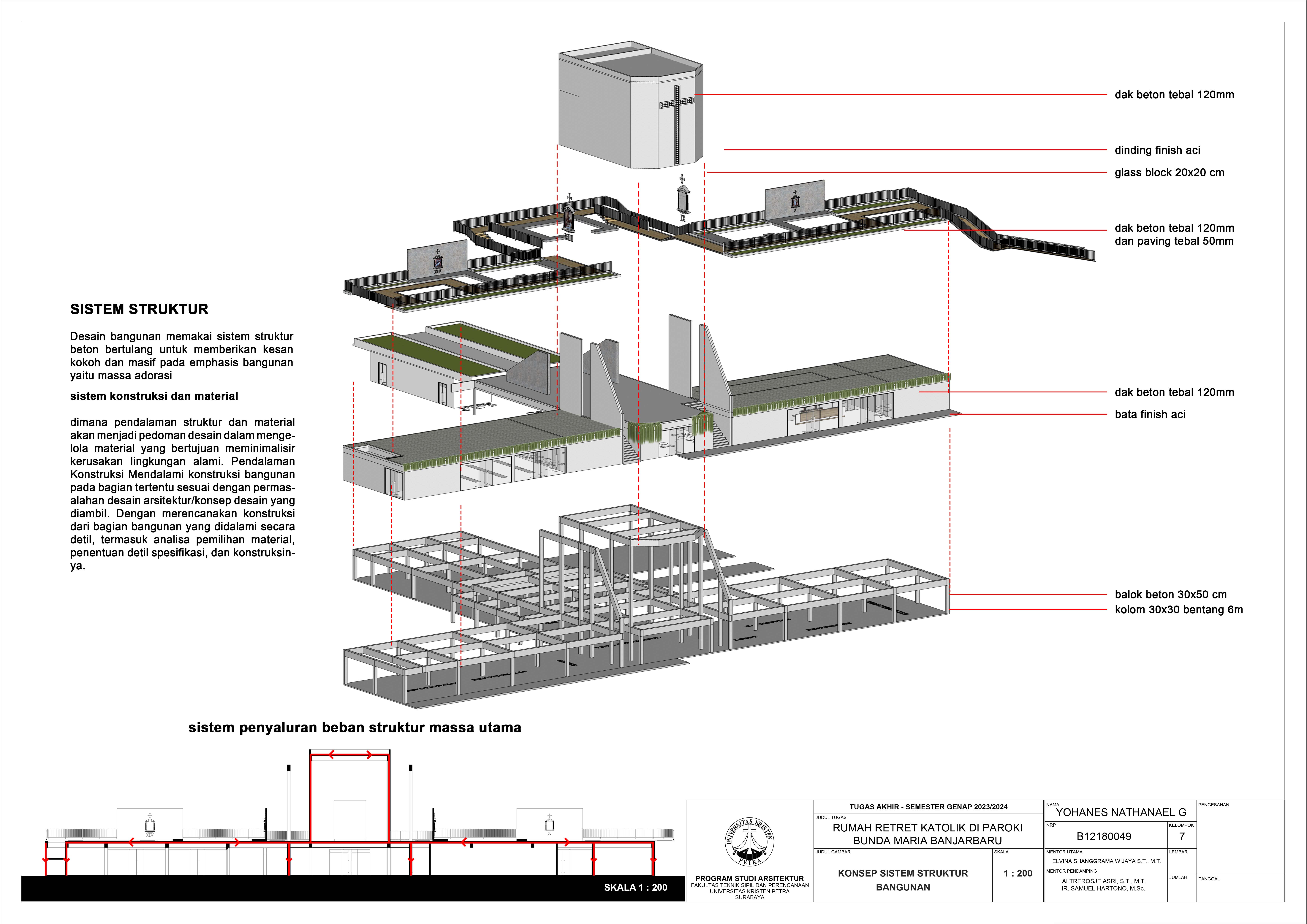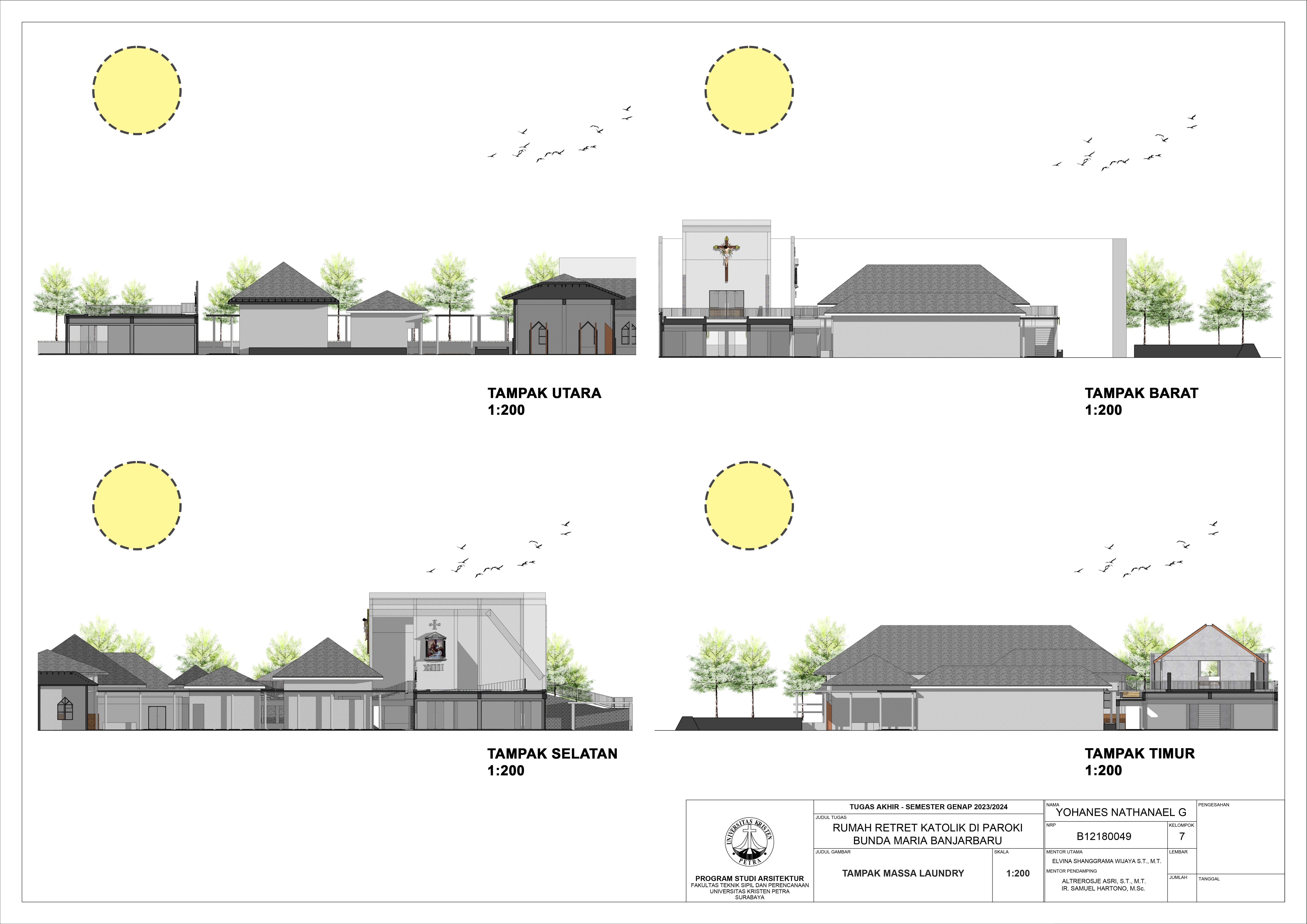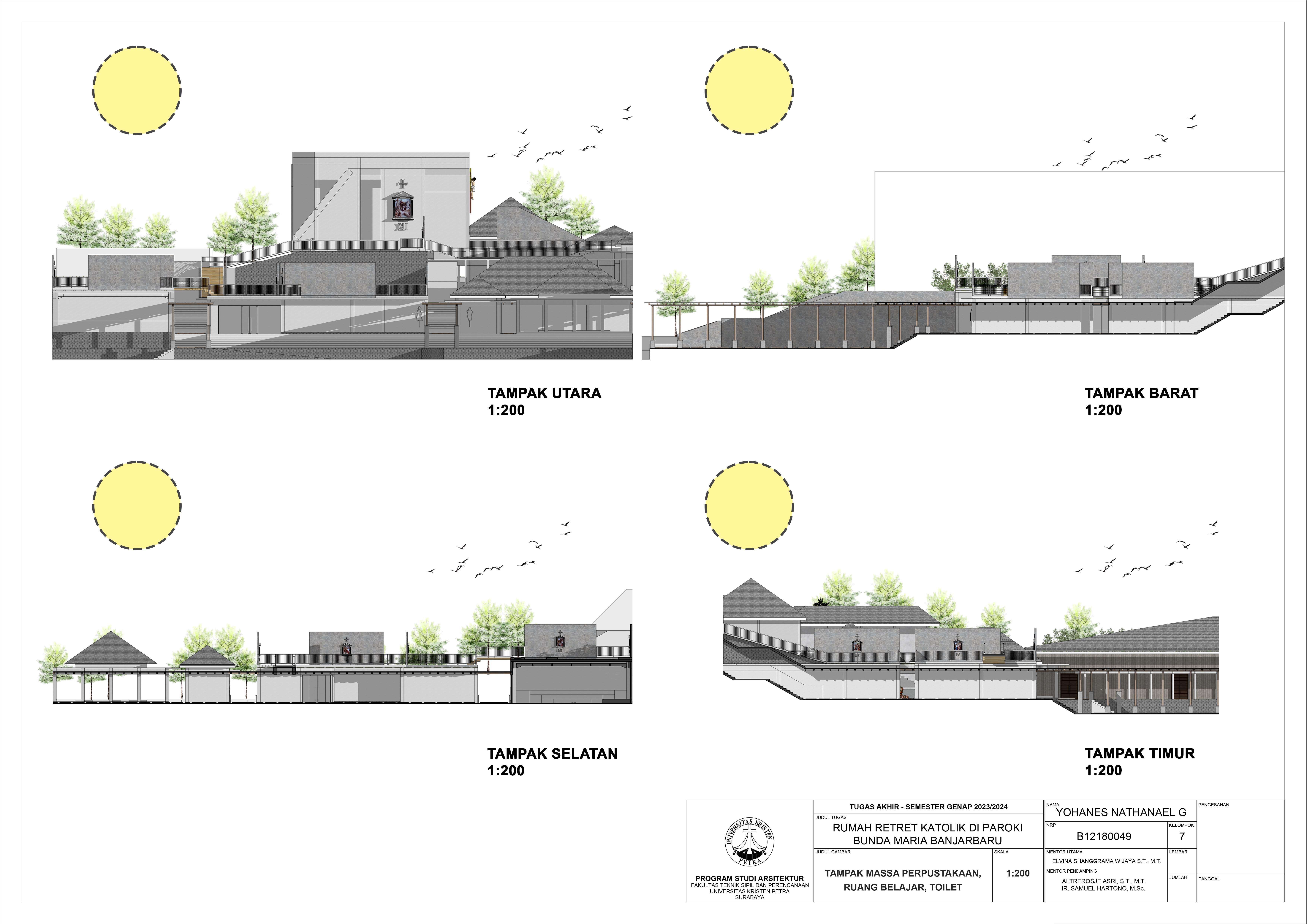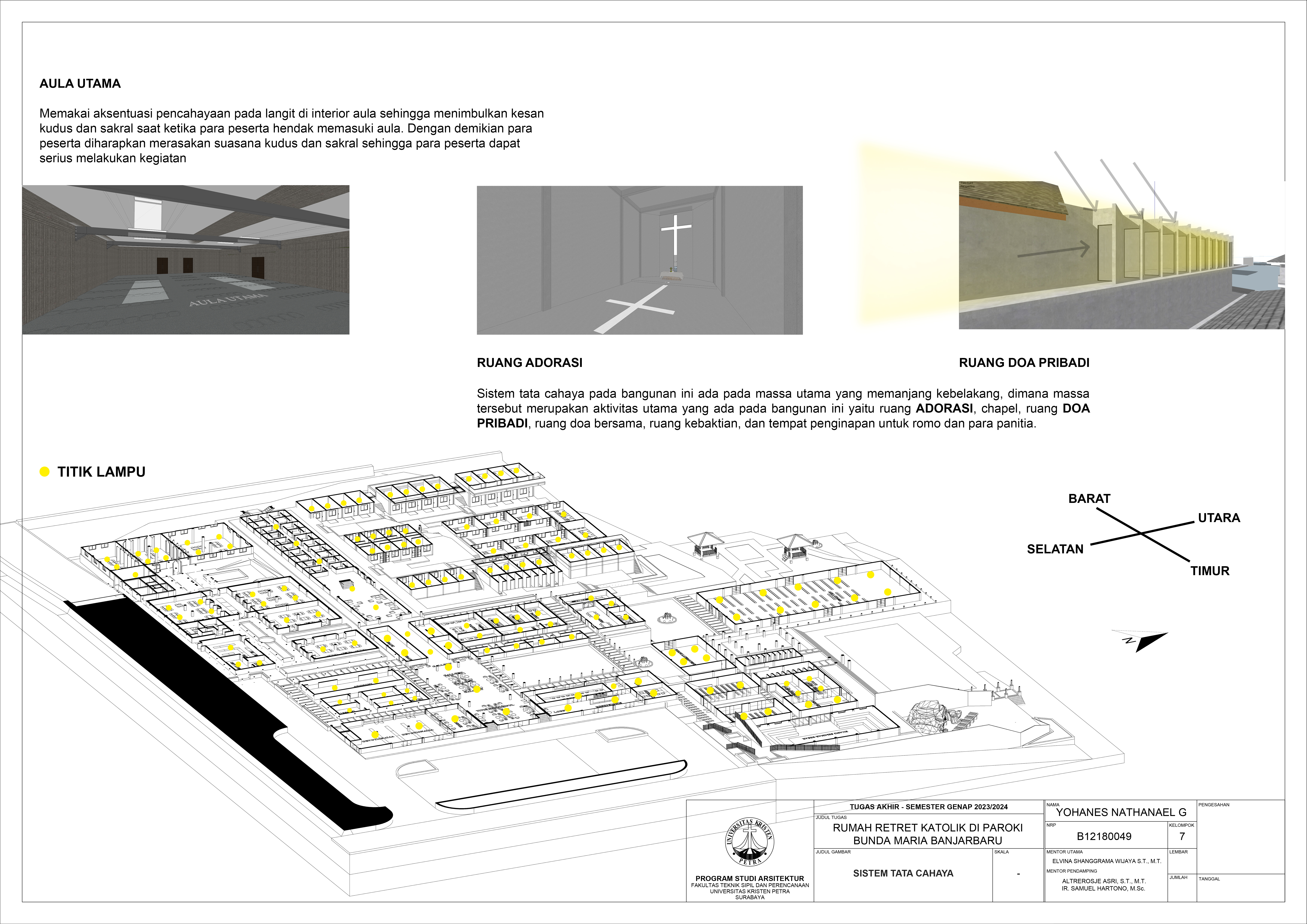 dan juga dihadapkan pada tantangan Ekonomi yang meningkat. Situasi ini menyoroti perlunya ruang-ruang suciuntuk memperdalam iman dan spiritualitas di tengah kesibukan dan tekanan kehidupan modern. Rumah RetretKatolik di Paroki Bunda Maria Banjarbaru adalah sebuah respons kebutuhan mendalam komunitas Katolik diKalimantan Selatan untuk memiliki tempat refleksi spiritual yang tenang dan mendalam. Perancangan RumahRetret ini menawarkan solusi dengan menyediakan fasilitas komprehensif termasuk kapel, ruang doa, aula, areahunian, ruang makan, serta fasilitas pendukung lainnya seperti toilet umum dan area parkir. Desainnyamengutamakan kesakralan dan kenyamanan personal dengan pendekatan holistik melalui penggunaan pencahayaan alami, lanskap yang terintegrasi, dan akustik yang mendukung. Penggunaan material yang dipilih dengan hati-hati dan penempatan strategis elemen religius juga memperkuat konsep desain yang mengutamakan kontemplasi dan interaksi spiritual. Inisiatif ini bertujuan untuk memperbarui dan memodernisasi fasilitas spiritual, yang ditunjukkan dengan transformasi dari Wisma Sikhar yang sudah tua menjadi Rumah Retret modern yang memenuhi kebutuhan spiritual saat ini sambil mempertahankan signifikansi historis dan spiritualnya.