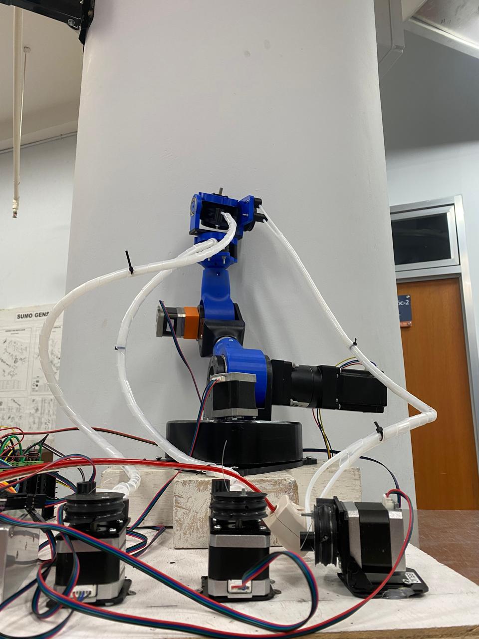 Di zaman yang sudah semakin maju banyak pekerjaan yang sudah mulai digantikan oleh mesin otomatis maupun robot. Penggunaan mesin otomatis dan robot di industri dipakai karena efektivitasnya yang tinggi dan cepat serta lebih presisi bila dibandingkan dengan manusia. Sedangkan contoh dari penggunaan Collaborative Robot yaitu Robot kamera dengan sistem 6 derajat kebebasan (6 DoF). DoF atau Degree of Freedom adalah suatu istilah untuk mendeskripsikan jumlah ruang gerak tiga dimensi yang dapat dilakukan oleh robot. Umumnya robot dapat bergerak ke atas, bawah, maju, mundur, dan berputar. Penggunaan robot 6 Degree of Freedom (6 DoF) sebagai holder kamera yang menggunakan sistem Bowden Cable. Robot 6 DoF dirancang untuk memberikan fleksibilitas dalam menggerakkan kamera dalam tiga dimensi, yang sangat berguna dalam berbagai aplikasi fotografi dan pengawasan. Sistem Bowden Cable digunakan untuk mentransfer gerakan dari motor ke holder kamera dengan efisiensi tinggi, mengurangi beban pada struktur utama robot dan meningkatkan presisi dalam pergerakan kamera.