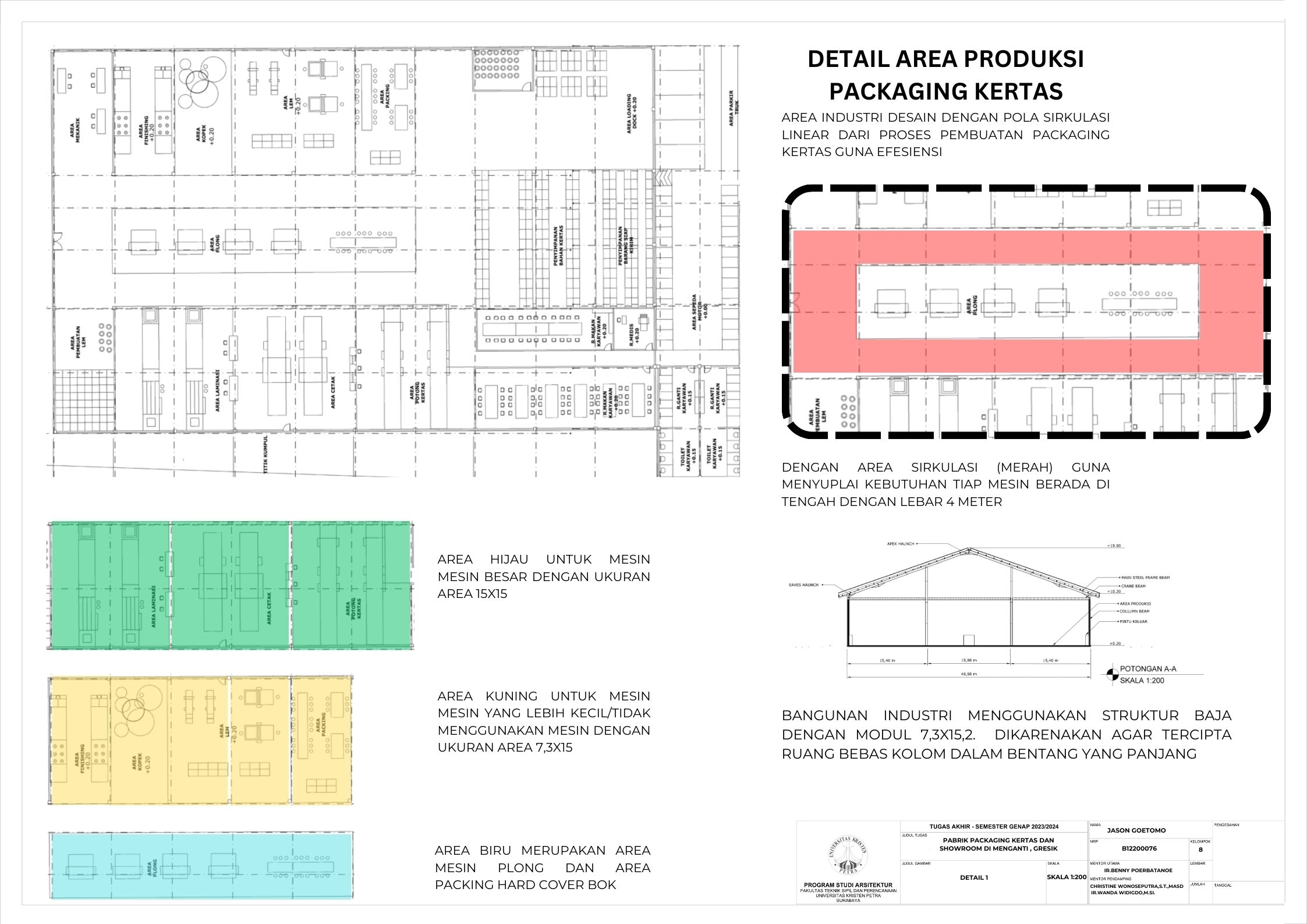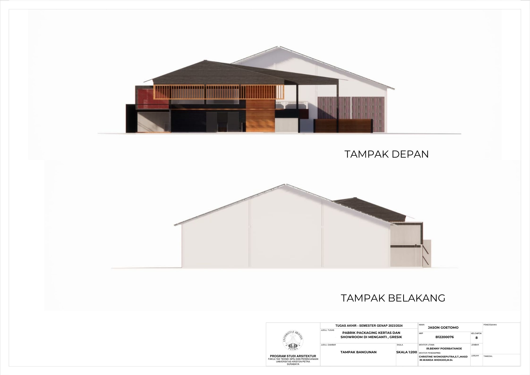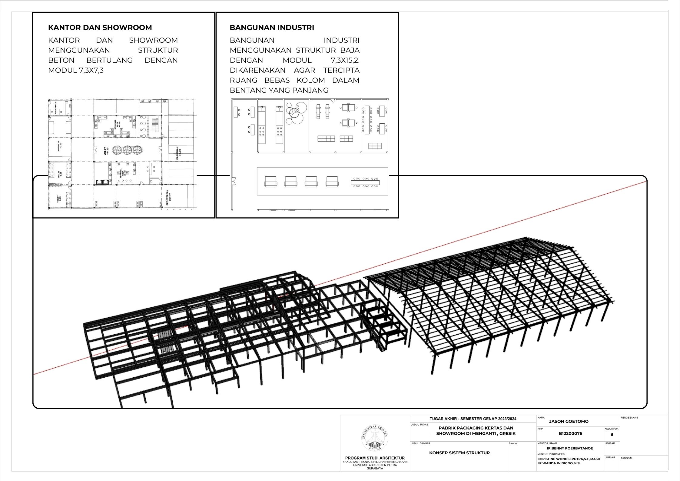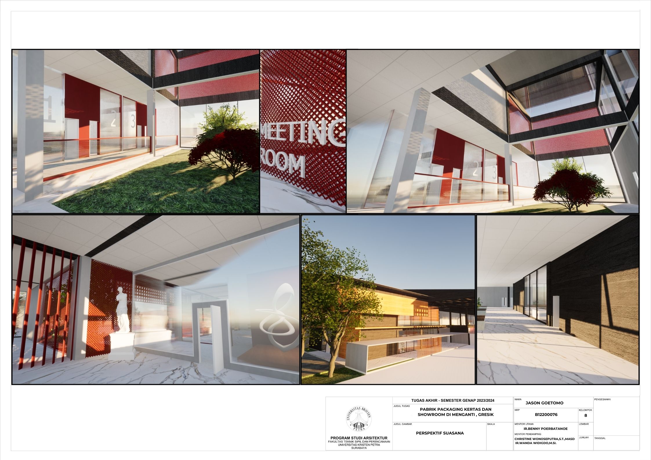 Kerumitan proses pembuatan packaging kertas dan pengenalan akan packaging kertas menjadi alasan akan bangunan Pabrik Packaging Kertas dan Showroom ini didesain. Berlokasi di Menganti Gresik sebagai area industri dan perdagangan barang dan jasa. Pabrik packaging kertas dan showroom ditata berdasarkan pendekatan sirkulasi dari para pengguna. Bangunan ini terbagi menjadi 3 area (area showroom, area kantor dan area industri). Area industri diselesaikan dengan pendekatan sirkulasi pengolahan kertas hingga menjadi satu sistem packaging kertas yang urut.