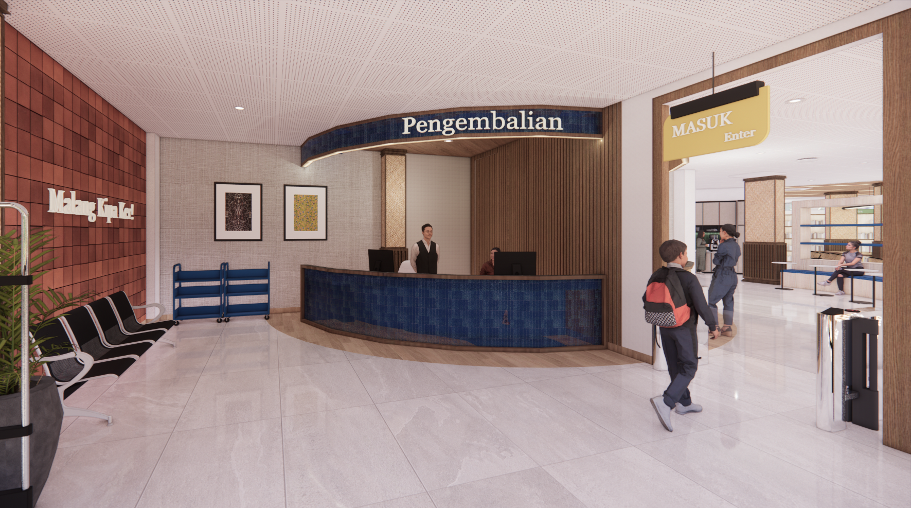 Kota Malang sebagai “Kota Pelajar” memiliki perpustakaan sebagai lembaga Pendidikan, berperan aktif dalam memberikan edukasi dan akses informasi bagi segala kalangan masyarakat. Seiring berkembangnya teknologi dan perubahan kebutuhan pengguna, perpustakaan tidak hanya sebagai tempat membaca buku, tetapi juga sebagai pusat pembelajaran multiliterasi yang memadukan berbagai jenis literasi, mulai dari literasi tekstual, visual, audio, performa dan digital, sehingga Perpustakaan Umum dan Arsip Daerah Kota Malang memerlukan penyesuaian dan perbaikan dalam desain interior. Redesain interior perpustakaan menggunakan metode Design Thinking. Hasil perancangan berupa desain interior Perpustakaan Umum dan Arsip Daerah Kota Malang dengan tema “Kepingan Malang” yang mendukung kegiatan multiliterasi dengan menggabungkan elemen, motif kultural dan sejarah lokal Kota Malang untuk meningkatkan minat baca, aksesibilitas, dan kualitas pendidikan non-formal di masyarakat Kota Malang.