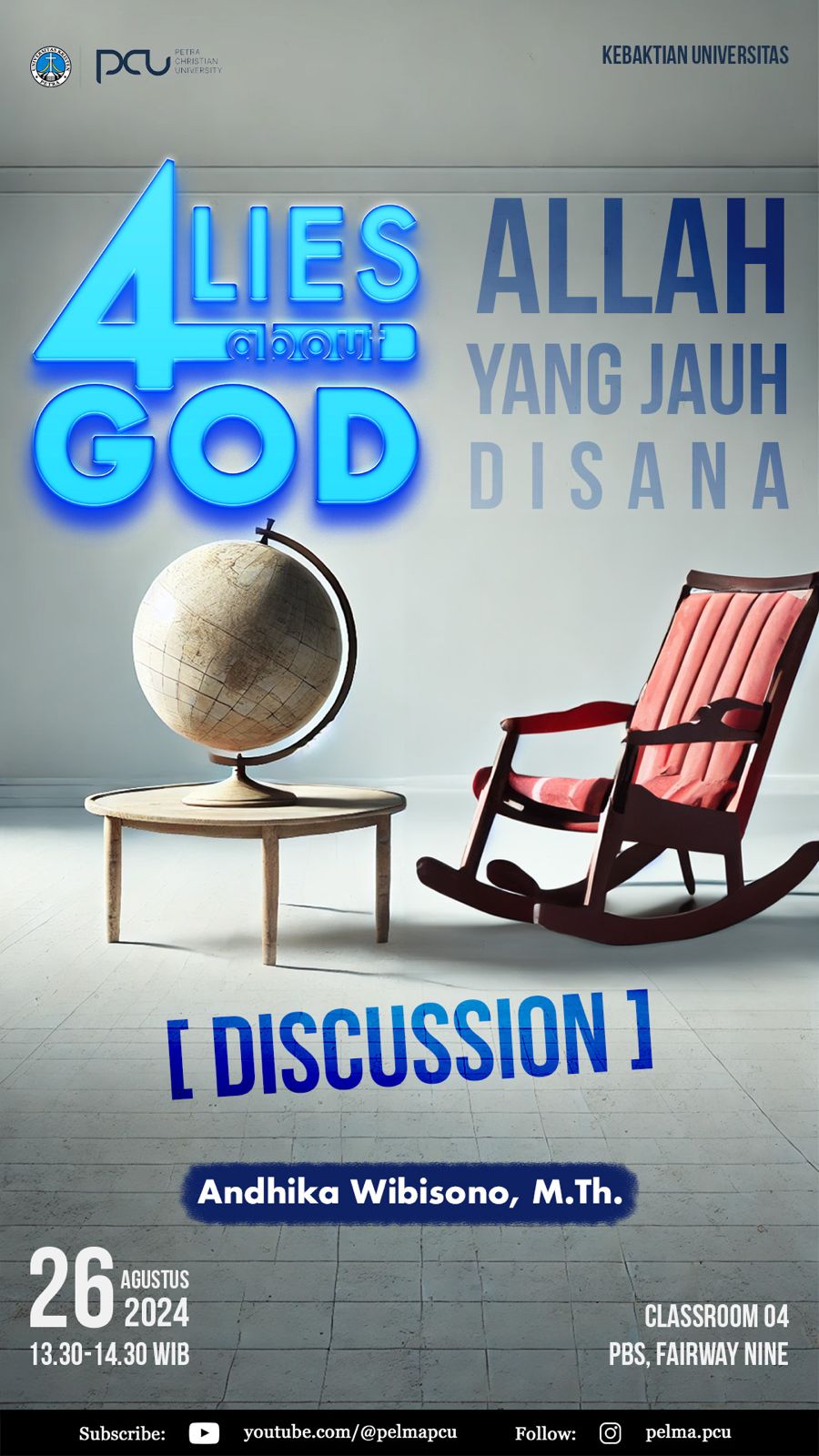 Pusat Kerohanian UK Petra Surabaya pada tanggal 26 Agustus 2024 jam 13.30 - 14.30 Mengadakan acara diskusi dengan topik "4 lies about God Allah yang jauh disana". dengan narasumber Andhika Wibisono, M.Th. bertempat di Classroom 4 PBS, Fairway Nine.