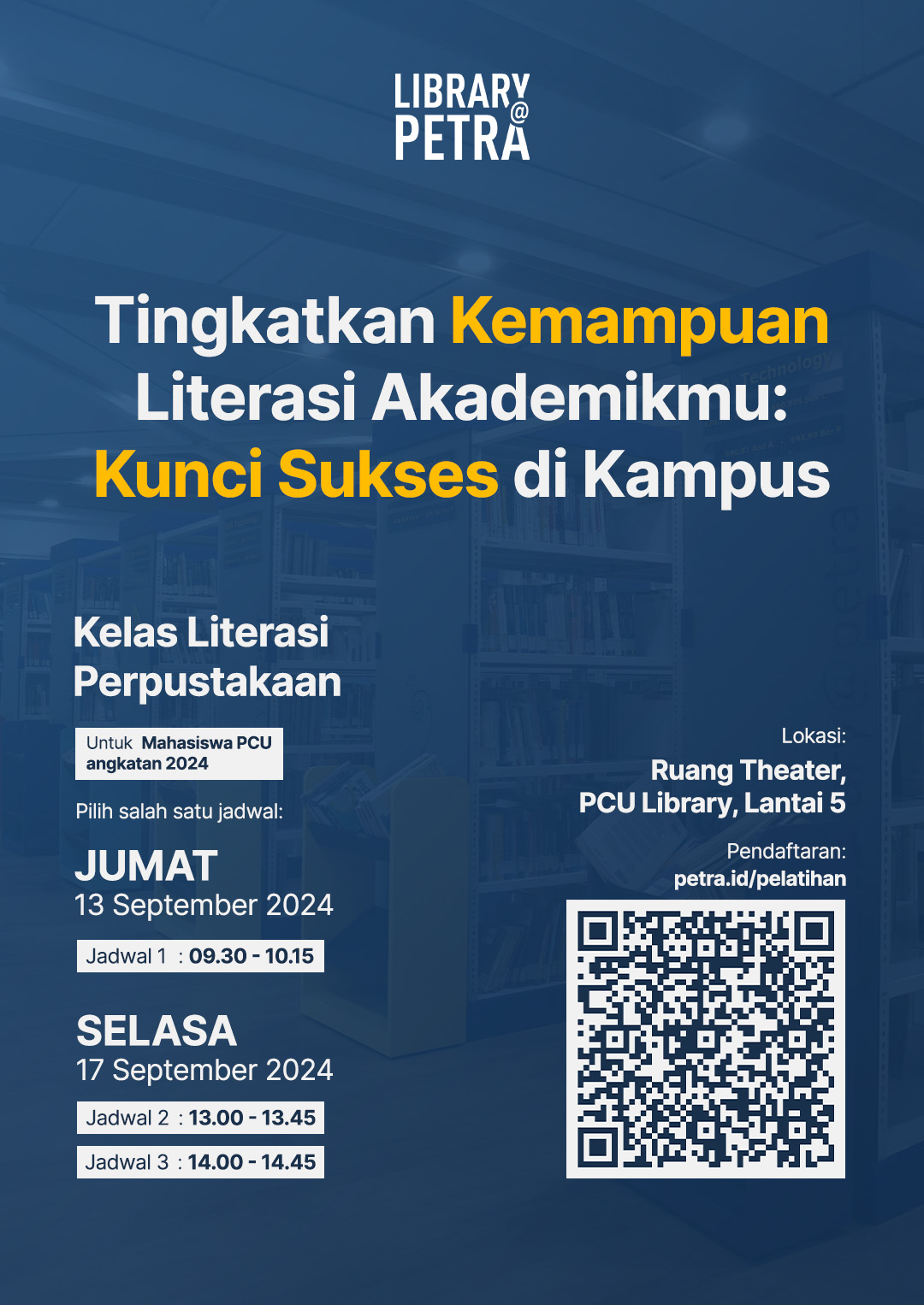 Perpustakaan UK Petra Surabaya membuka kelas literasi perpustakaan, pengenalan perpustakaan untuk mahasiswa baru dilaksanakan pada 13 dan 17 September 2024 bertempat di ruang Theater Perpustakaan.