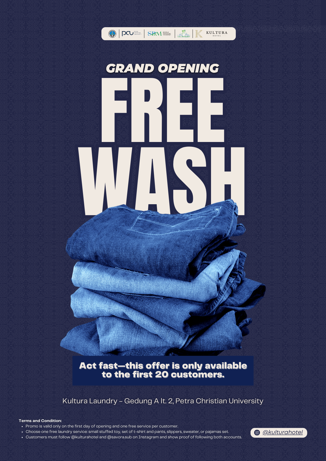 This is a grand opening promotion from Kultura Laundry located at Gedung A It. 2, Petra Christian University. They are offering FREE WASH to the first 20 customers! The offer is valid only on the first day of opening, and customers can choose one free laundry service from a variety of options, including a small stuffed toy, a set of t-shirt and pants, slippers, a sweater, or pajamas set.