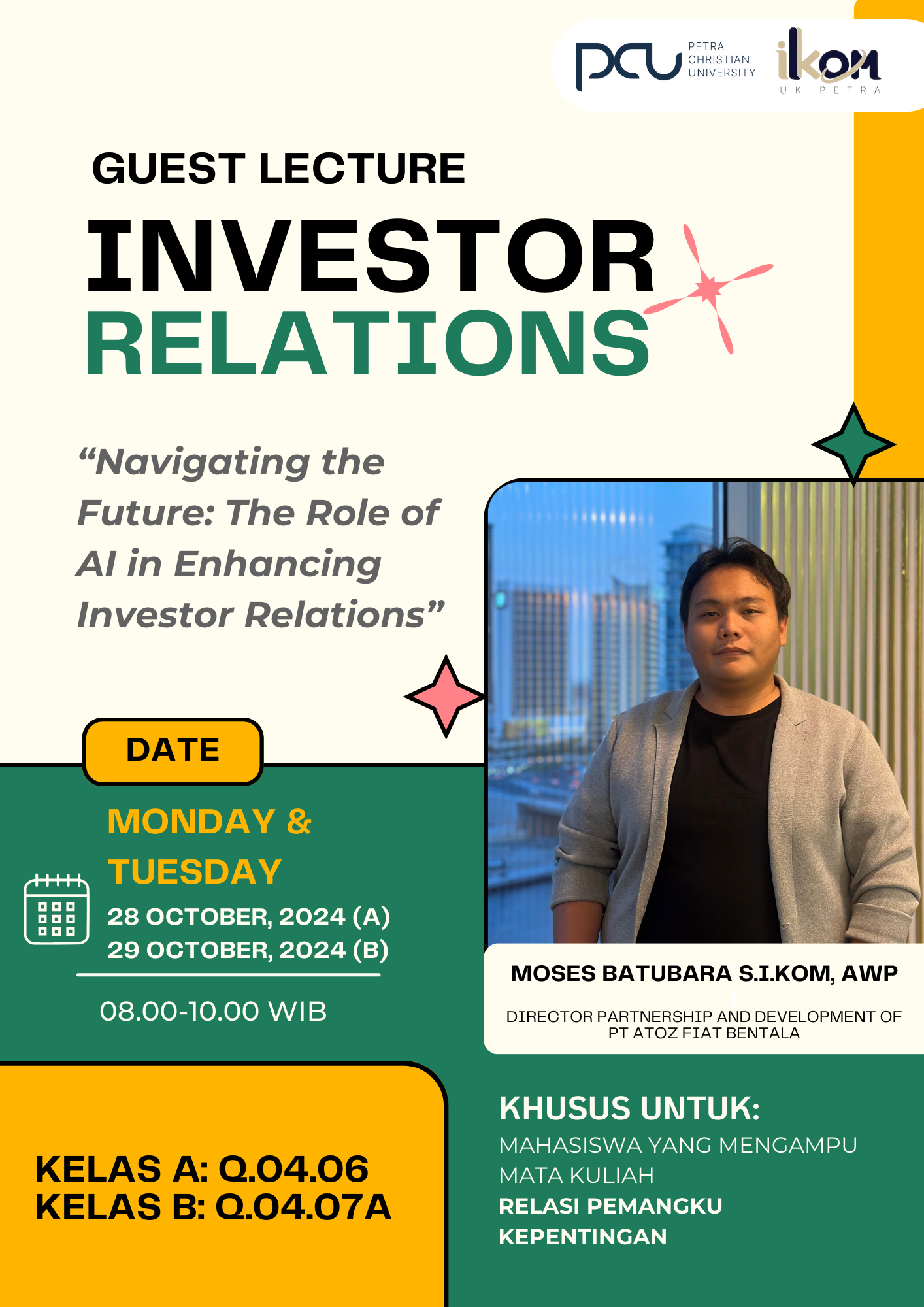 Kelas kuliah tamu untuk Mata Kuliah Relasi Pemangku Kepentingan akan berlangsung pada tanggal 28 dan 29 Oktober 2024 bersama Bapak Moses Batubara, S.I.Kom., AWP selaku direktur partnership dan development dari PT Atoz Fia Bentala.