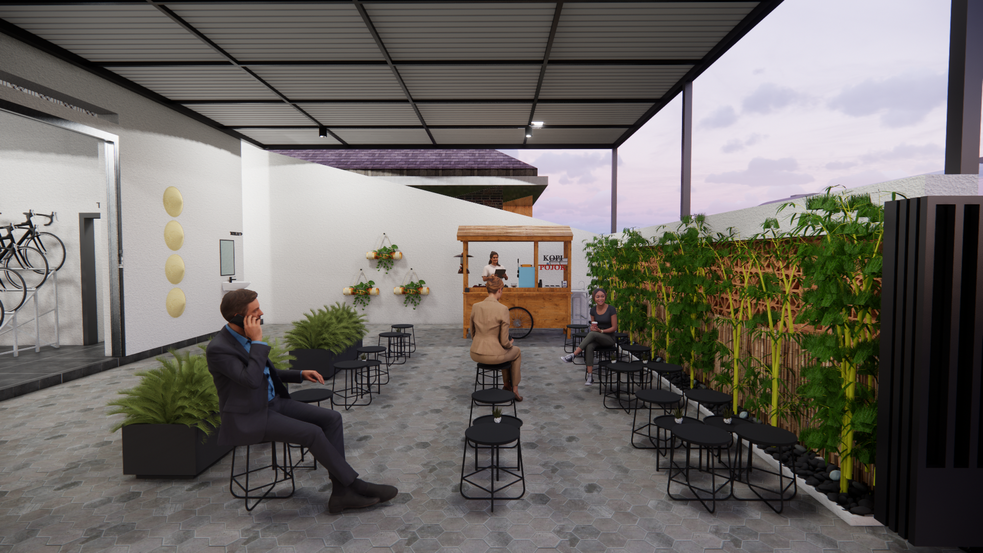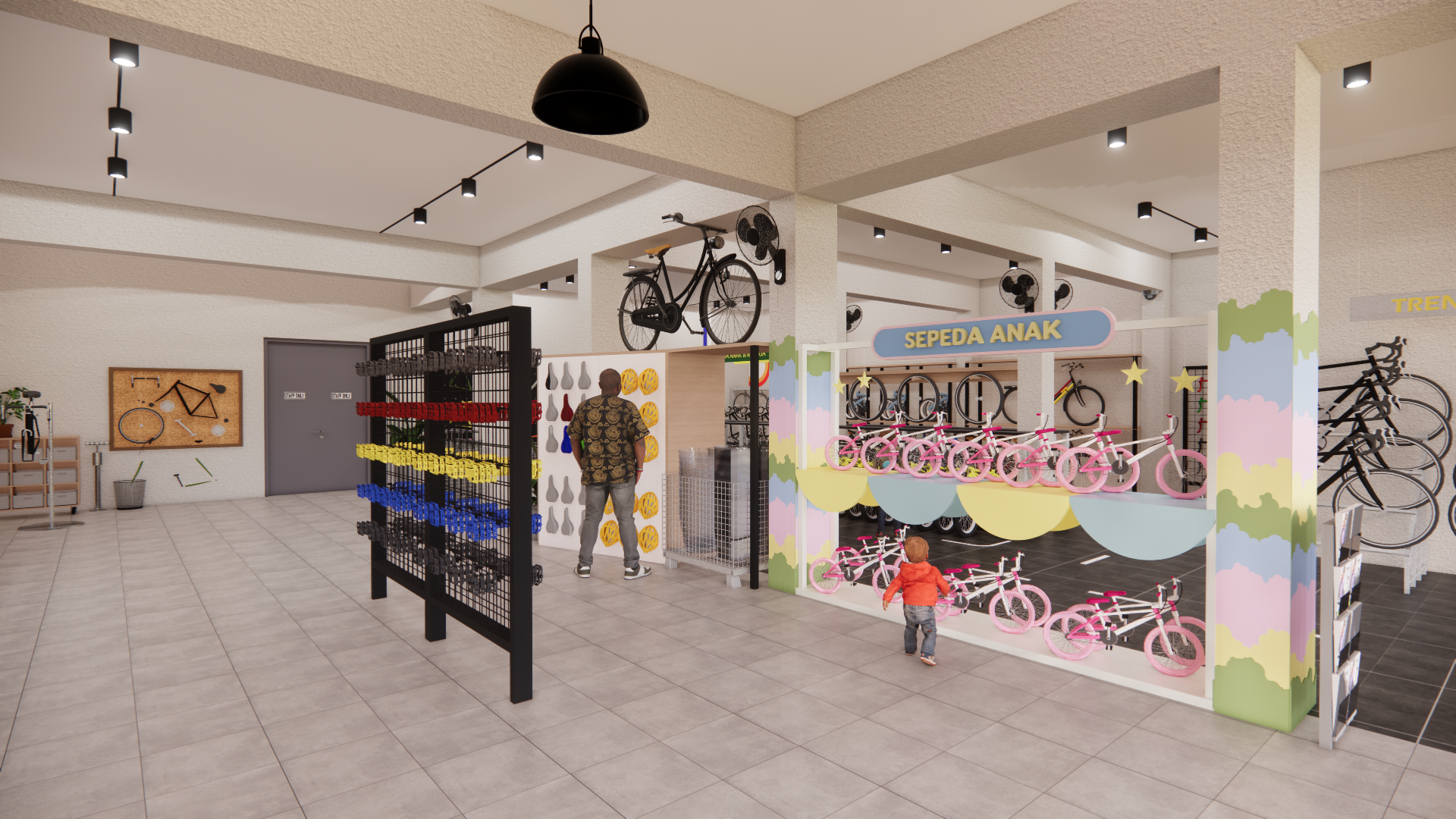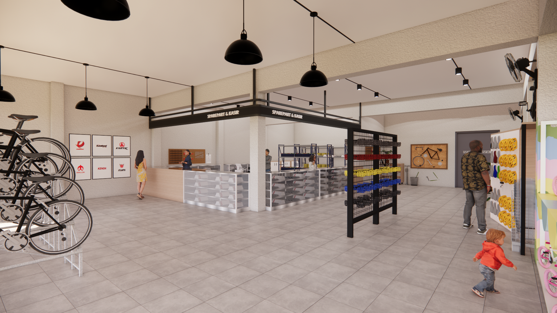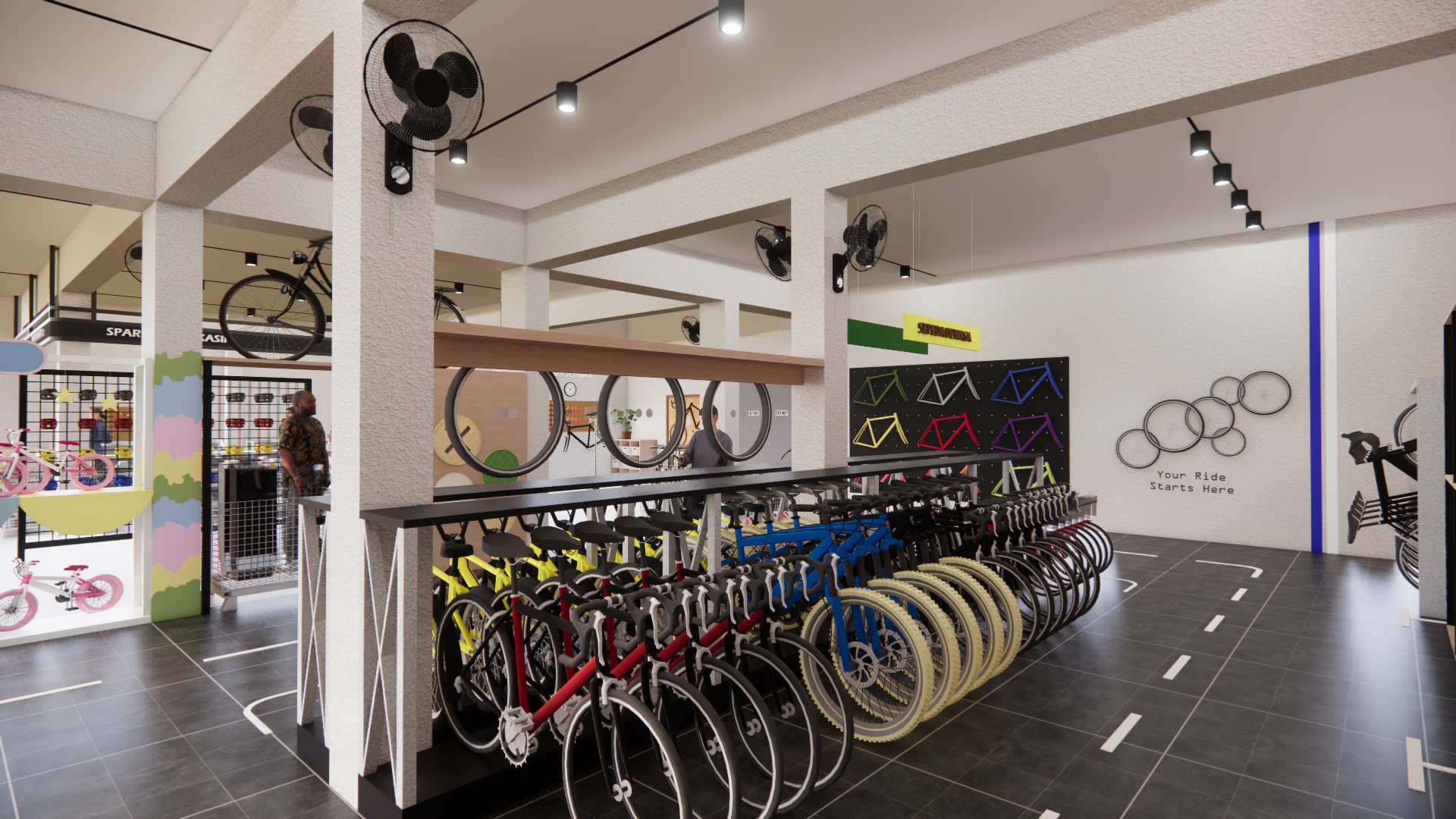 Pusat sepeda Pojok merupakan pusat sepeda yang berdiri pada tahun 1998. Pusat sudah dikenal sebagai pusat sepeda yang paling lengkap di Walikukun yang menjual berbagai kebutuhan sepeda seperti sparepart, aksesoris sepeda, dan sepeda. Pusat sepeda Pojok menghadapi tantangan terkait sirkulasi dan desain interior yang kurang optimal, sehingga mempengaruhi kenyamanan pelanggan. Maka dari itu tujuan dari perancangan ini adalah untuk melakukan re-desain terhadap pusat sepeda menjadi pusat sepeda dan untuk meningkatkan kenyamanan pelanggan. Dengan menerapkan metode design thinking, transformasi ini diharapkan dapat meningkatkan kenyamanan pelanggan, efisiensi sirkulasi dalam pusat sepeda, dan memperkuat identitas pusat sepeda.