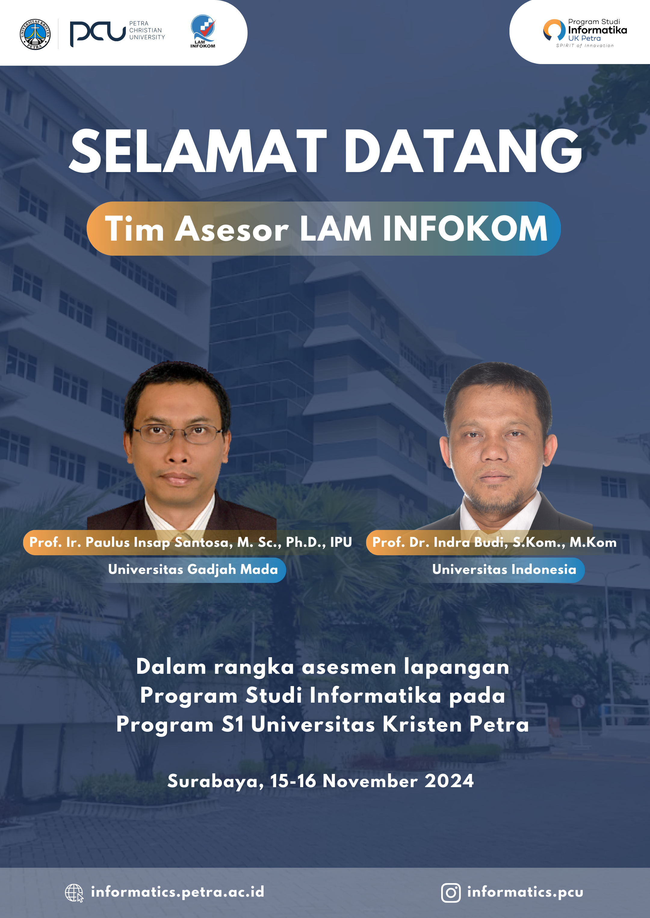 Ucapan selamat datang untuk tim visitasi akreditasi yang melakukan penilaian di Program Studi Teknik Informatika Universitas Kristen Petra. Pelaksanaan visitasi dilaksanakan pada 15-16 November 2024.
