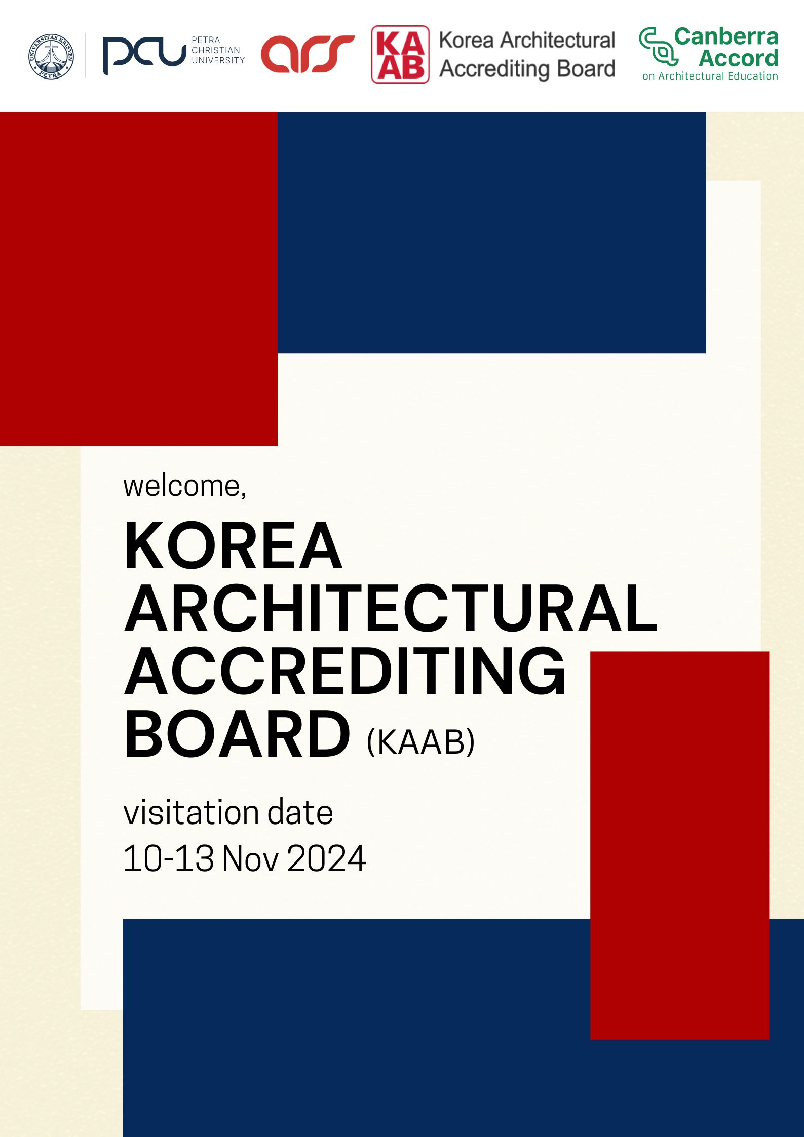 Pada tanggal 10-13 November 2024, dilakukan visitasi akreditasi untuk program studi Teknik Arsitektur Universitas Kristen Petra Surabaya. Penilaian ini dilakukan oleh Korea Architectural Accrediting Board (KAAB).