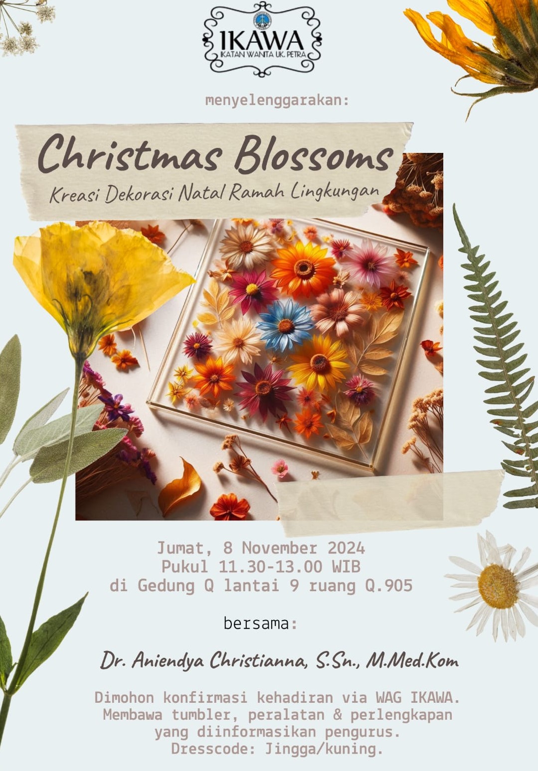 Pertemuan ikatan wanita (IKAWA) UK Petra Surabaya, kembali diadakan pada tanggal 08 November 2024 jam 11.30 - 13.00 WIB, bertempat di ruang Q.903 gedung Q lantai 9 UK Petra. Pada pertemuan ini mengangkat tema Christmas blossoms kreasi dekorasi Natal ramah lingkungan dengan narasumber ibu Dr. Aniendya Christianna
