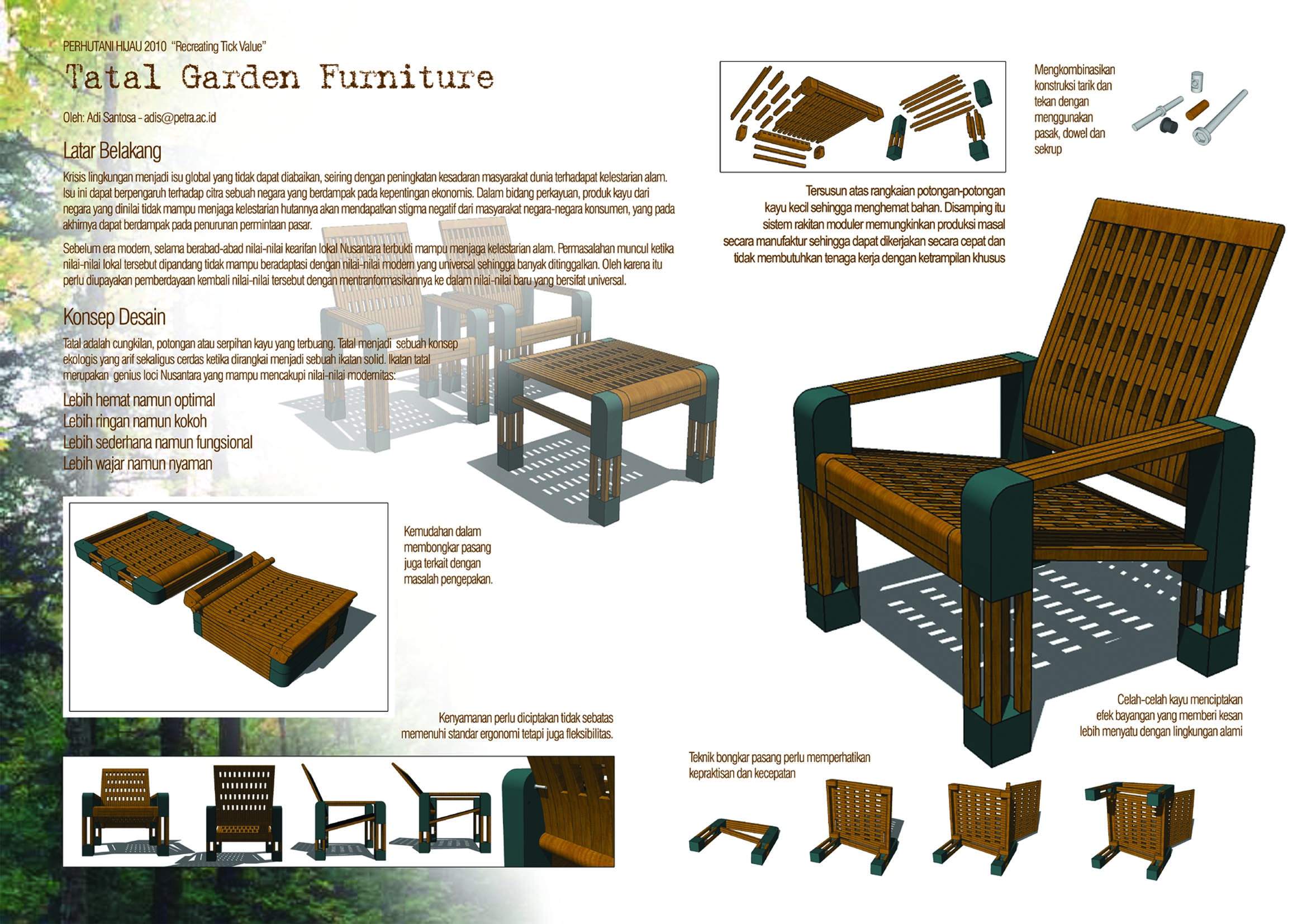 furniture ini adalah karena salah satunya memanfaatkan limbah kayu. Di samping itu lebih hemat namun optimal, lebih ringan namun kokoh, lebih sederhana namun fungsional dan lebih wajar namun nyaman.