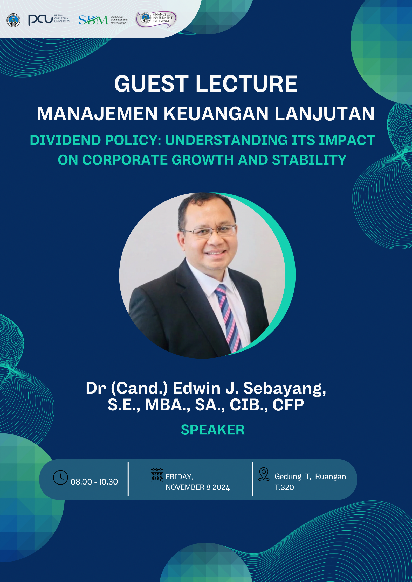 Kegiatan ini adalah kuliah tamu untuk mata kuliah Manajemen Keuangan Lanjutan dengan topik "Dividend Policy: Understanding Its Impact On Corporate Growth and Stability" dengan pembicara Dr (Cand.) Edwin J. Sebayang, S.E., MBA., SA., CIB., CFP. Acara ini diselenggarakan pada Jumat, 08 November 2024.