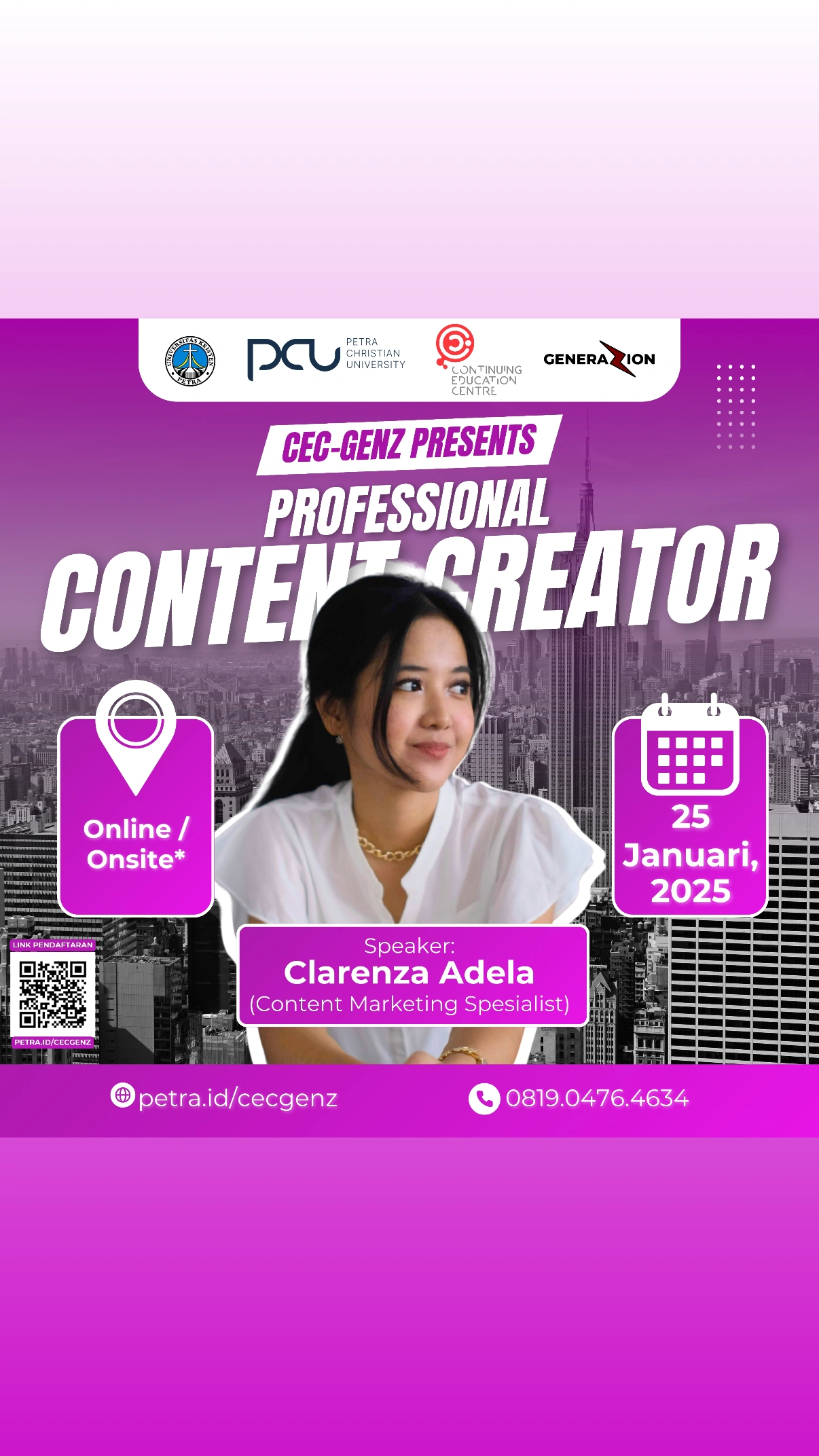 Pusat Pengembangan Pembelajaran Universitas Kristen Petra Surabaya pada tanggal 25 Januari 2025 Mengadakan acara workshop dengan tema Professional content creator, dengan narasumber Clarenza Adela.