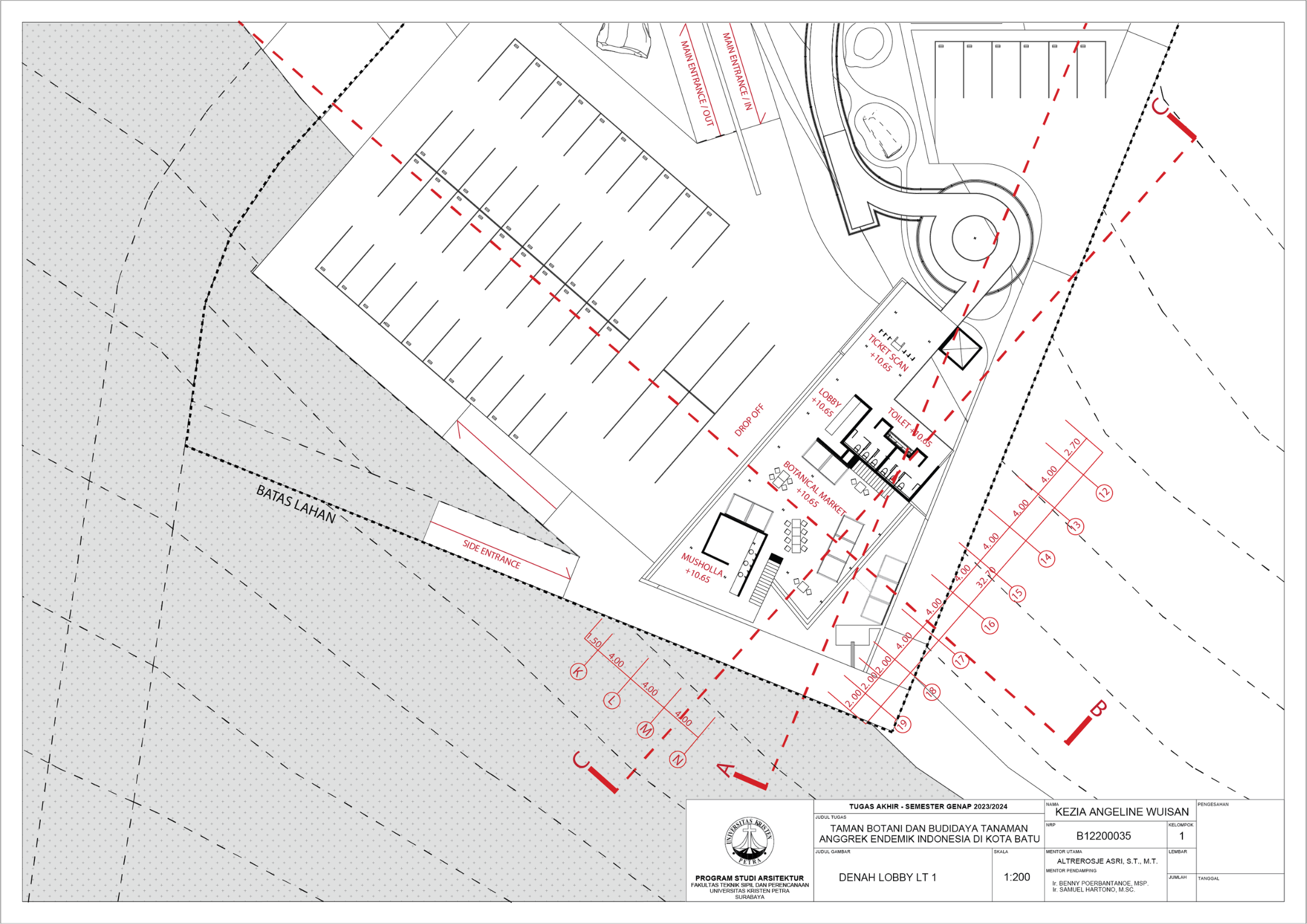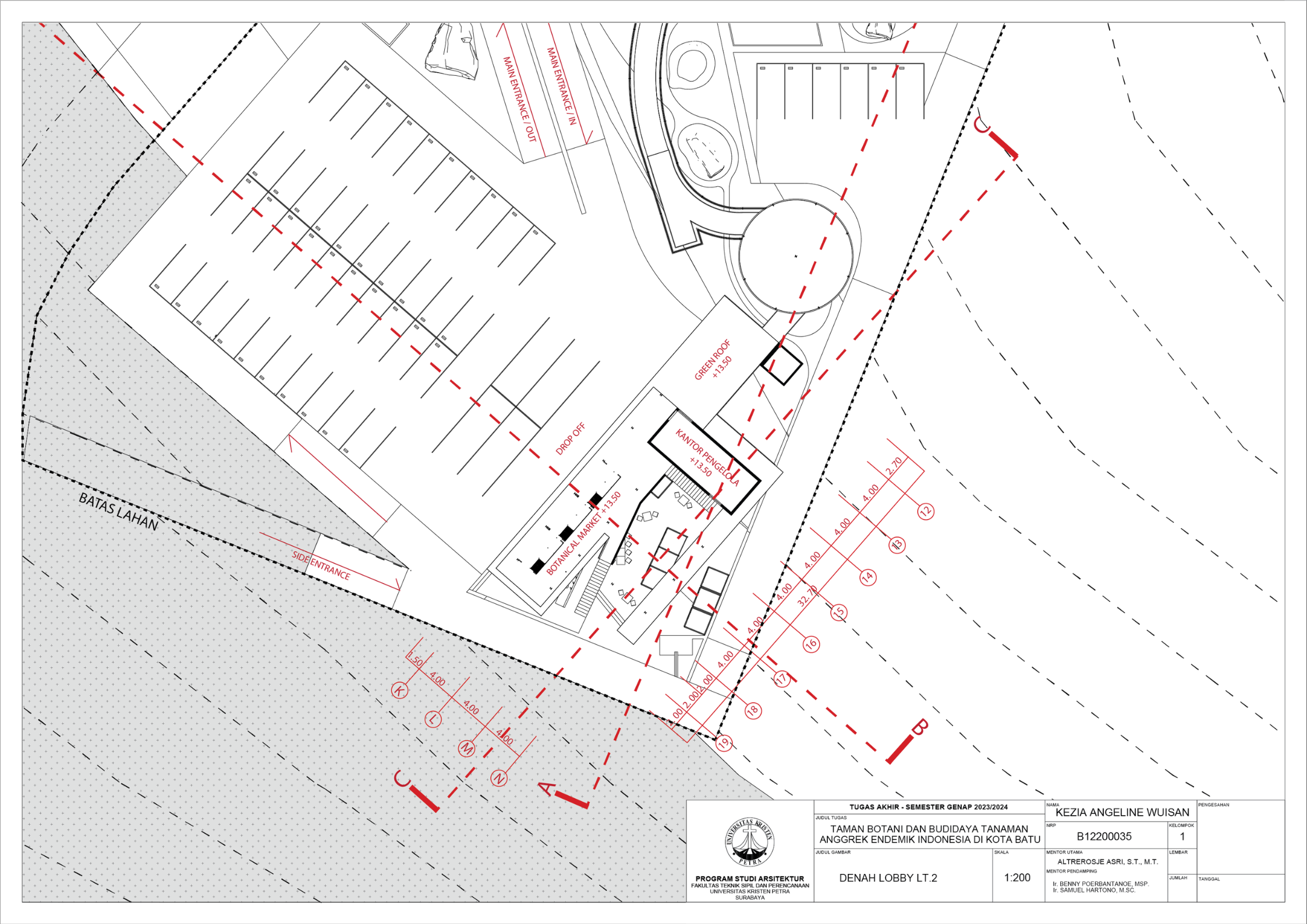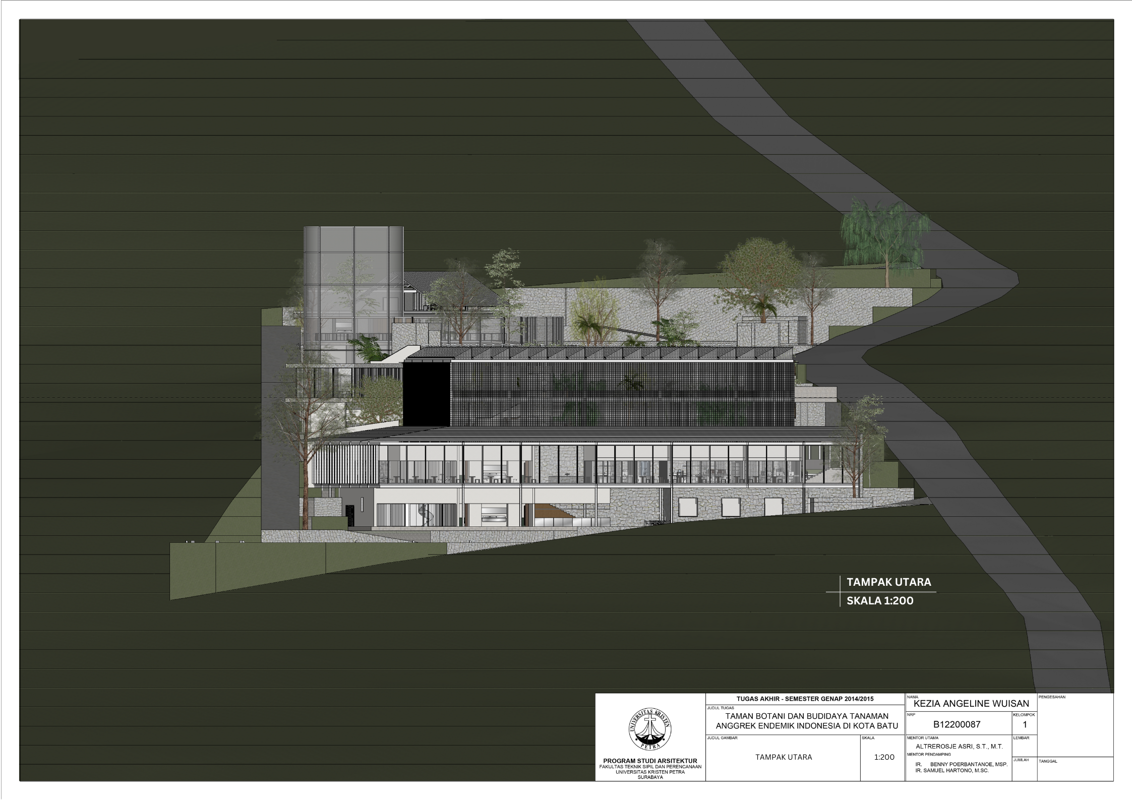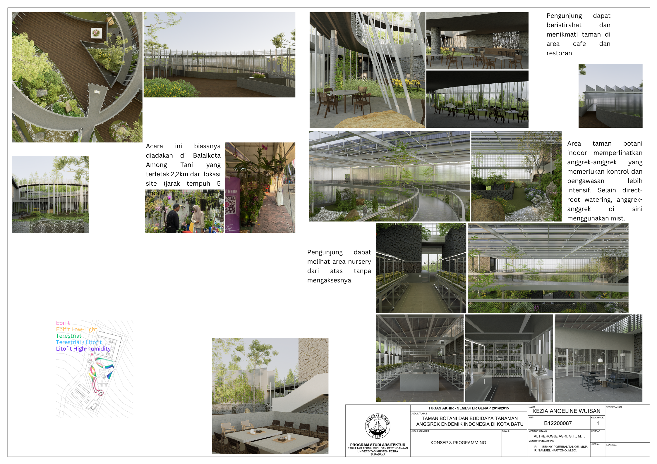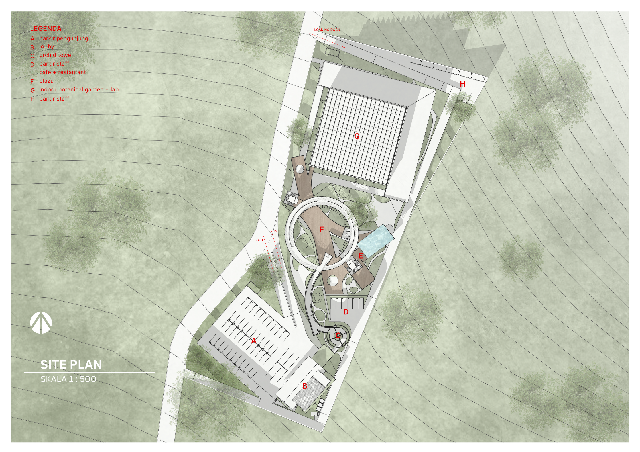 Keindahan anggrek Indonesia telah memukau dunia. Namun, ancaman terhadap habitatnya membuat keberadaan spesies-spesies anggrek semakin rentan. Sebagai upaya pelestarian, sebuah taman botani dan konservasi anggrek dirancang khusus di Kota Batu. Fasilitas ini tidak hanya menjadi pusat penelitian dan budidaya anggrek, tetapi juga destinasi wisata edukatif yang menarik. Desain bangunan mengadopsi konsep keberlanjutan, menyatu dengan alam sekitar melalui sistem pencahayaan alami. Pengunjung diajak menjelajahi berbagai jenis anggrek. Setiap sudut taman dirancang untuk memberikan pengalaman estetika dan edukasi yang mendalam, mulai dari rumah kaca dengan koleksi anggrek yang melimpah hingga taman terbuka yang asri. Dengan pendekatan arsitektur berpori, bangunan menciptakan ruang yang dinamis dan menyatu dengan alam. Taman botani ini bukan hanya menjadi tempat pelestarian anggrek, tetapi juga pusat edukasi bagi masyarakat, terutama generasi muda. Dengan harapan, kesadaran akan pentingnya menjaga keanekaragaman hayati akan semakin meningkat. Selain itu, fasilitas ini juga berpotensi menjadi daya tarik wisata baru di Kota Batu, sehingga berkontribusi pada perekonomian lokal. Kata Kunci : Anggrek Endemik Indonesia, Budidaya, Edukasi, Arsitektur Berpori, Taman Botani