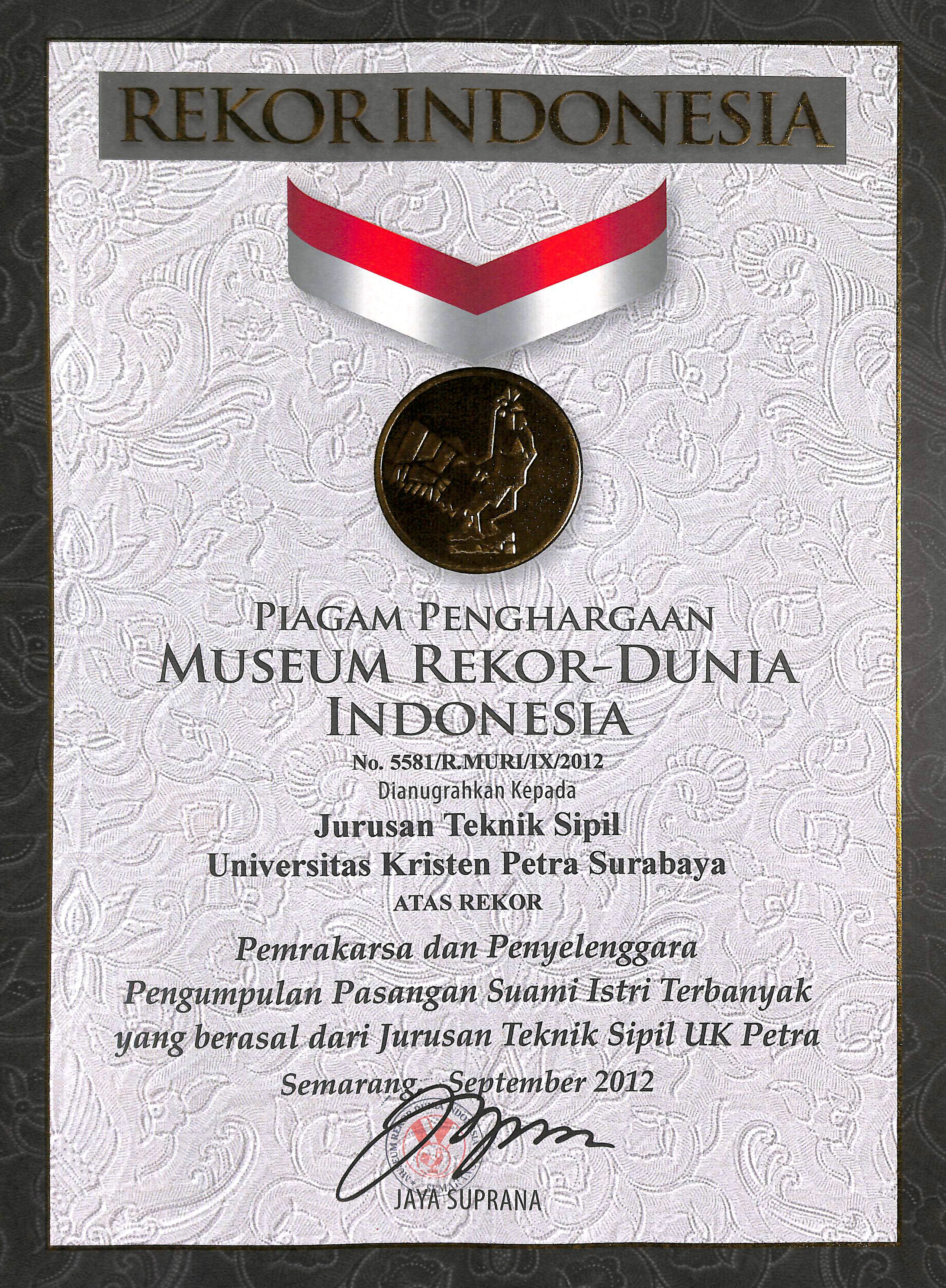 Penyerahan piagam penghargaan Museum Rekor Indonesia (MURI) kepada Jurusan Teknik Sipil Universitas Kristen Petra atas rekor "Pemrakarsa Pasangan Suami Istri Terbanyak yang Berasal dari Jurusan Teknik Sipil UK Petra" pada acara Civil Golden Jubilee 2012" 15 September 2012 di Kampus UK Petra. Penghargaan diterima oleh Ketua Jurusan Teknik Sipil Dr. Daniel Tjandra, S.T., M.Eng.
