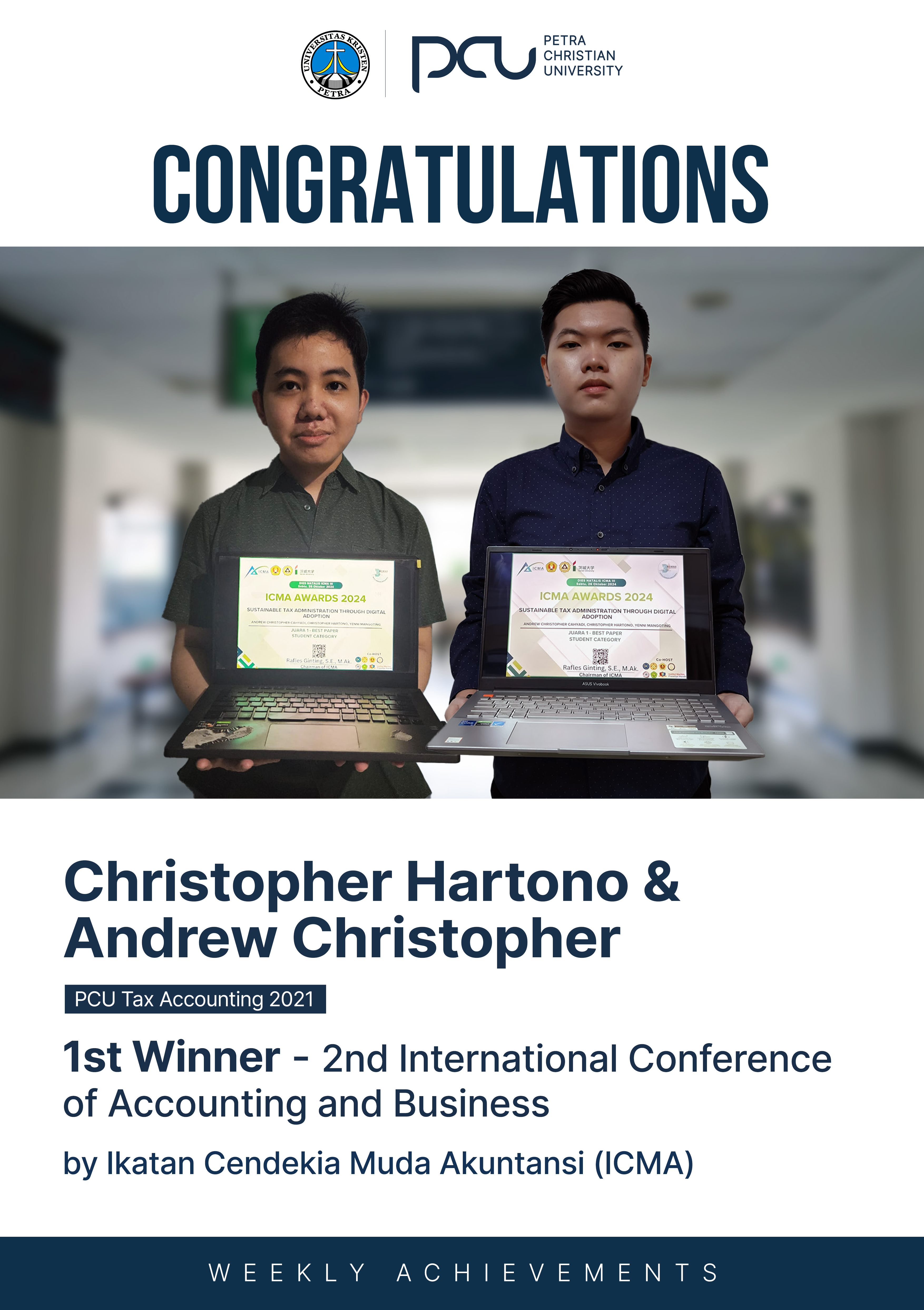 Selamat atas prestasi yang diraih oleh Christopher Hartono dan Andrew Christopher sebagai 1st Winner dalam 2nd International of Accounting and Business by Ikatan Cendekia Muda Akuntansi (ICMA)