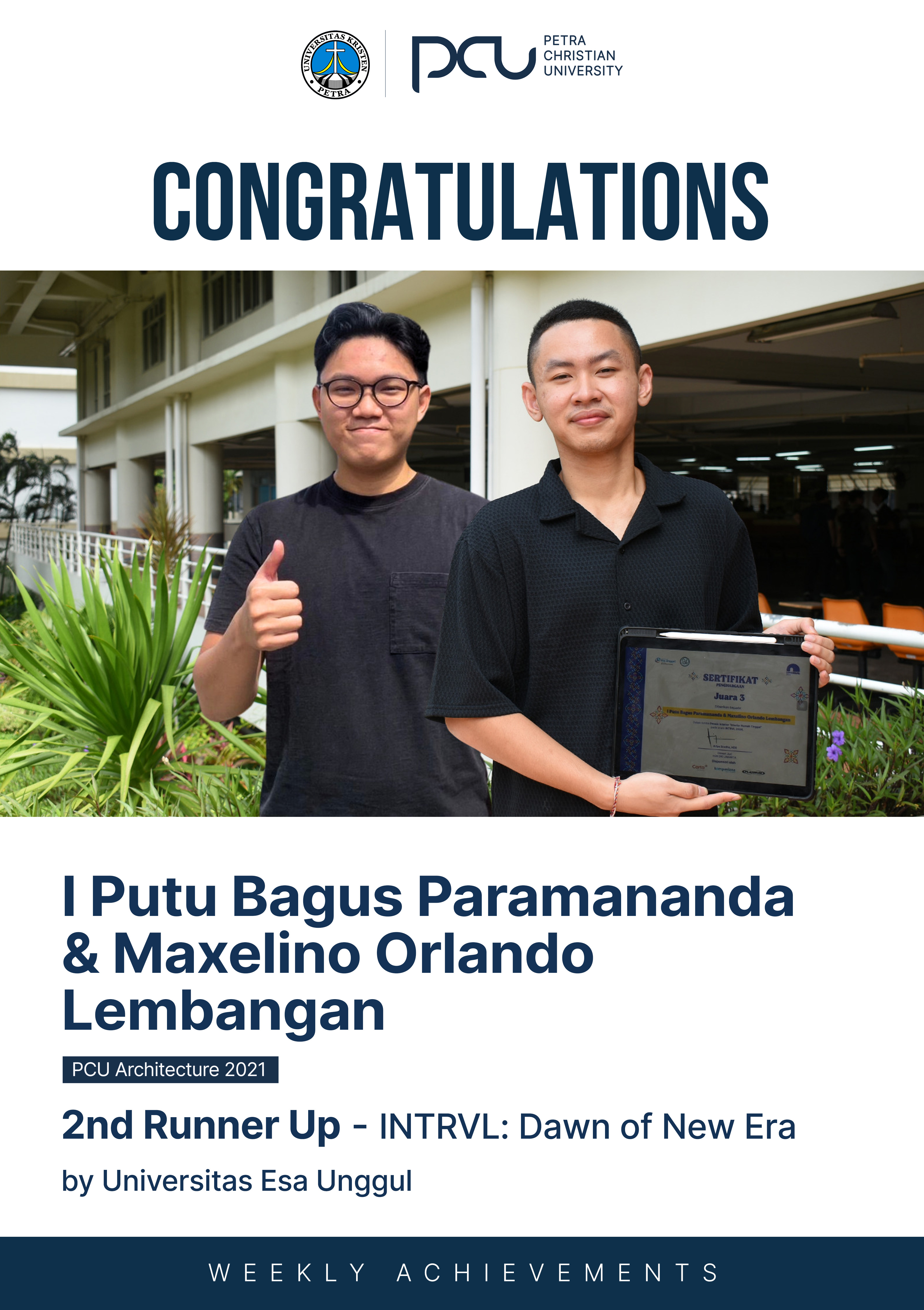 Selamat atas prestasi yang diraih oleh I Putu Bagus Paramananda dan Maxelino Orlando Lembangan sebagai 2nd Runner Up dalam INTRV L: dawn of new era by Universitas Esa Unggul