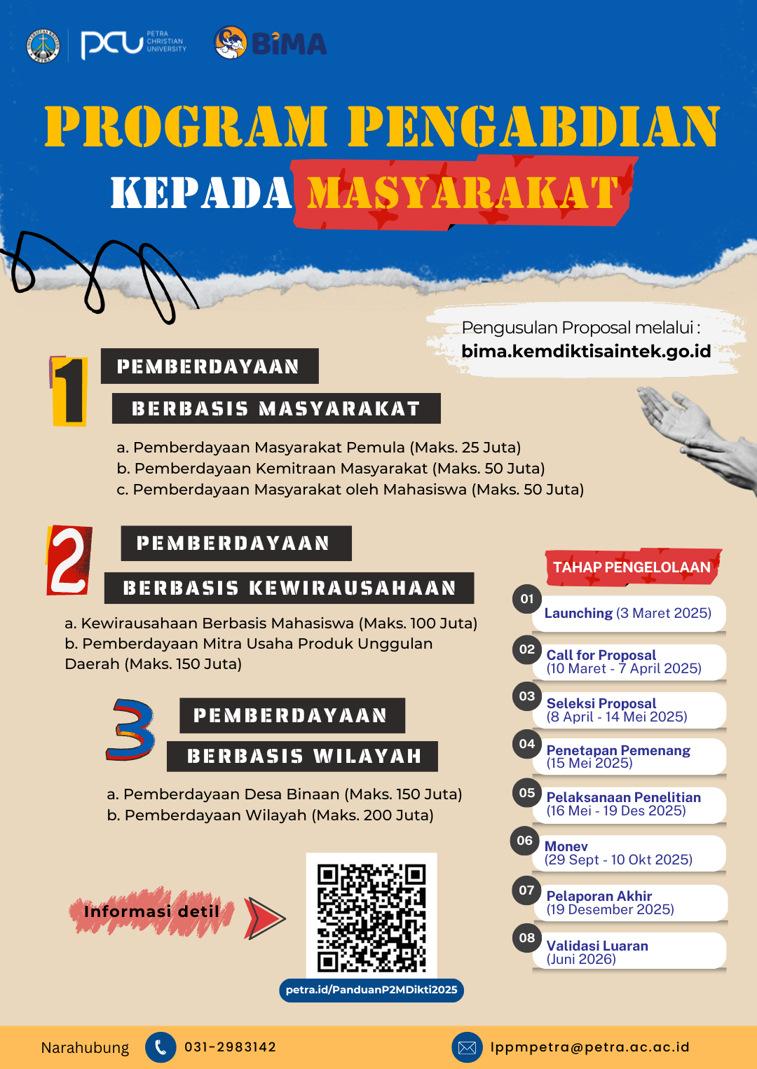 Kementerian Pendidikan Tinggi, Sains, dan Teknologi (Kemdiktisaintek) melalui Direktorat Penelitian dan Pengabdian kepada Masyarakat Direktorat Jenderal Riset dan Pengembangan secara resmi meluncurkan Program Penelitian dan Pengabdian kepada Masyarakat Tahun 2025. Program pendanaan kompetitif ini akan dibuka mulai 10 Maret hingga 14 April 2025. Pengusulan proposal dilakukan melalui platform Basis Informasi Penelitian dan Pengabdian kepada Masyarakat (BIMA).