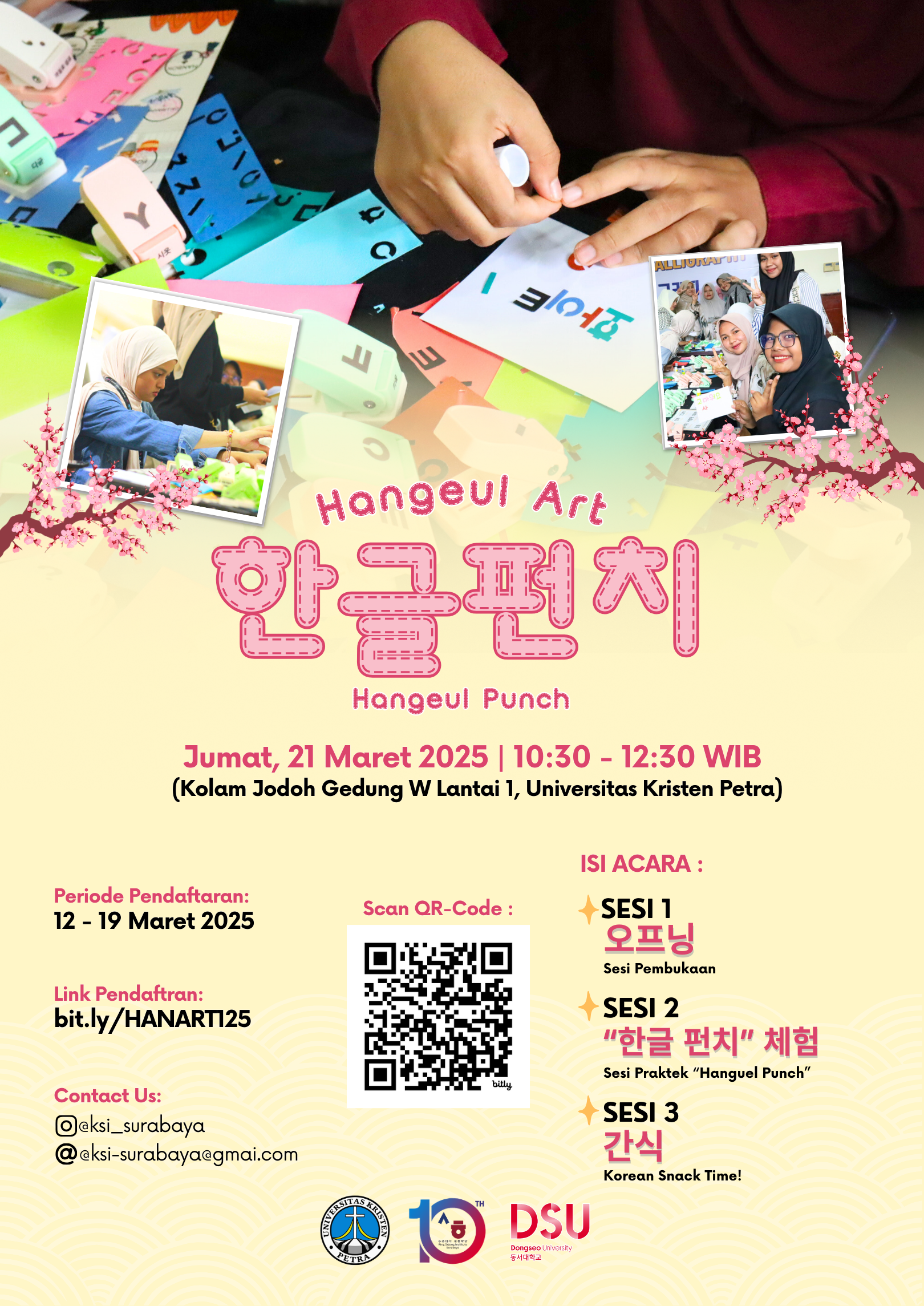 한글 미술 (한글 펀지 ) / Hanguel Art (Hangeul Punch) merupakan bagian dari acara Budaya KSI Surabaya. Dalam acara yang berdurasi 2 jam ini, KSI Surabaya akan mempromosikan acara yang akan maupun yang sedang berlangsung. Tidak hanya itu, KSI Surabaya juga menghadirkan sesi Hangeul Punch sebagai ajang pengenalan dan pengalaman baru tentang Budaya Korea kepada murid KSI Surabaya dan seluruh civitas Univeristas Kristen Petra. Acara ini akan dilaksanakan pada Jumat, 21 Maret 2025 bertempat di Atrium gedung W (kolam Jodoh)