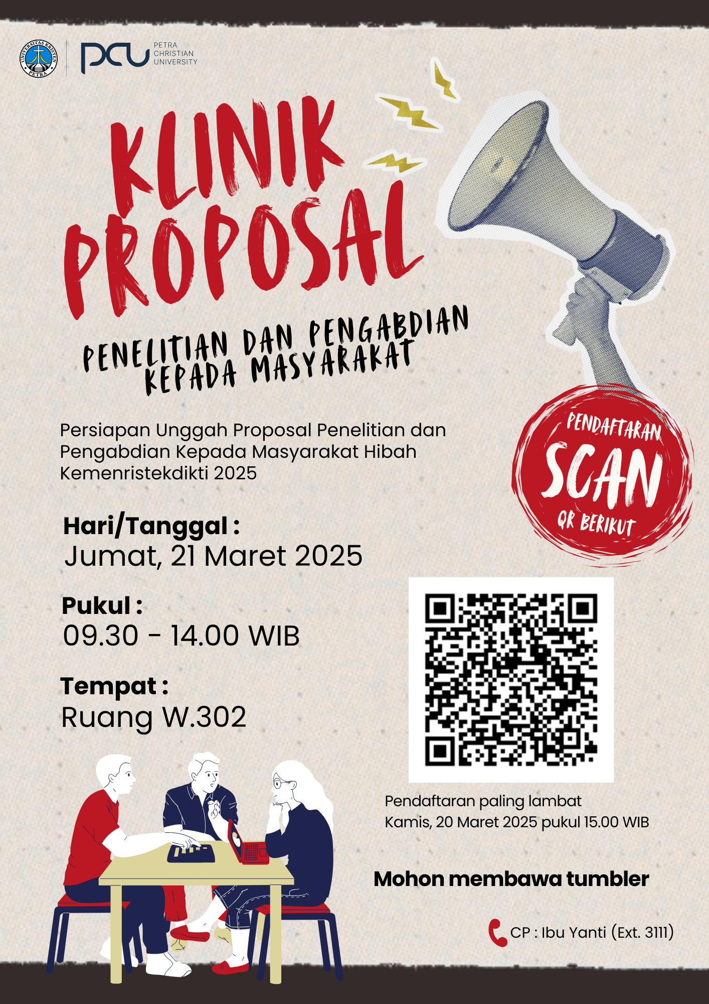 Sebagai wadah penelitian dan pengabdian masyarakat di lingkungan Universitas Kristen Petra Surabaya, Lembaga Penelitian dan Pengabdian Masyarakat mengadakan pelatihan tentang pembuatan proposal penelitian. Klinik proposal ini akan diselenggarakan pada Jumat, 21 Agustus 2025 jam 09.30 - 14.00WIB bertempat di gedung W.302.