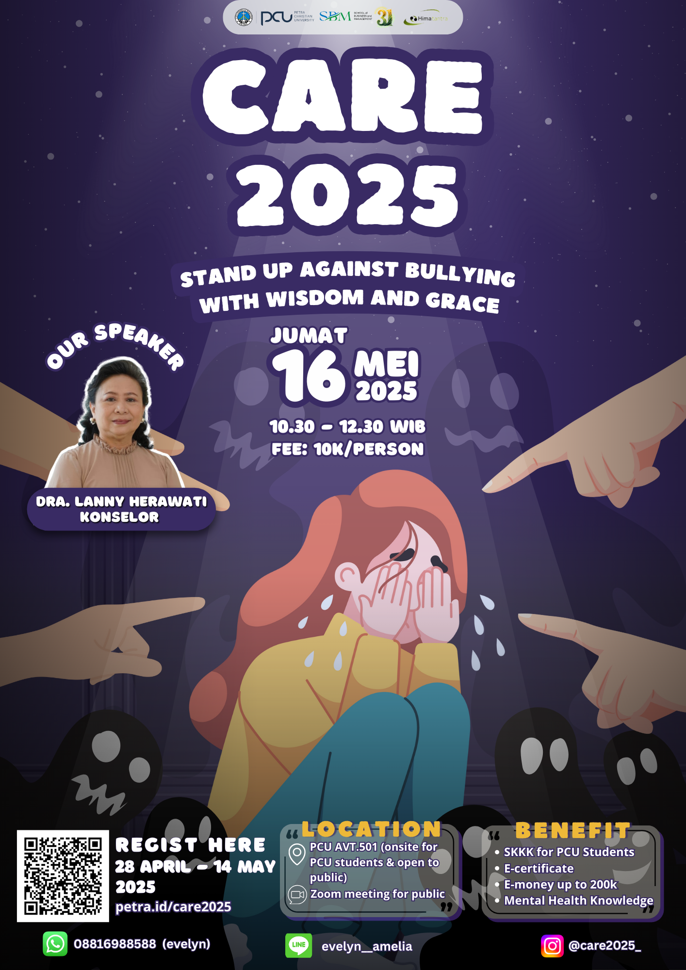 Program Akuntansi Bisnis Universitas Kristen Petra Surabaya pada Jumat, 16 Mei 2025 mengadakan acara Character and relationship enhancement 2025. Dengan Narasumber Dra. Lanny Herawati. Di dunia yang penuh tantangan, bullying menjadi salah satu isu yang perlu ditangani dengan bijak. Character and Relationship Enhancement 2025 hadir untuk membekali peserta dengan keterampilan mengelola emosi, membangun ketahanan mental, dan menghadapi tindakan atau perkataan kasar dengan penuh kebijaksanaan. Melalui sesi interaktif, video studi kasus, diskusi, minigames, dan QnA, acara ini akan membantu peserta mengembangkan karakter kuat dan sehat dalam menghadapi bullying. Acara akan diadakan secara hybrid, terbuka untuk mahasiswa Universitas Kristen Petra dan peserta dari seluruh Indonesia.