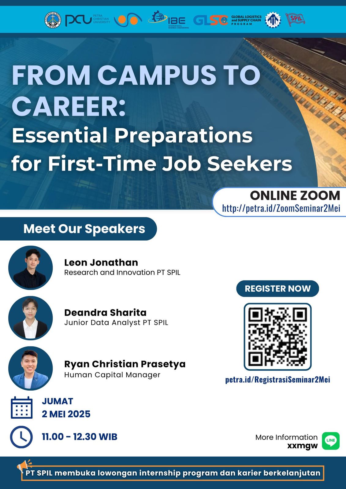 Melalui online Zoom PT. SPIL membuka kesempatan bagi mahasiswa UK Petra untuk mendapatkan beasiswa dan pekerjaan tetap di PT. SPIL. Kegiatan ini akan diselenggarakan pada Jumat, 02 Mei 2025 jam 11.0-12.30 WIB.