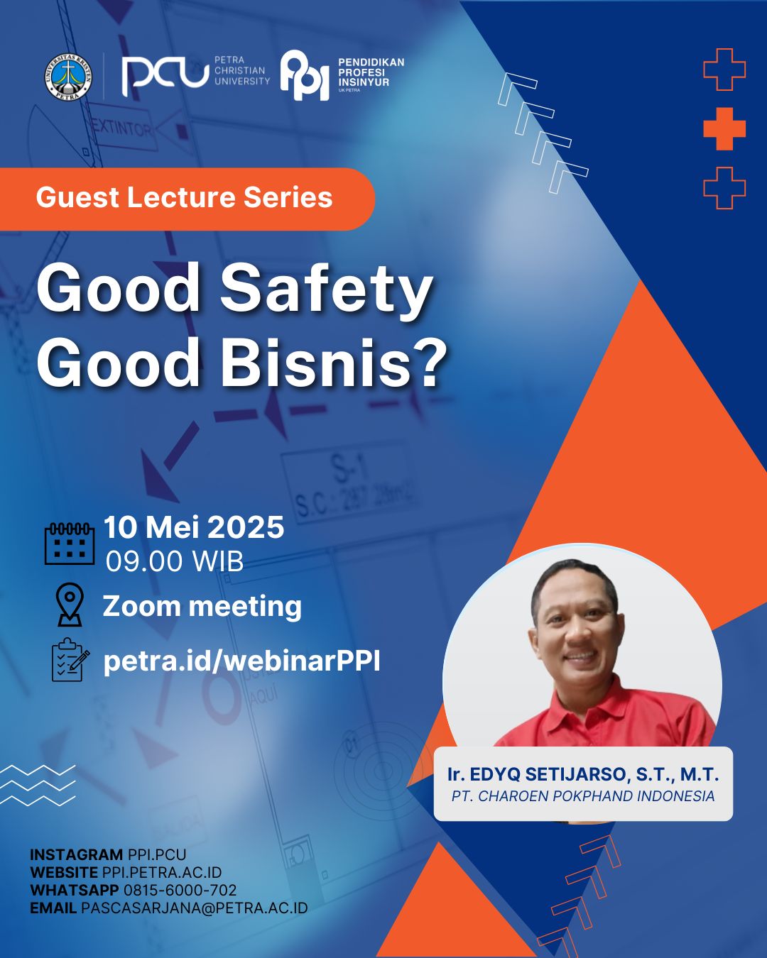 Program Pendidikan Profesi Keinsinyuran Universitas Kristen Petra Surabaya Pada Tanggal 10 Mei 2025, jam 09.00 WIB mengadakan acara Guest Lecture Series "Good Safety = Good Bisnis". Bersama: Ir. Edyq Setijarso, S.T., M.T.(PT. Charoen Pokphand Indonesia) Via: Zoom MeetingLink: petra.id/webinarPPI. Terbuka untuk umum!Jangan lewatkan kesempatan menambah wawasan tentang pentingnya keselamatan kerja dalam dunia bisnis!