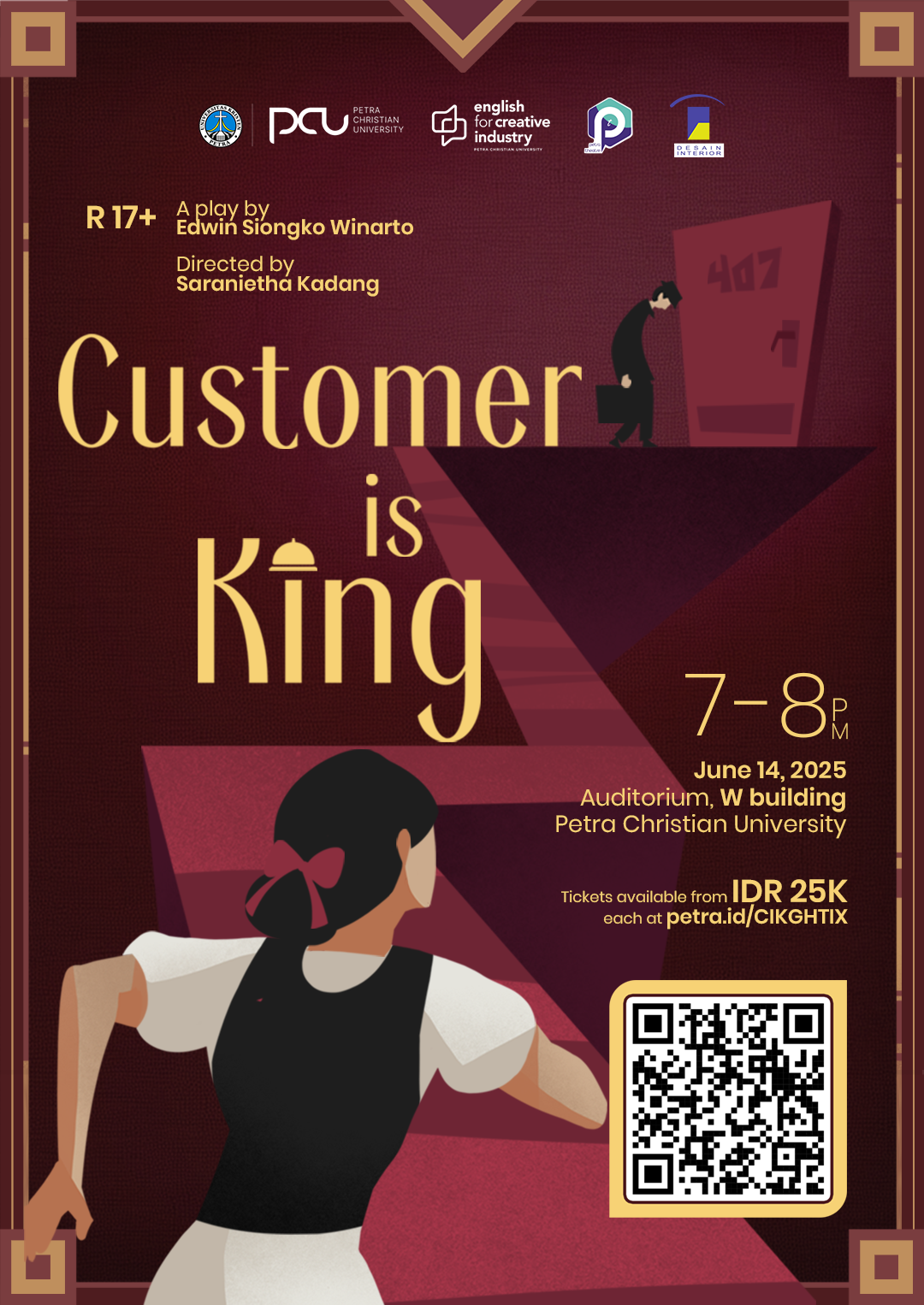 Program English for Creative Industry Universitas Kristen Petra mengadakan pagelaran 2 plays dengan judul Customer Is King. Pada tanggal 14 Juni 2025 jam 19.00 - 20.00 WIB bertempat di Auditorium Kampus Pusat. Customer is King menyindir kapitalisme, industri jasa, dan manusia yang makin apatis lewat kisah seorang resepsionis part-timer dengan tamu hotel yang depresi dan tidak biasa.