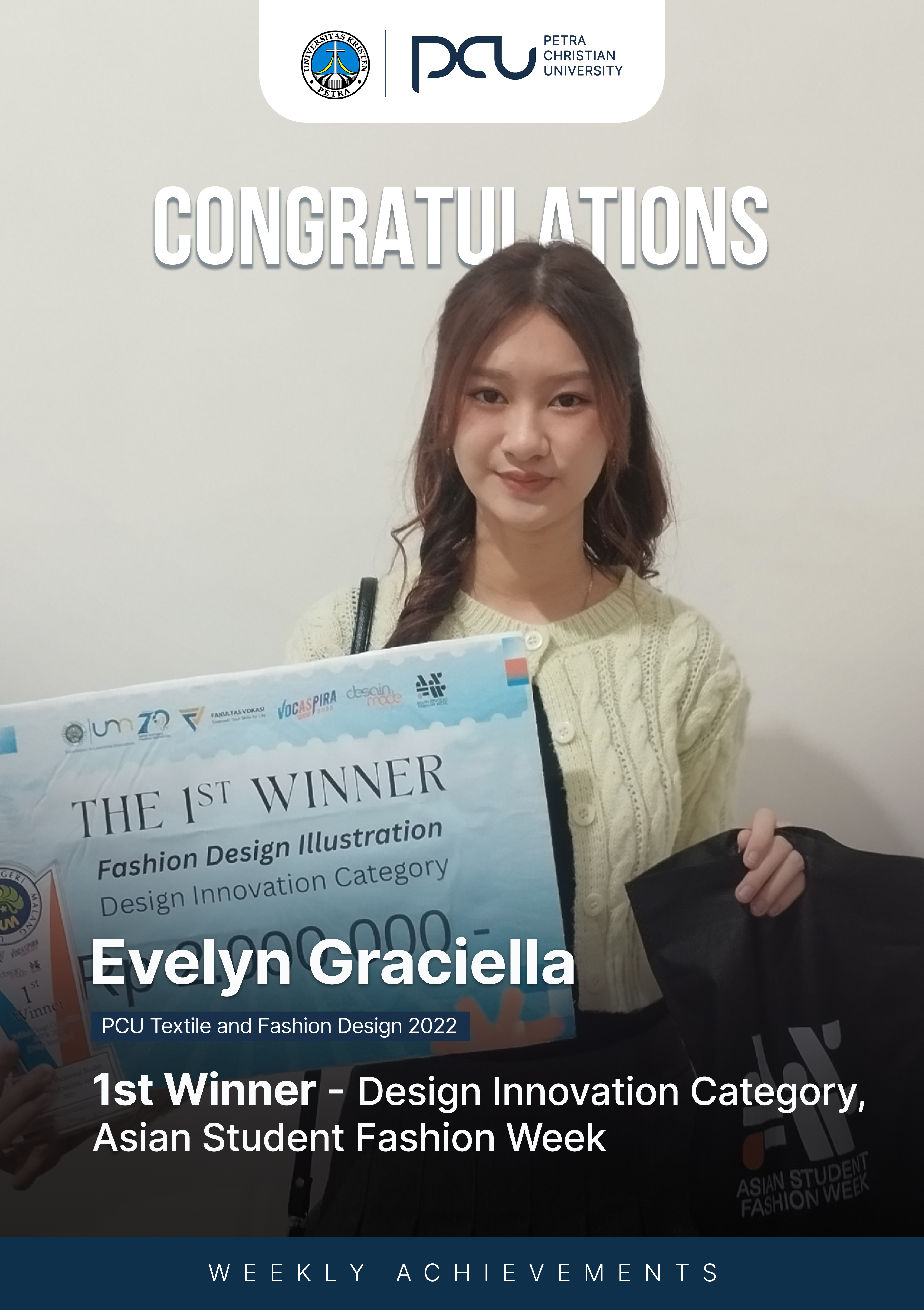 Selamat atas prestasi yang diraih oleh Evelyn Graciella sebagai 1st winner dalam Design Innovation Category, Asian Student Fashion Week.