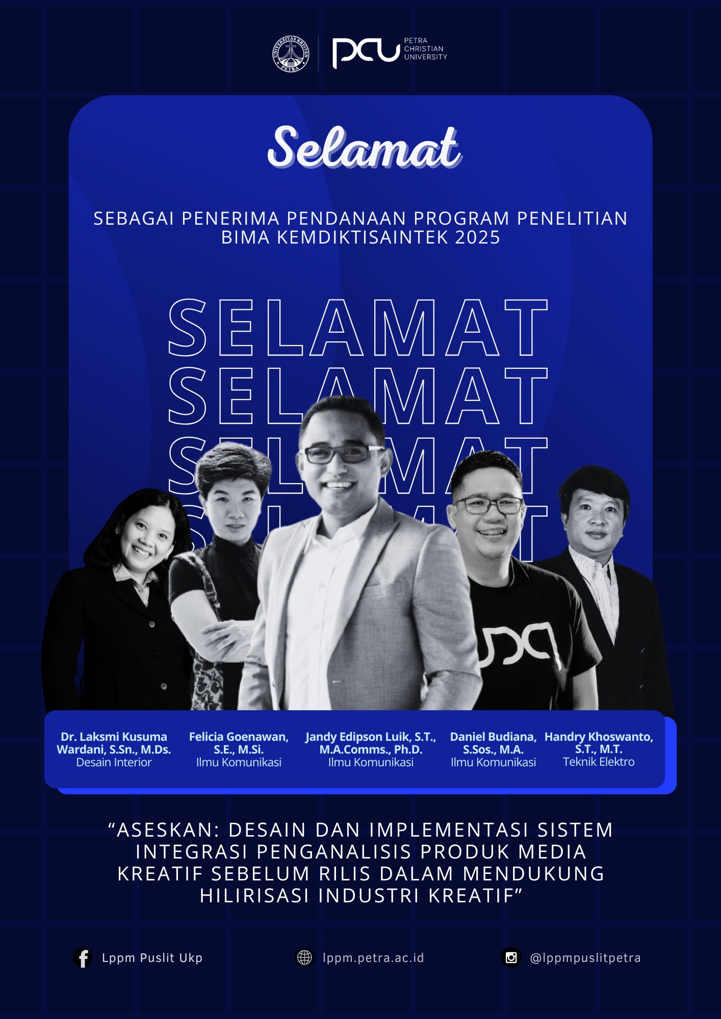 Selamat atas prestasi yang diraih oleh Dr. Laksmi Kusuma Wardani, Felicia Goenawan M.Si., Jandy Edipson Luik Ph.D., Handry Khoswanto M.T.