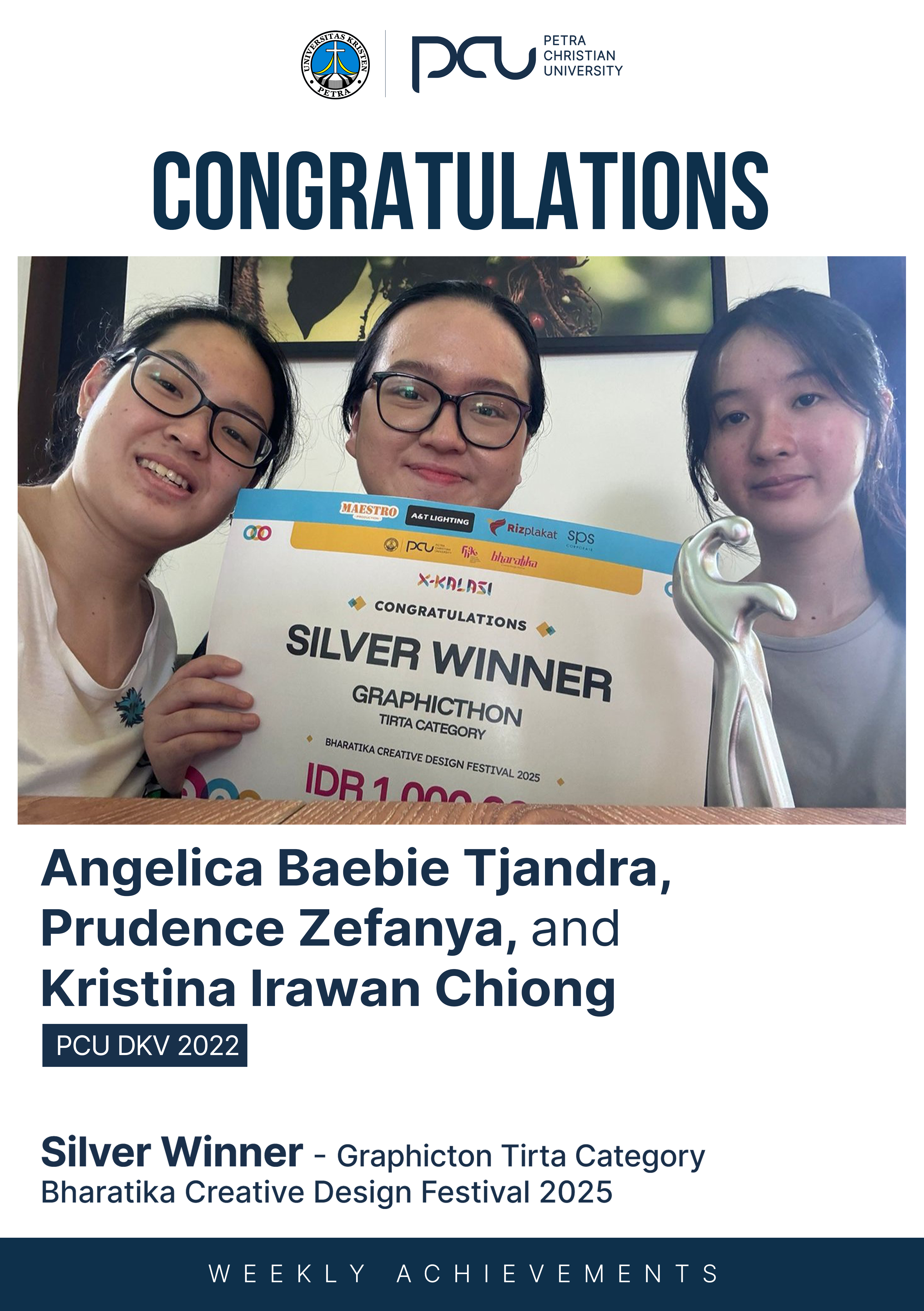 Selamat atas prestasi yang diraih oleh Angelica Baebie Tjandra, Prudence Zefanya dan Kristina Irawan Chiong sebagai Silver Winner dalam Graphicton Tirta Category Bharatika Creative Design Festival 2025