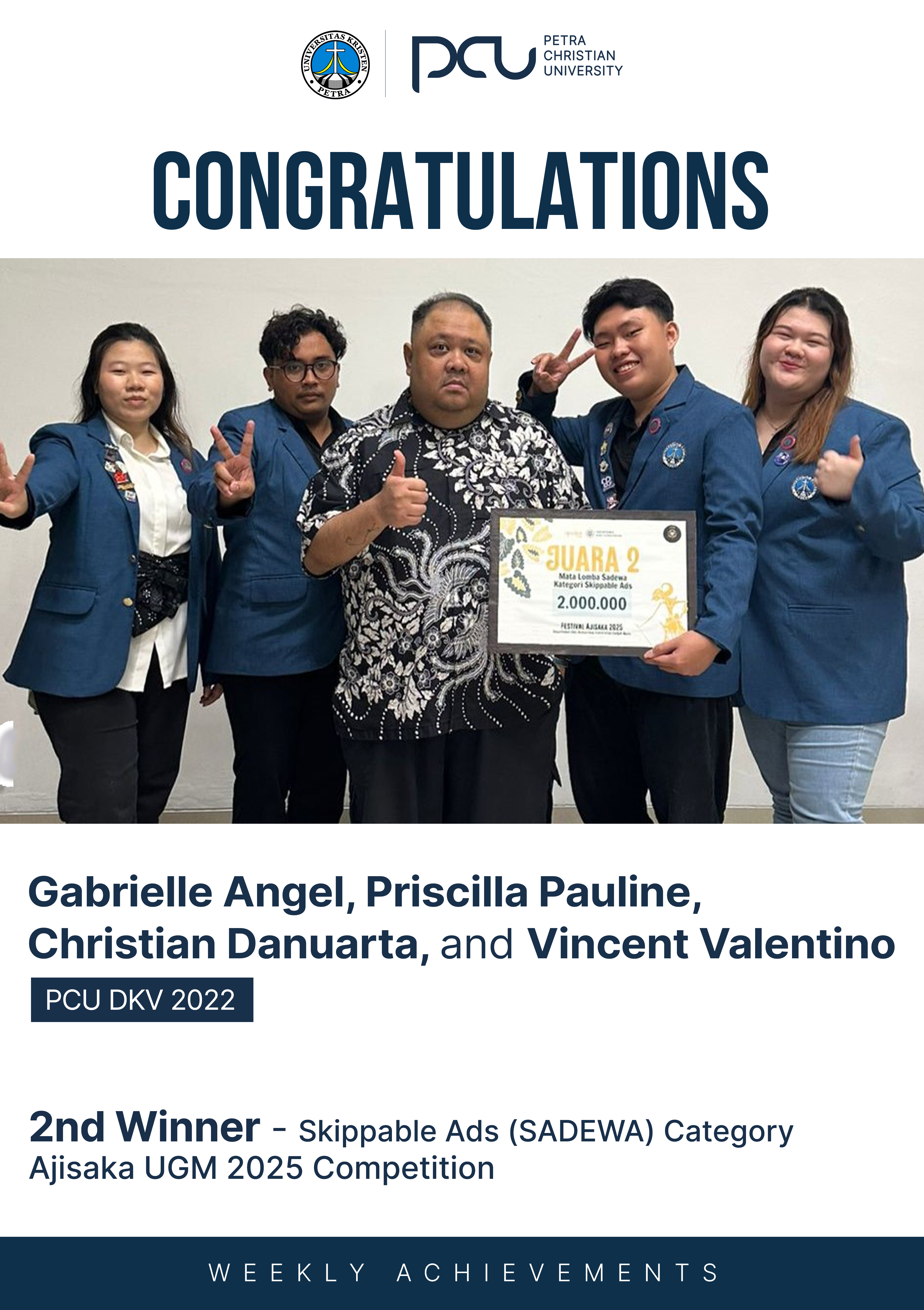 Selamat atas prestasi yang diraih oleh Gabrielle Angel, Priscilla Pauline, Christian Danuarta, Vincent Valentino sebagai 2nd Winner dalam Skippable Ads (SADEWA) Category Ajisaka UGM 2025 Competition.