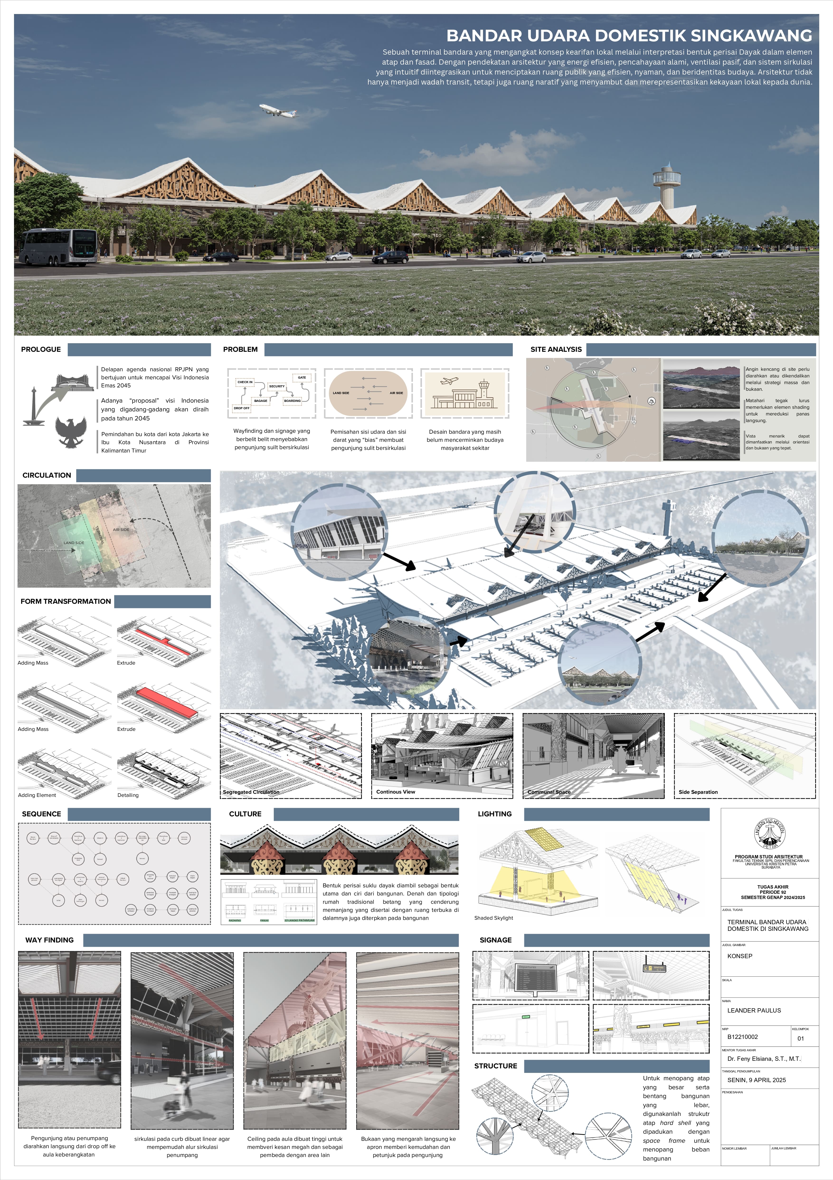 Kota Singkawang merupakan sebuah kota di Provinsi Kalimantan Barat dan merupakan sebuah kota yang kaya akan keberagaman dan budaya. Dari keragaman itu, sektor pariwisata di Kota Singkawang sebenarnya memiliki potensi yang besar untuk menjadi sebuah kota pariwisata. Oleh karena itu, keberadaan bandara menjadi sangat dibutuhkan sebagai sarana transportasi utama yang mampu mendukung mobilitas masyarakat, mempermudah akses wisatawan, serta mempercepat distribusi barang dan jasa menuju kota ini. Untuk menjawab hal tersebut, terminal bandara dipilih sebagai jawaban dari permasalahan yang timbul. Fungsi dari terminal dan bandara yang menjawab sulitnya akses transportasi pada kota Singkawang. Pendekatan sistem juga dipilih agar fungsi dan aktivitas penumpang dari terminal bandara tetap berjalan dengan optimal dan efisien. Selain itu, desain dari terminal sendiri juga banyak mengangkat unsur-unsur budaya lokal di sekitarnya. Terlebih Kota Singkawang merupakan kota yang kaya dengan budaya, baik yang bersifat tangible maupun yang bersifat intangible. Maka ada baiknya untuk mengangkat hal tersebut dalam desain agar bandara sendiri tidak hanya sebagai sebuah “terminal” saja, tetapi juga sebagai wajah dan impresi pertama yang akan dilihat oleh pengunjung atau penumpang saat pertama kali datang.