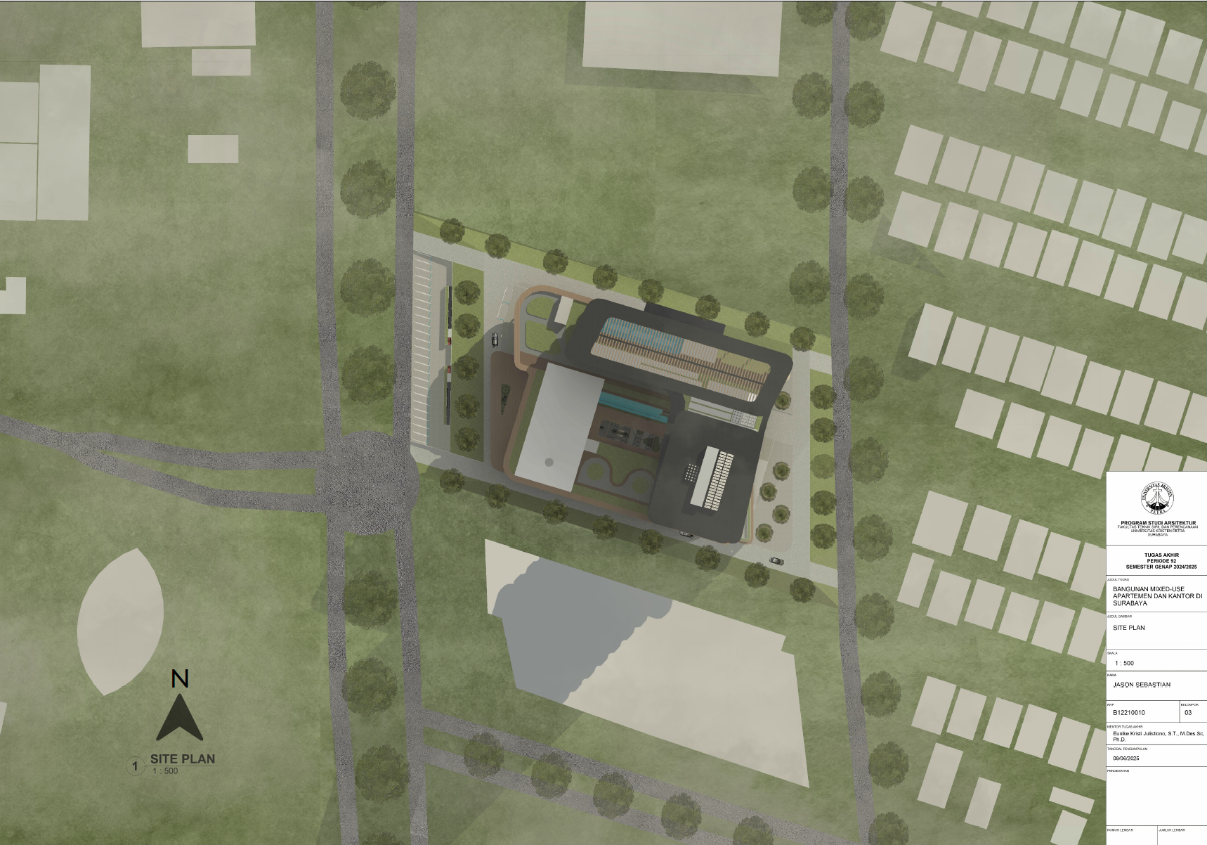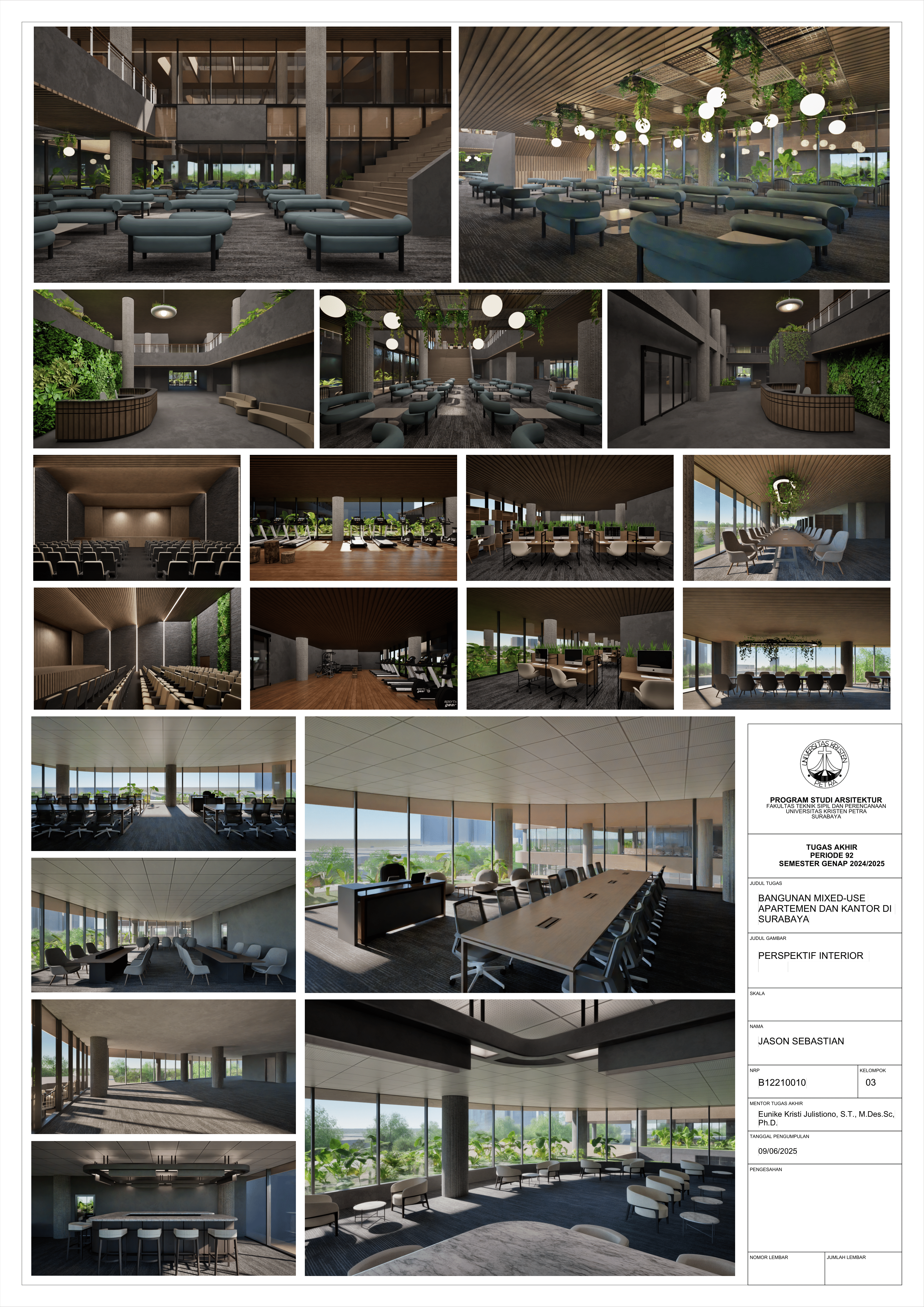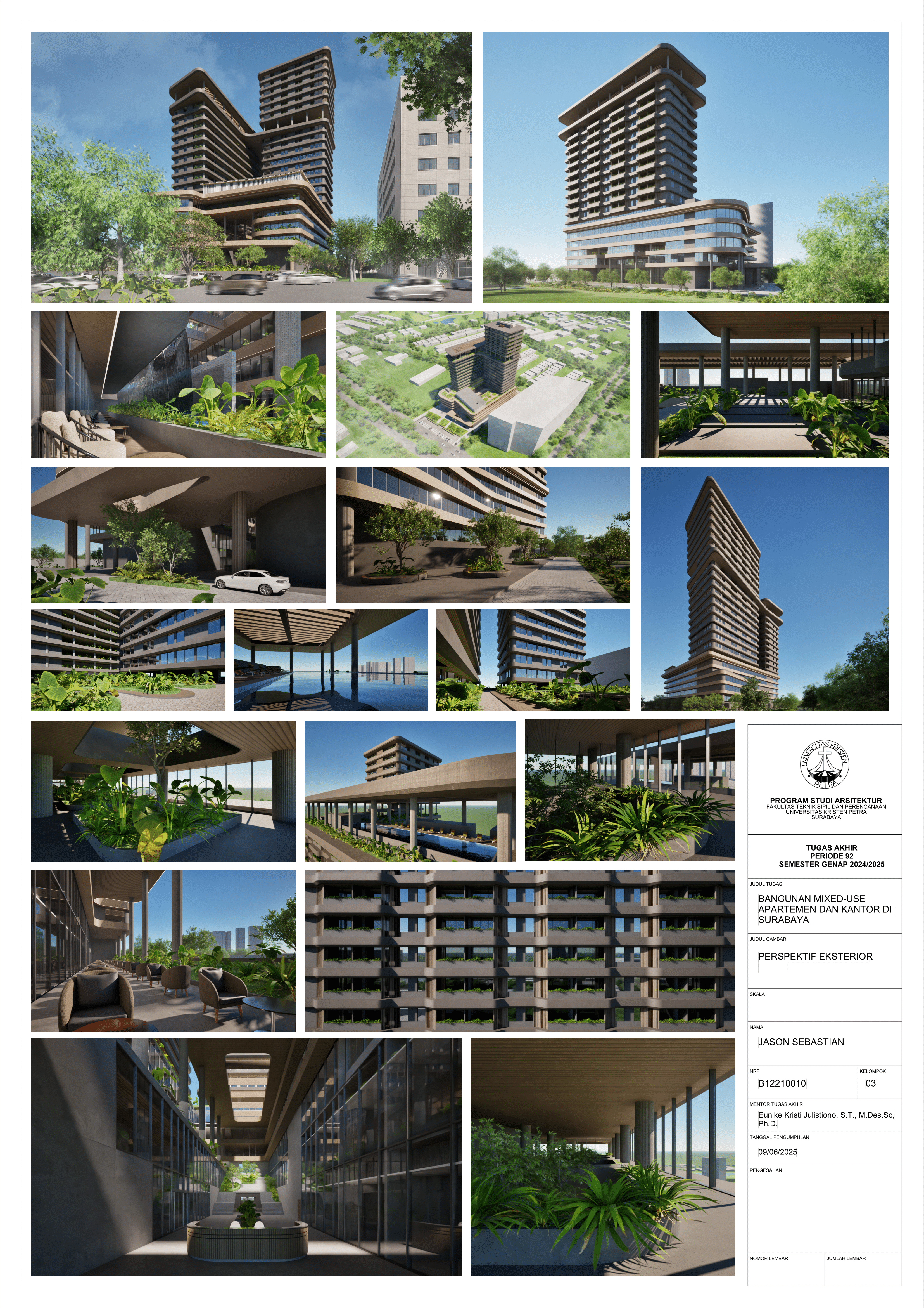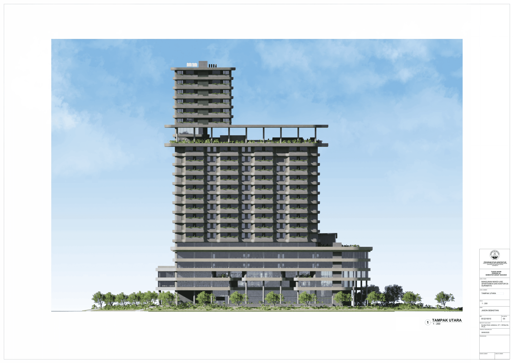 Pertumbuhan urbanisasi dan kebutuhan ruang di Surabaya mendorong pengembangan bangunan vertikal yang mampu mengintegrasikan fungsi hunian dan perkantoran dalam satu lokasi. Perancangan ini bertujuan untuk menghasilkan sebuah bangunan mixed-use yang menggabungkan apartemen dan kantor, dengan pendekatan berkelanjutan sesuai target net-zero emission carbon. Proyek ini mengakomodasi kebutuhan generasi milenial, pengusaha muda, dan pekerja kreatif untuk mengembangkan bisnis startup mereka dengan memaksimalkan efisiensi ruang, kemudahan akses, dan penerapan elemen biophilic untuk meningkatkan kualitas hidup pengguna. Metodologi perancangan melibatkan survei tapak, studi literatur, dan studi preseden untuk bisa menghasilkan desain yang menjawab permasalahan lingkungan saat ini. Bangunan dirancang untuk meminimalisir emisi karbon operasional melalui efisiensi energi, optimalisasi pencahayaan alami, dan penghawaan. Fasilitas yang dirancang meliputi apartemen, kantor sewa, coworking space, area hijau, dan fasilitas penunjang komersial. Perancangan ini juga memperhatikan Sustainable Development Goals (SDGs) terkait penghematan energi dan pertumbuhan ekonomi yang berkelanjutan. Hasil rancangan yang diharapkan adalah desain yang fungsional, fleksibel, dan ramah lingkungan, yang mampu memenuhi kebutuhan masyarakat urban dan memberikan kontribusi positif terhadap arsitektur berkelanjutan di Surabaya.