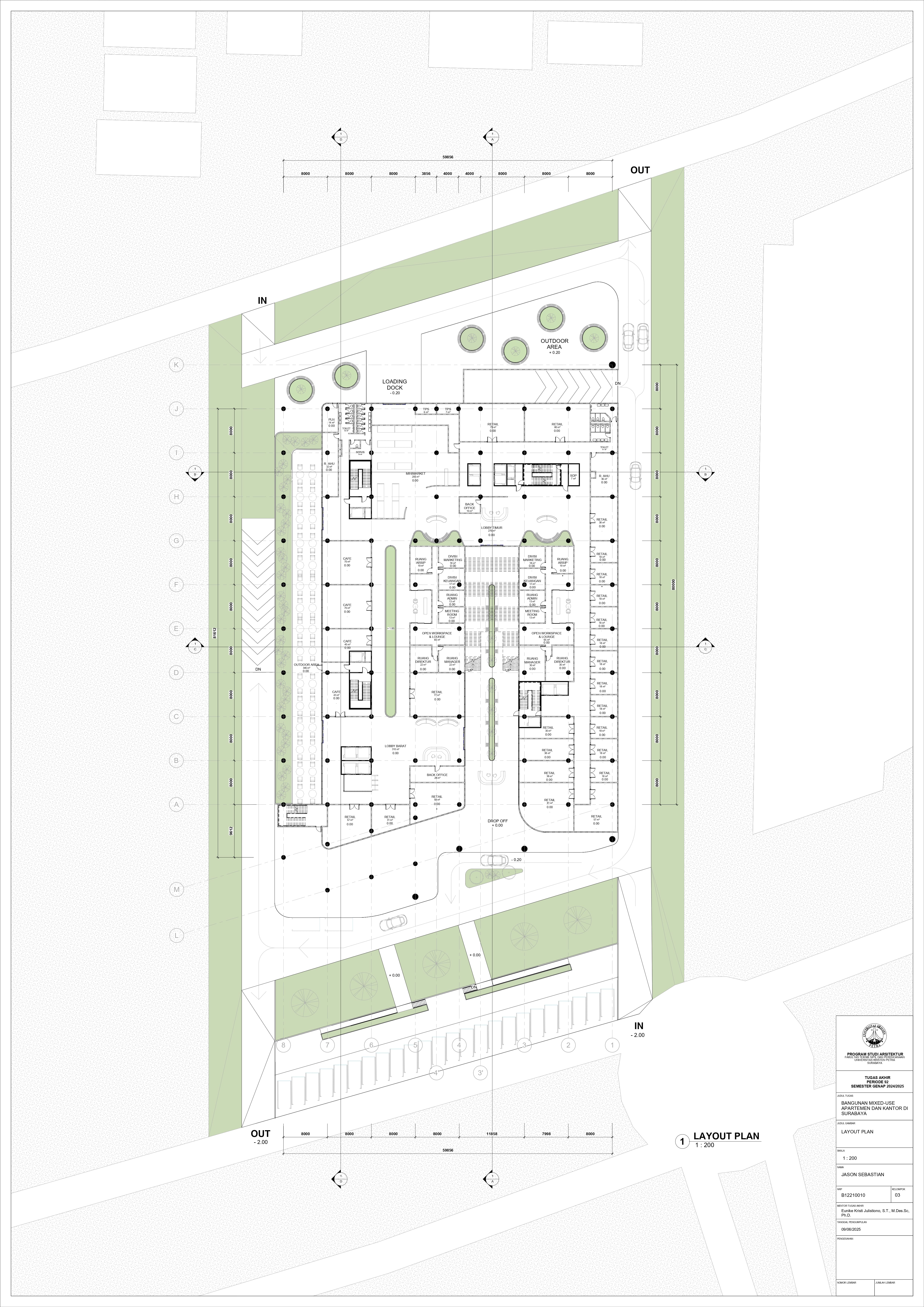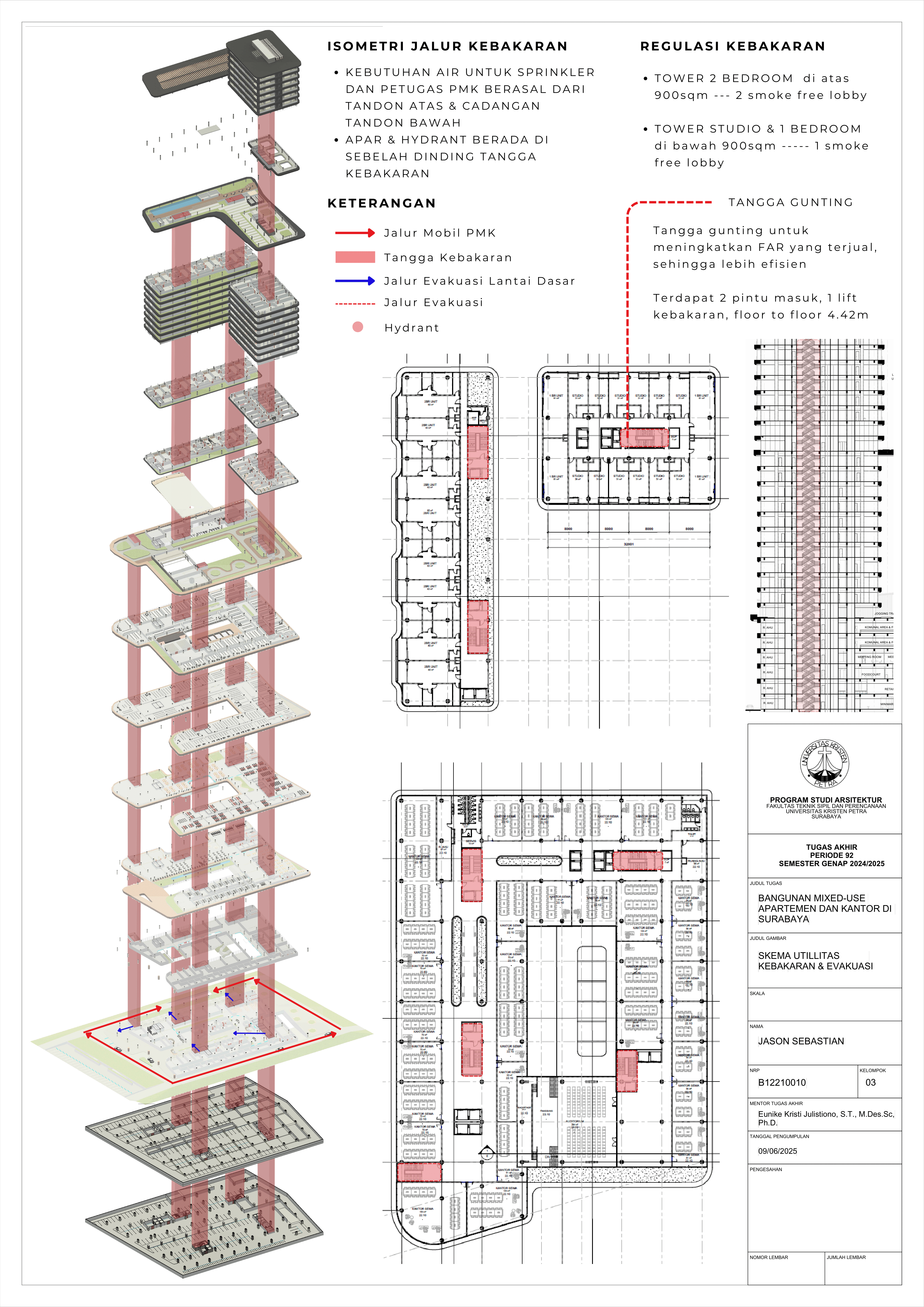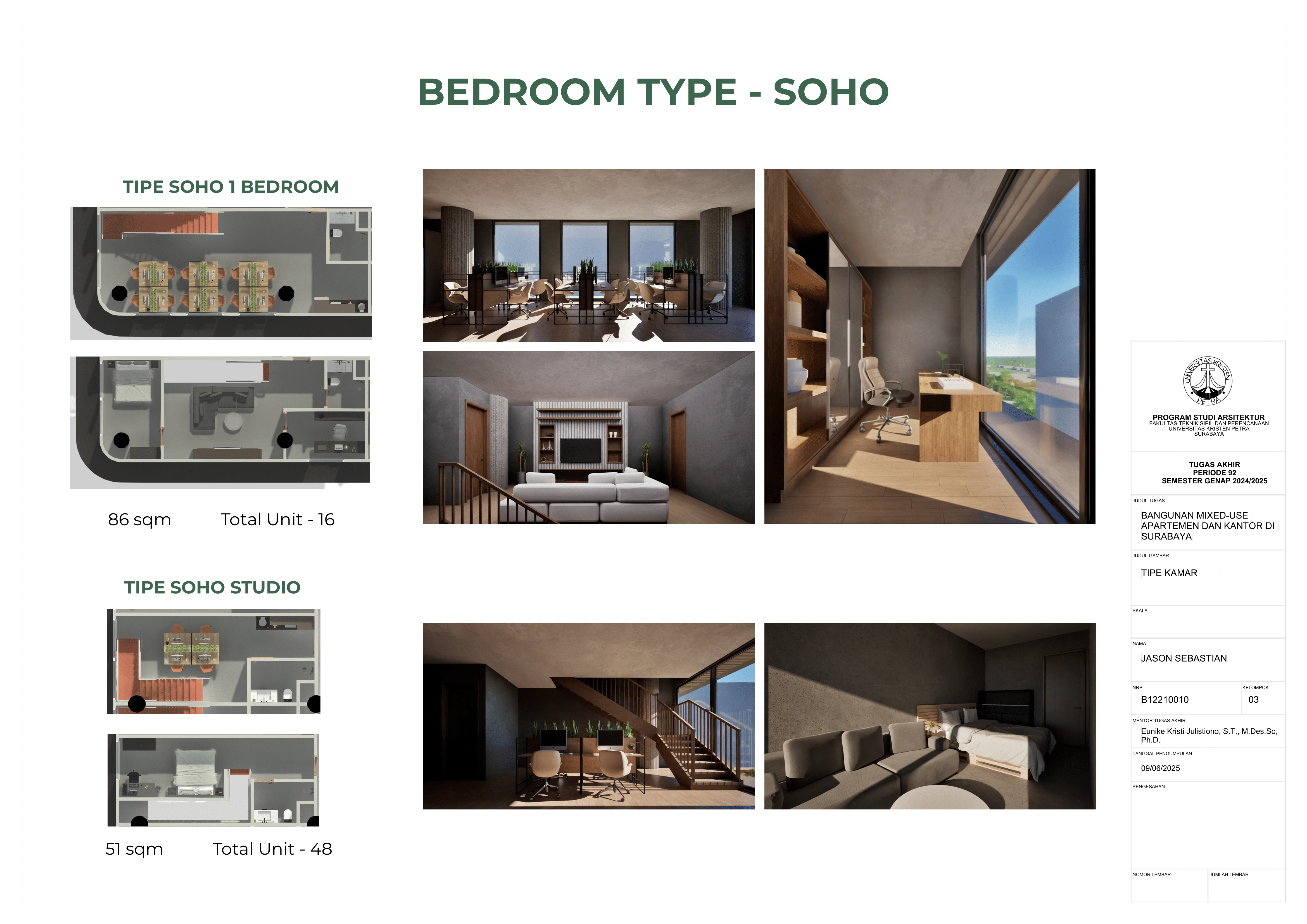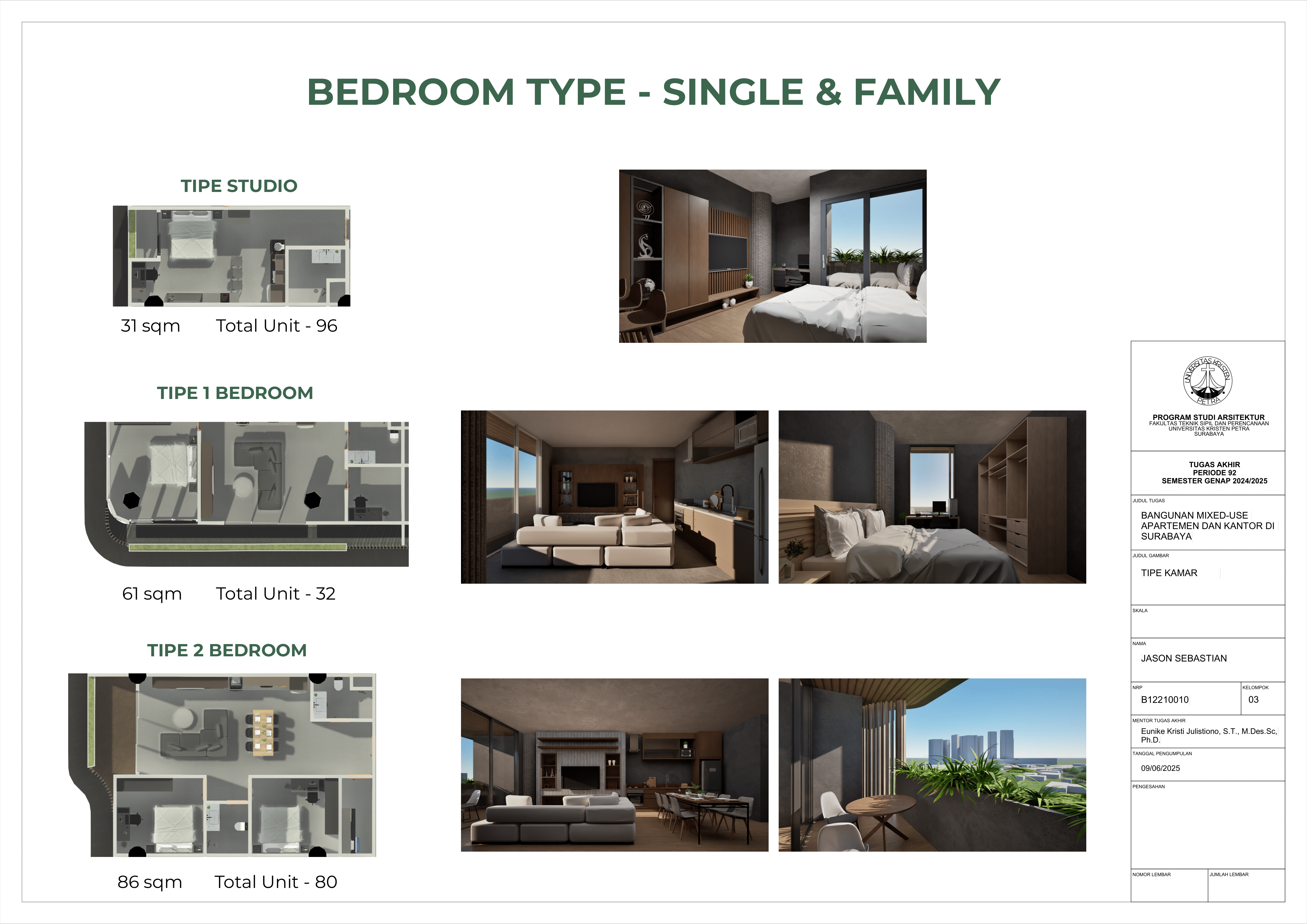 Pertumbuhan urbanisasi dan kebutuhan ruang di Surabaya mendorong pengembangan bangunan vertikal yang mampu mengintegrasikan fungsi hunian dan perkantoran dalam satu lokasi. Perancangan ini bertujuan untuk menghasilkan sebuah bangunan mixed-use yang menggabungkan apartemen dan kantor, dengan pendekatan berkelanjutan sesuai target net-zero emission carbon. Proyek ini mengakomodasi kebutuhan generasi milenial, pengusaha muda, dan pekerja kreatif untuk mengembangkan bisnis startup mereka dengan memaksimalkan efisiensi ruang, kemudahan akses, dan penerapan elemen biophilic untuk meningkatkan kualitas hidup pengguna. Metodologi perancangan melibatkan survei tapak, studi literatur, dan studi preseden untuk bisa menghasilkan desain yang menjawab permasalahan lingkungan saat ini. Bangunan dirancang untuk meminimalisir emisi karbon operasional melalui efisiensi energi, optimalisasi pencahayaan alami, dan penghawaan. Fasilitas yang dirancang meliputi apartemen, kantor sewa, coworking space, area hijau, dan fasilitas penunjang komersial. Perancangan ini juga memperhatikan Sustainable Development Goals (SDGs) terkait penghematan energi dan pertumbuhan ekonomi yang berkelanjutan. Hasil rancangan yang diharapkan adalah desain yang fungsional, fleksibel, dan ramah lingkungan, yang mampu memenuhi kebutuhan masyarakat urban dan memberikan kontribusi positif terhadap arsitektur berkelanjutan di Surabaya.