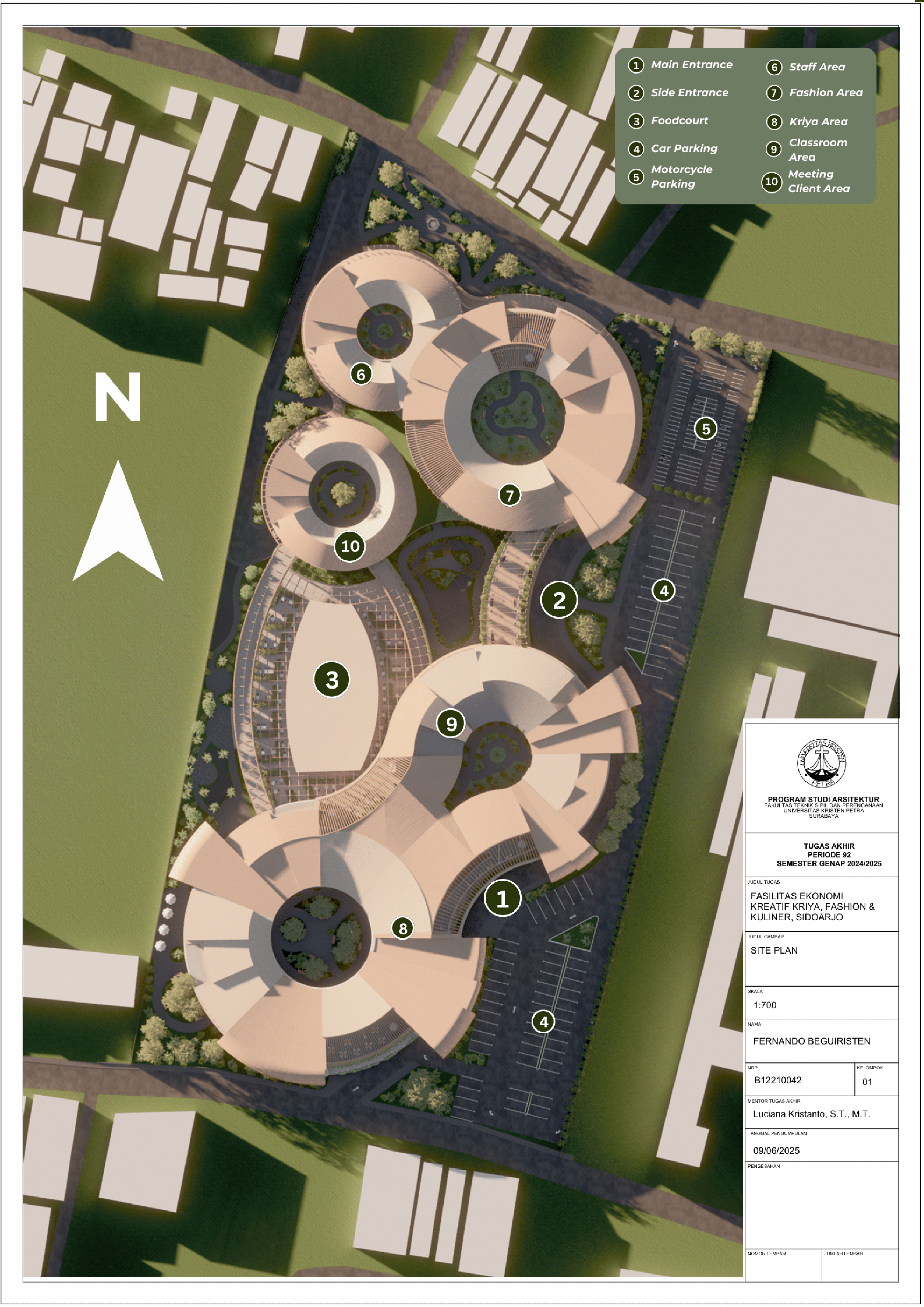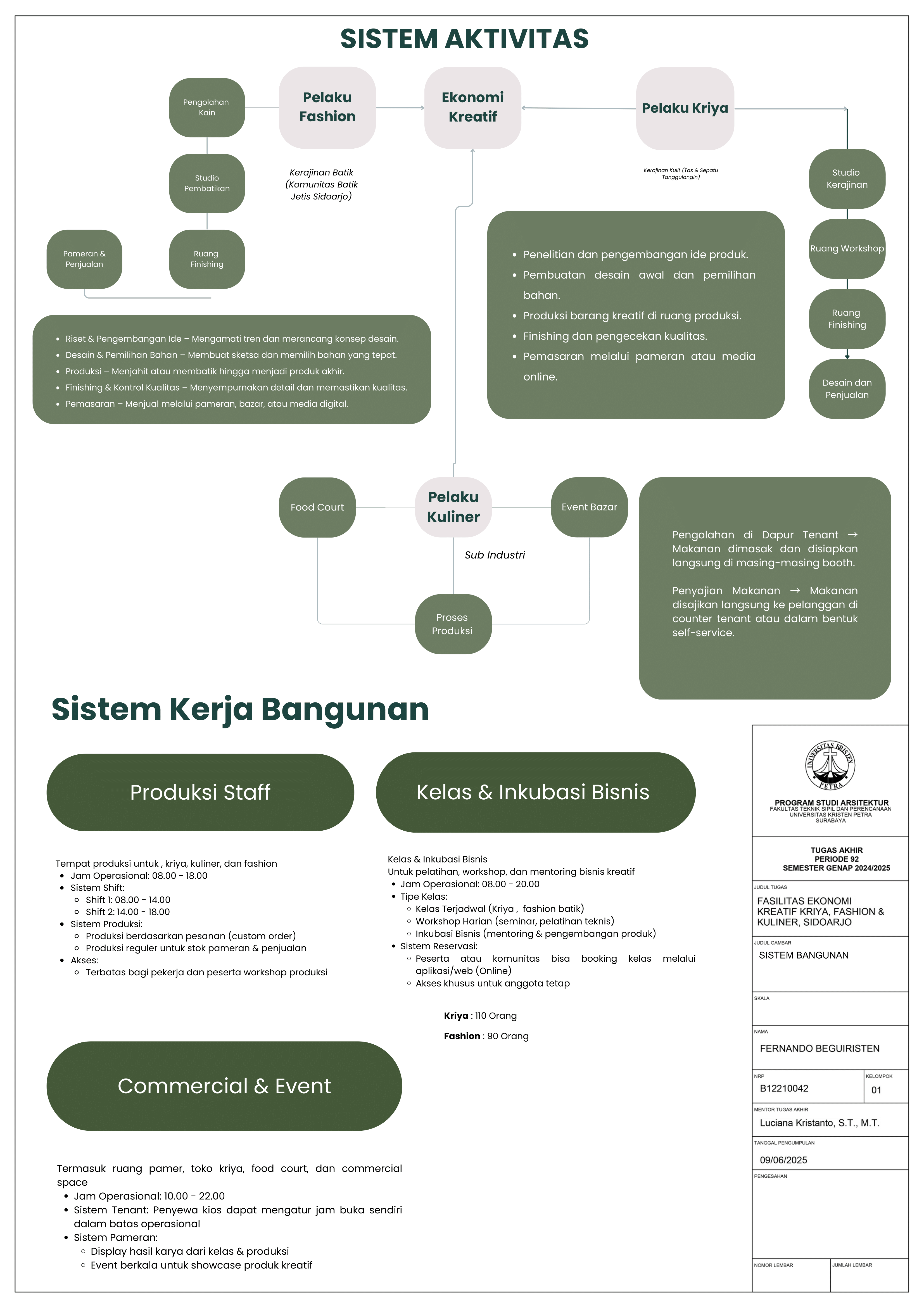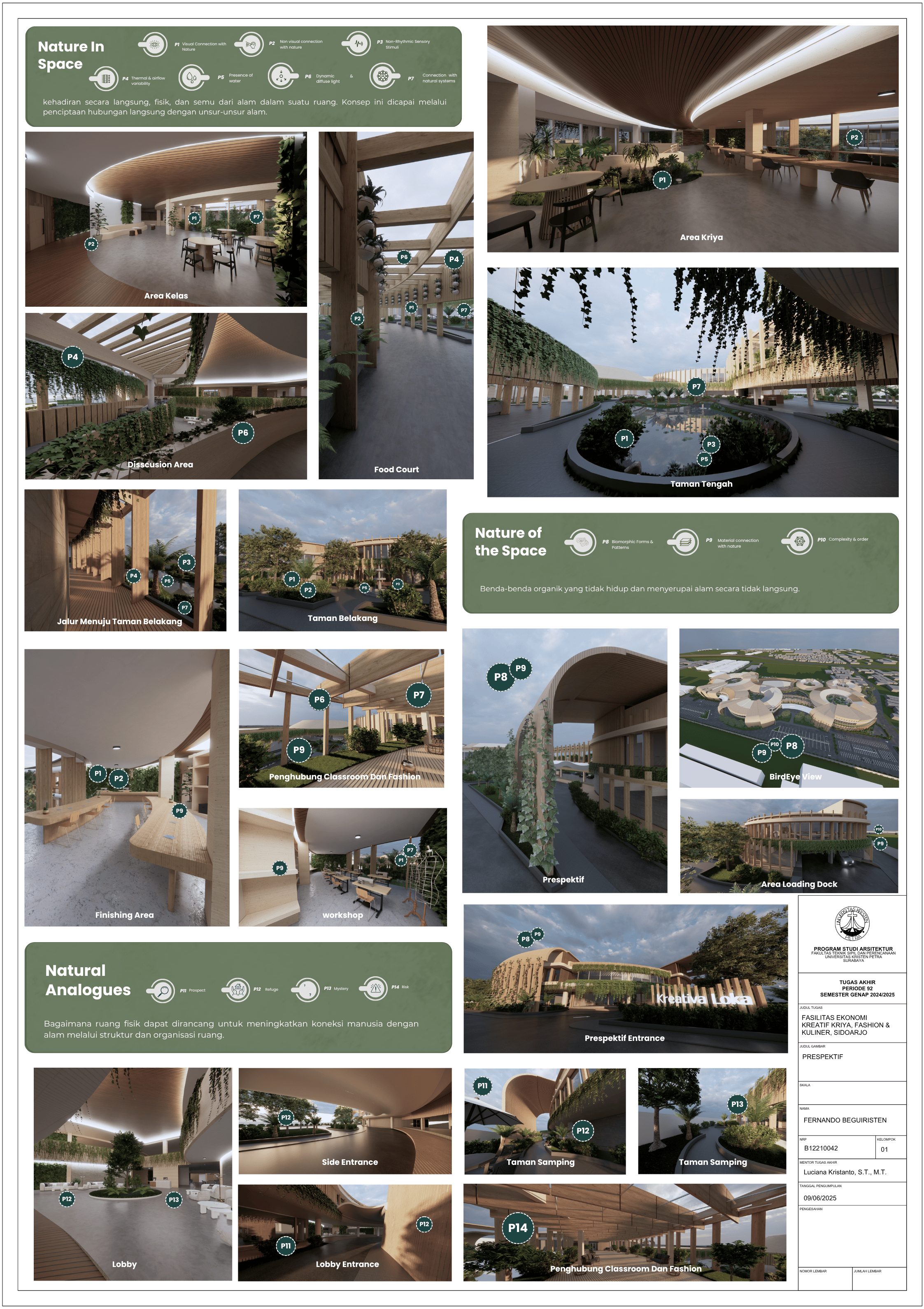 Jawa Timur, provinsi dengan populasi terbesar kedua di Indonesia, menghadapi tantangan besar dalam mengelola kepadatan penduduk dan pengangguran yang meningkat selama pandemi Covid-19. Kabupaten Sidoarjo, salah satu daerah yang terdampak parah, mencatat peningkatan tingkat pengangguran terbuka (TPT) dari 4,72% pada 2019 menjadi 10,97% pada 2020. Proyek ini bertujuan untuk mengatasi kekurangan fasilitas yang mendukung perkembangan industri kreatif di Sidoarjo. Dengan pendekatan biofilik, proyek ini akan menciptakan lingkungan yang mendukung produktivitas dan kreativitas, serta memastikan keberlanjutan lingkungan. Metodologi yang digunakan meliputi studi literatur, studi preseden, observasi, dan survei untuk mengumpulkan data yang relevan. Fasilitas ini akan menyediakan ruang kerja yang memadai, peralatan lengkap, dan program pelatihan komprehensif untuk meningkatkan keterampilan dan daya saing pelaku industri kreatif. Selain itu, fasilitas ini mendukung kolaborasi antar kreator, menyediakan akses ke pasar, dan mempromosikan strategi pemasaran yang efektif. Hasil yang diharapkan adalah peningkatan kesejahteraan masyarakat, penciptaan lapangan kerja baru, dan kontribusi signifikan terhadap pertumbuhan ekonomi daerah. Dengan memenuhi tujuan-tujuan ini, Fasilitas Ekonomi Kreatif di Sidoarjo diharapkan dapat menjadi pusat unggulan yang mendukung perkembangan industri kreatif, meningkatkan kesejahteraan masyarakat, dan mendorong pertumbuhan ekonomi daerah.