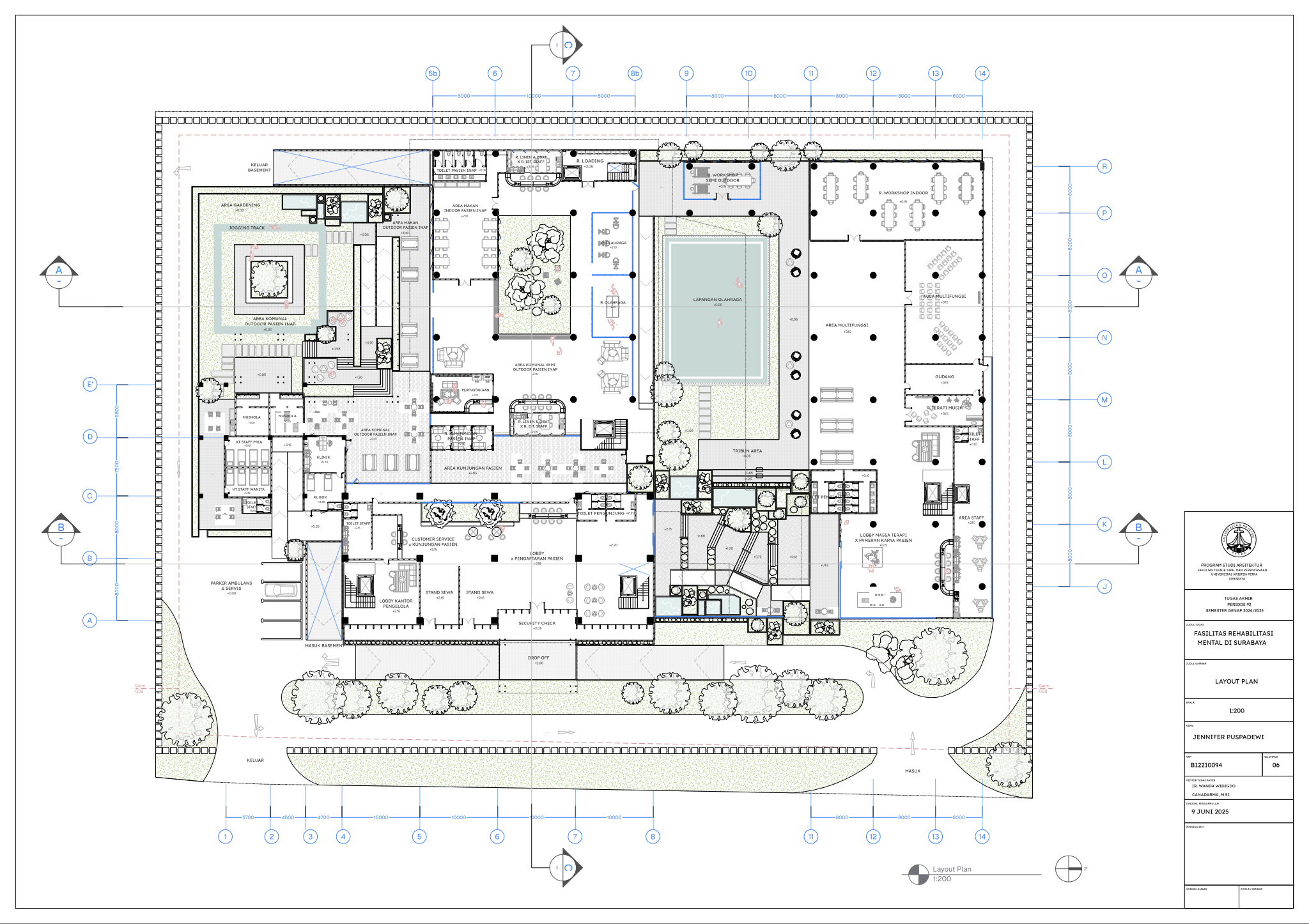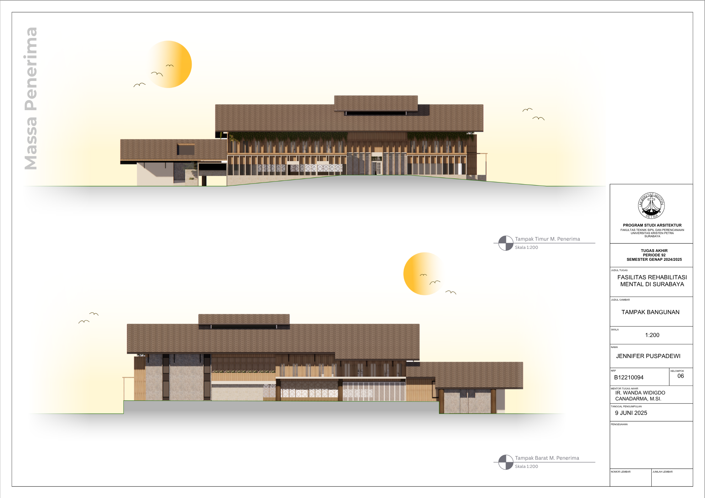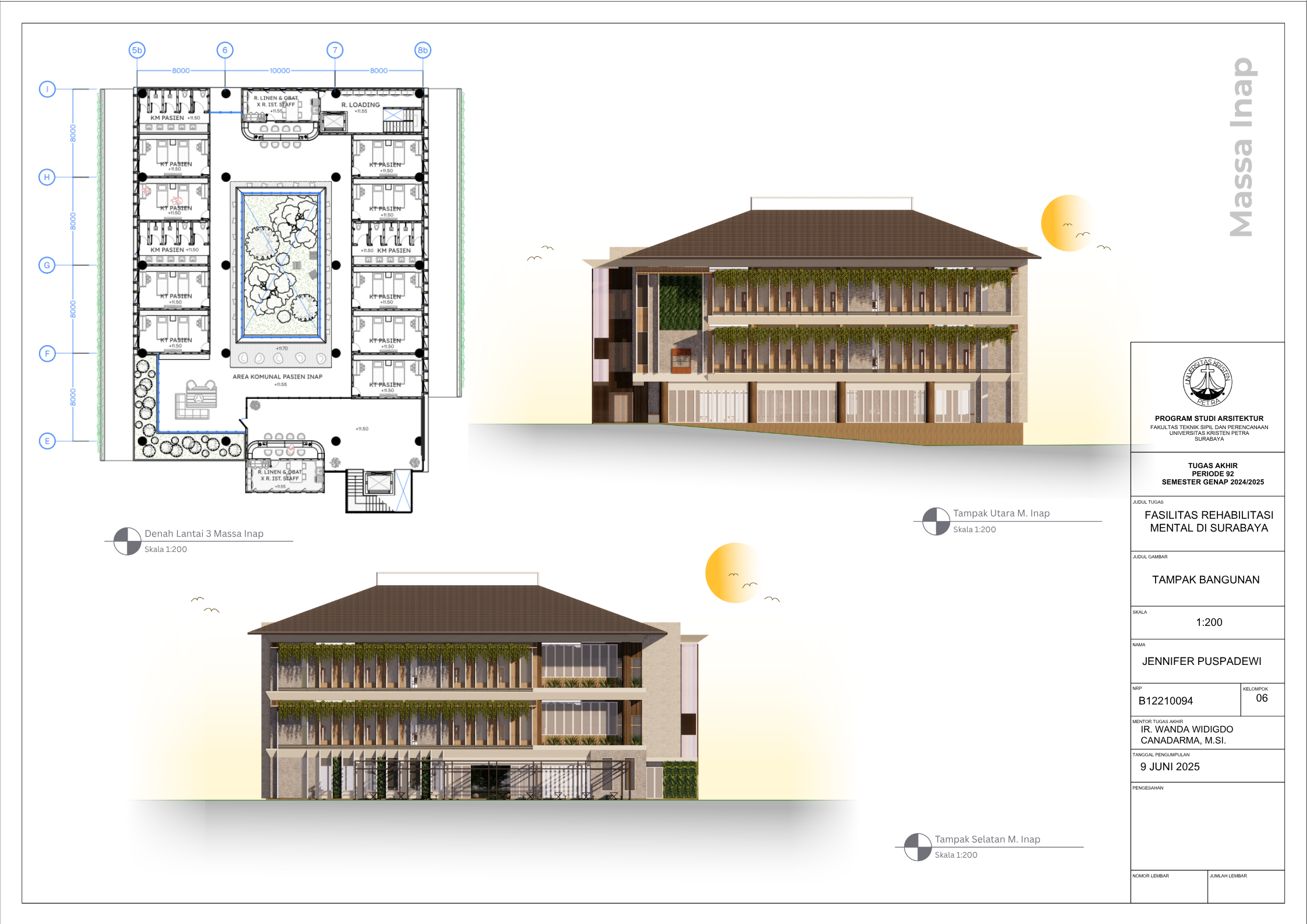 Masyarakat Indonesia yang mengidap gangguan mental mencapai angka 1 dari 5 orang pada tahun 2021 (Dr. C. E. Munthe, 2021) dengan jumlah pasien skizofrenia menduduki peringkat nomor satu di dunia (MetroTV, 2024). Dengan demikian, fasilitas kesehatan mental merupakan kebutuhan yang krusial di Negara Indonesia saat ini di mana tingkat masyarakat dengan gangguan mental tidak sepadan dengan minimnya Fasilitas Kesehatan Mental yang memadai. Karena itu, Tugas Akhir Karya Desain ini bertujuan untuk menciptakan desain Fasilitas Rehabilitasi Mental yang peduli terhadap penggunanya serta menghilangkan stigma negatif masyarakat seputar fasilitas kesehatan mental. Dalam menstudi desain yang paling efektif bagi Fasilitas Rehabilitasi Mental, dilakukan pengumpulan data dengan metode kualitatif dari berbagai literatur profesional serta studi kasus fasilitas serupa yang menerapkan prinsip Healing Architecture. Hasil dari Tugas Akhir ini adalah sebuah desain arsitektur Fasilitas Rehabilitasi Mental dengan fasilitas rawat jalan dan rawat inap yang sesuai dengan standar internasional dan mengimplementasikan elemen-elemen healing di seluruh fasilitas.