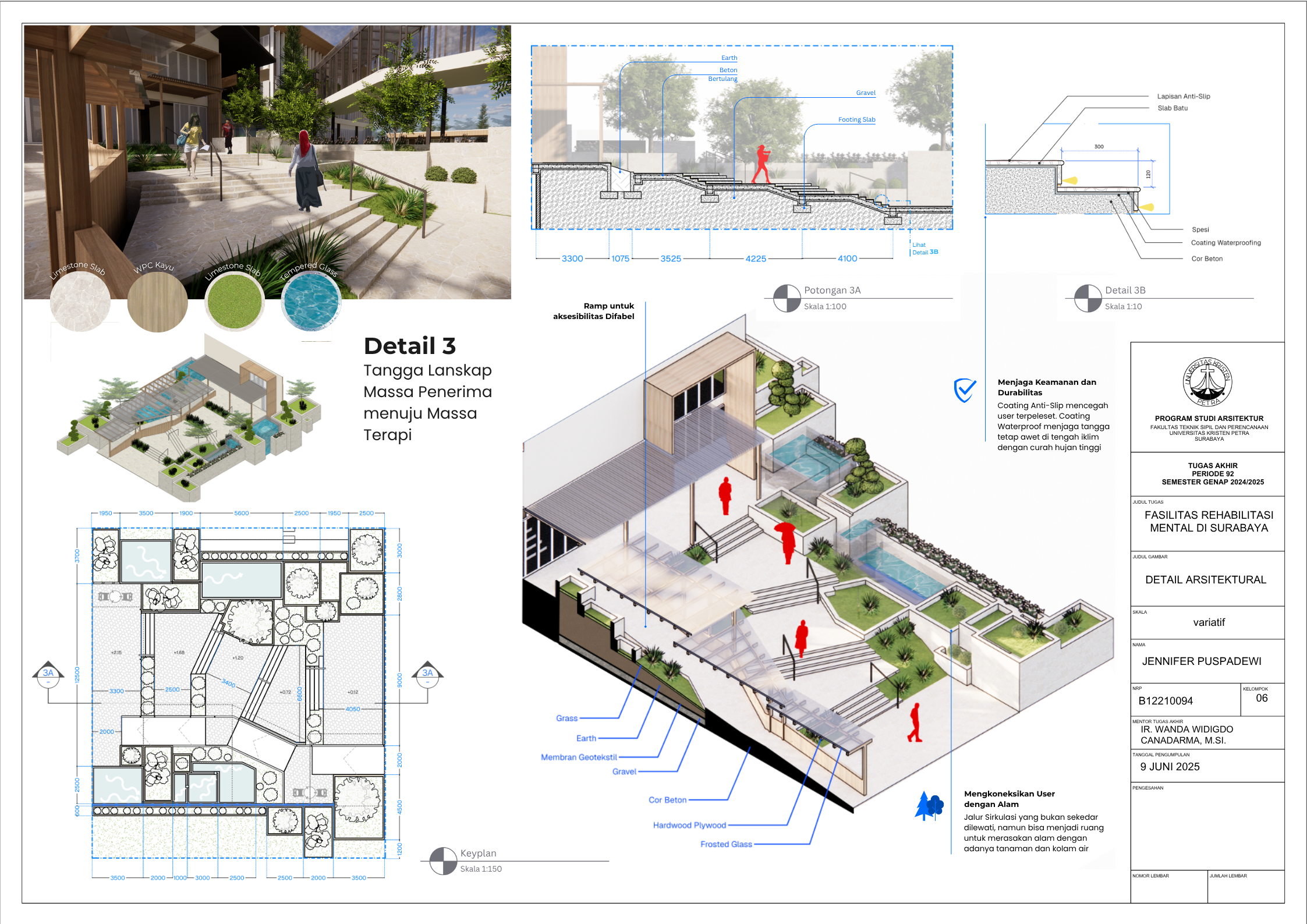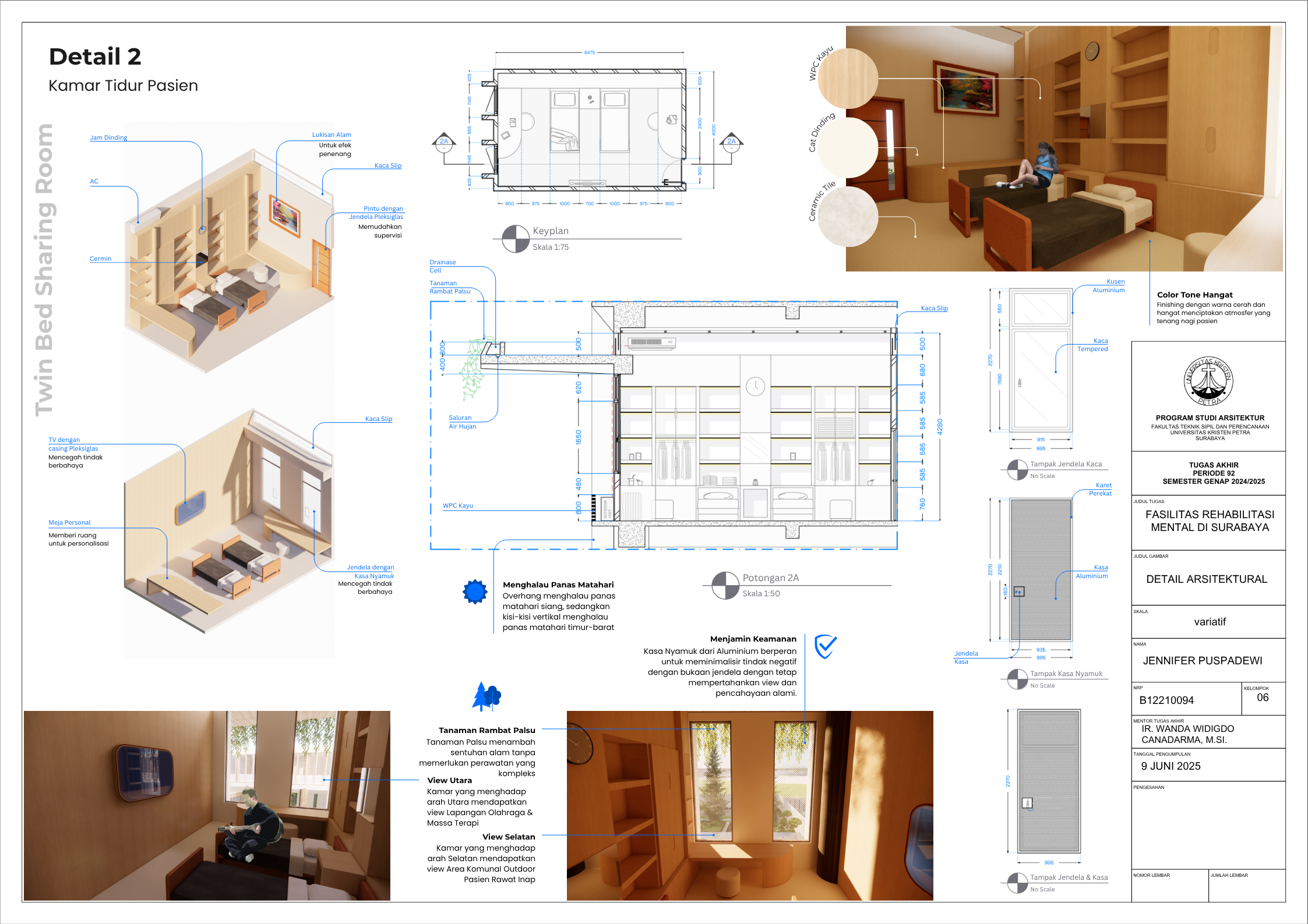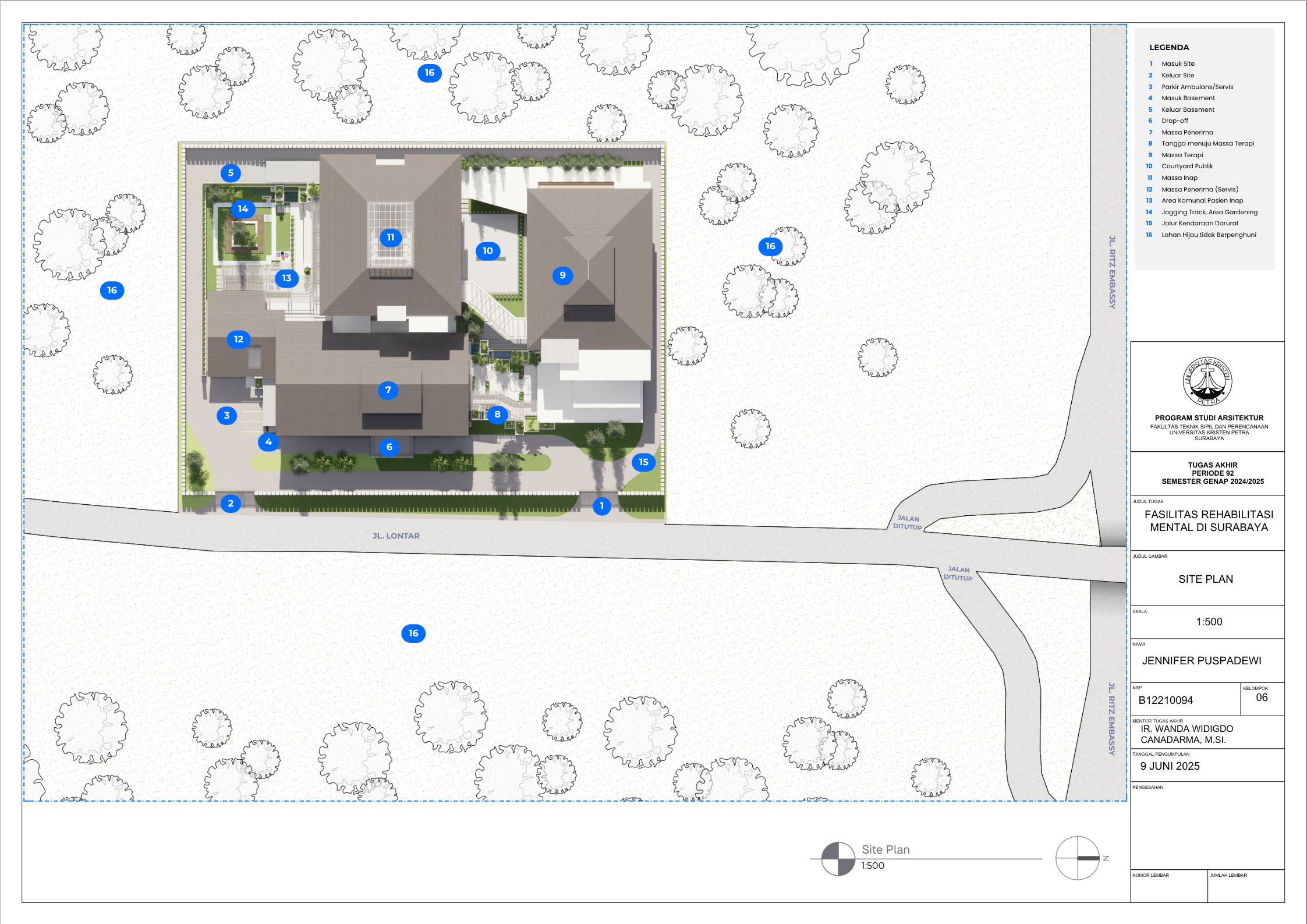 Masyarakat Indonesia yang mengidap gangguan mental mencapai angka 1 dari 5 orang pada tahun 2021 (Dr. C. E. Munthe, 2021) dengan jumlah pasien skizofrenia menduduki peringkat nomor satu di dunia (MetroTV, 2024). Dengan demikian, fasilitas kesehatan mental merupakan kebutuhan yang krusial di Negara Indonesia saat ini di mana tingkat masyarakat dengan gangguan mental tidak sepadan dengan minimnya Fasilitas Kesehatan Mental yang memadai. Karena itu, Tugas Akhir Karya Desain ini bertujuan untuk menciptakan desain Fasilitas Rehabilitasi Mental yang peduli terhadap penggunanya serta menghilangkan stigma negatif masyarakat seputar fasilitas kesehatan mental. Dalam menstudi desain yang paling efektif bagi Fasilitas Rehabilitasi Mental, dilakukan pengumpulan data dengan metode kualitatif dari berbagai literatur profesional serta studi kasus fasilitas serupa yang menerapkan prinsip Healing Architecture. Hasil dari Tugas Akhir ini adalah sebuah desain arsitektur Fasilitas Rehabilitasi Mental dengan fasilitas rawat jalan dan rawat inap yang sesuai dengan standar internasional dan mengimplementasikan elemen-elemen healing di seluruh fasilitas.
