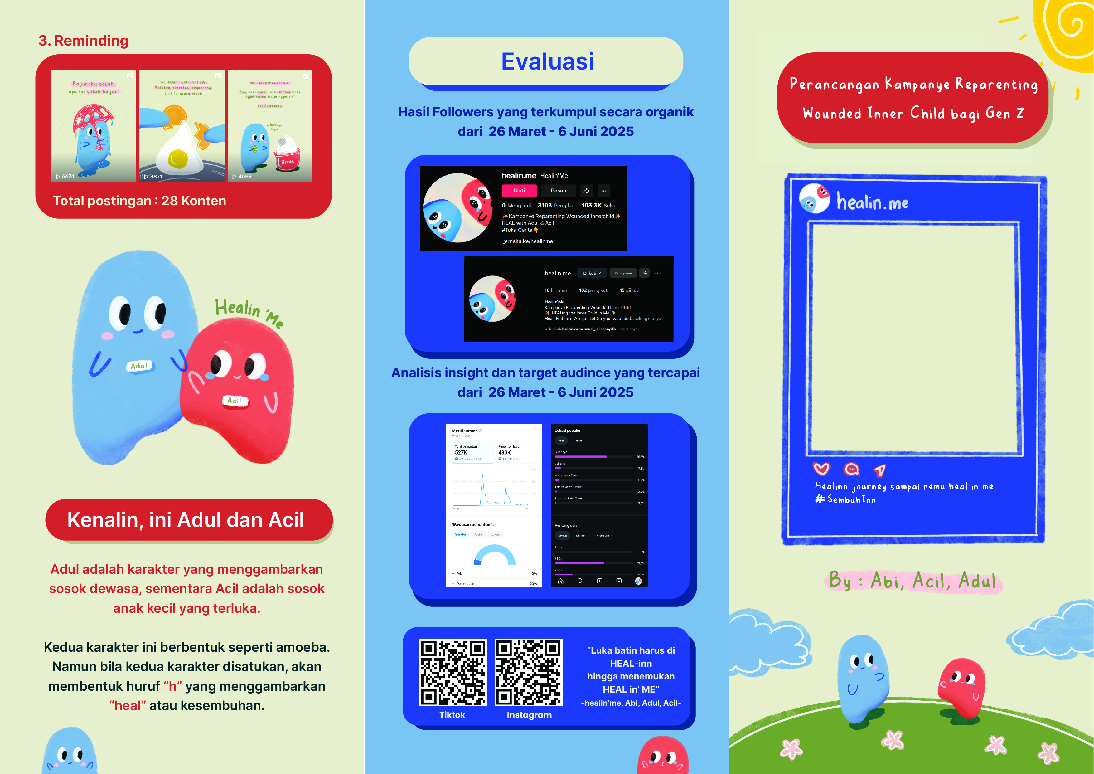 Perilaku manusia seringkali dipengaruhi oleh pengalaman di masa lalu. Trauma atau luka batin yang dialami saat masa kanak-kanak dapat terbawa hingga dewasa dan menimbulkan dampak negatif, baik terhadap diri sendiri, lingkungan sekitar, maupun generasi berikutnya. Berdasarkan hal tersebut, perancangan kampanye ini bertujuan untuk membantu target audiens dalam mengenali, menerima, dan menyembuhkan luka batin yang dimiliki. Kampanye dilaksanakan secara daring melalui media sosial seperti TikTok dan Instagram, serta diperkuat dengan kegiatan luring dan pembagian merchandise sebagai bentuk aktivasi kampanye. Perancangan menggunakan metode kualitatif deskriptif dengan teknik pengumpulan data berupa wawancara, kuesioner, dan observasi. Solusi yang ditawarkan adalah kampanye sosial bernama Healin’Me dengan slogan “Healing The Inner Child in Me”. Kampanye ini dirancang sebagai sarana edukasi dan ekspresi diri yang mendorong audiens untuk menyadari penyebab dan dampak dari wounded inner child, serta memberikan ruang untuk berbagi pengalaman dan membangun empati bersama. Melalui kampanye ini, diharapkan proses penyembuhan luka batin dapat dimulai dan tidak diwariskan secara emosional kepada generasi berikutnya.