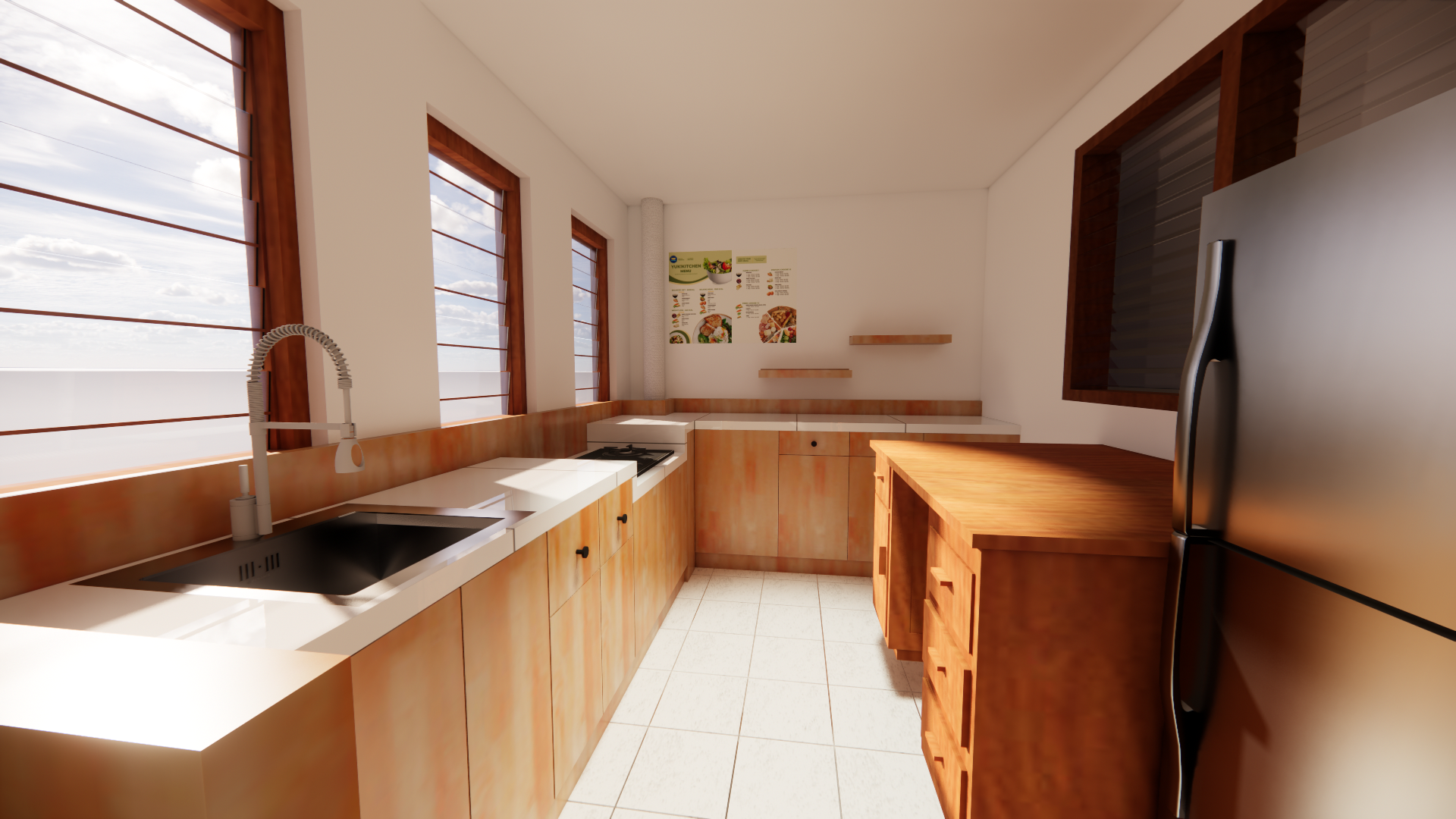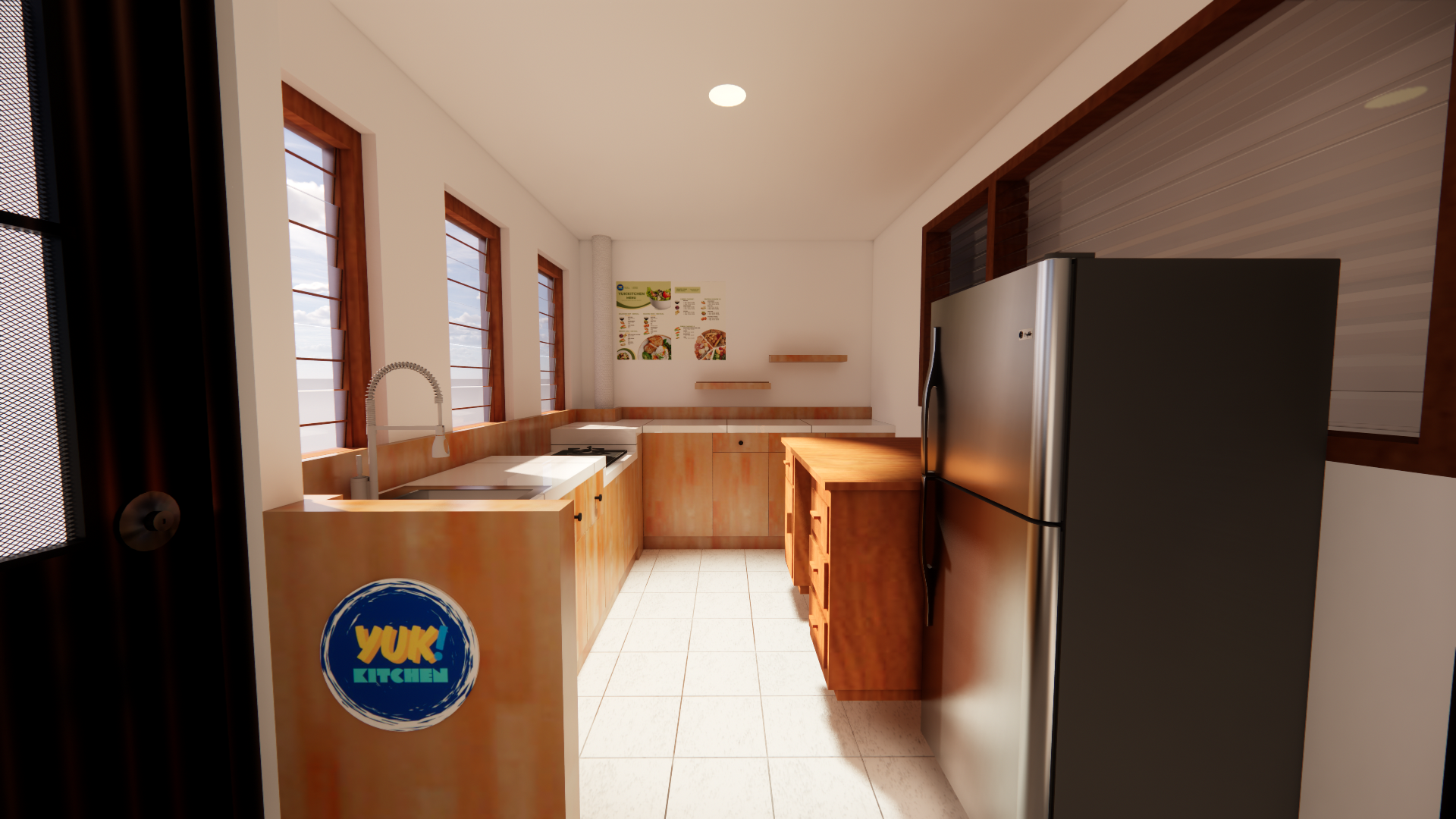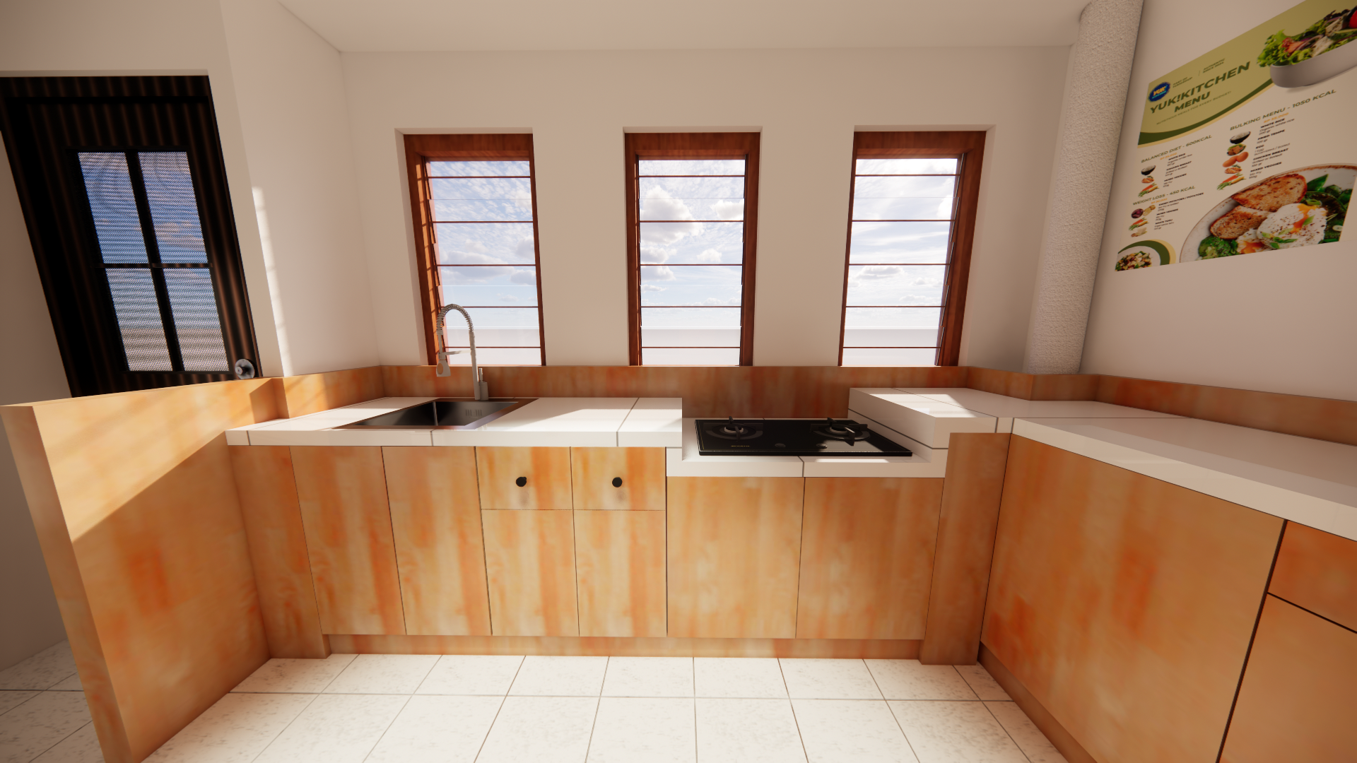 Bisnis Food and Beverage merupakan salah satu ide bisnis yang cocok untuk perintis. Seiring berjalannya waktu, bisnis Food and Beverage mulai berkembang dengan pesat. Salah satu cara paling baik untuk mendukung jalannya bisnis ini adalah dengan memanfaatkan efisiensi kerja dalam dapur. Penelitian ini bertujuan untuk merancang kitchen set dengan menggunakan material utama kayu jati Belanda untuk keperluan dapur bisnis Food and Beverage. Fokus utama penelitian ini adalah menemukan solusi desain yang efisien, pemanfaatan ruangan kecil, kitchen set yang tahan lama, dan ramah lingkungan untuk kebutuhan dapur yang dapat mendukung jalannya bisnis ini. Metode perancangan yang digunakan terdiri dari tiga tahap proses design thinking. Tahap pertama yaitu tahap inspirasi, yang berupa eksplorasi dan pengumpulan referensi yang dapat menjadi dasar bagi pengembangan kitchen set. Tahap kedua yaitu ideasi, yang berupa tahap pengembangan ide dan konsep guna untuk menciptakan Solusi inovatif dan fungsional bagi pengguna. Tahap terakhir yaitu tahap implementasi, yang berupa realisasi produk fisik dari perancangan pada tahap sebelumnya. Hasil perancangan berupa tiga set alternatif kitchen set dan salah satunya direalisasikan. Perancangan yang telah dilakukan menghasilkan produk kitchen set yang tidak hanya fungsional, namun juga memiliki ketahanan yang baik.