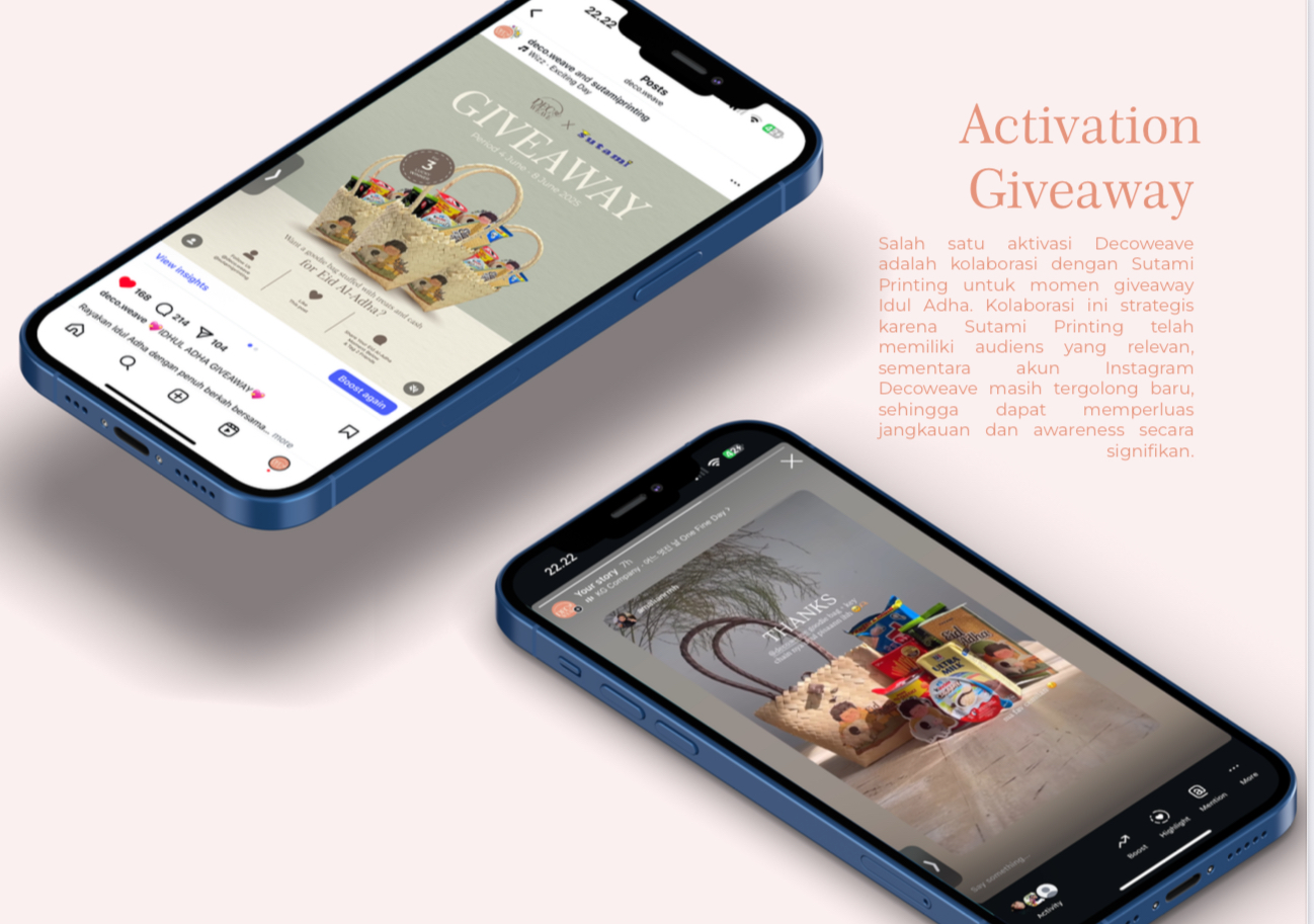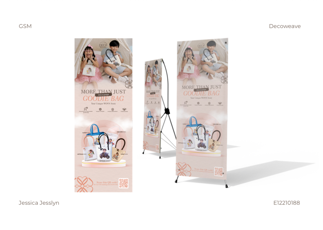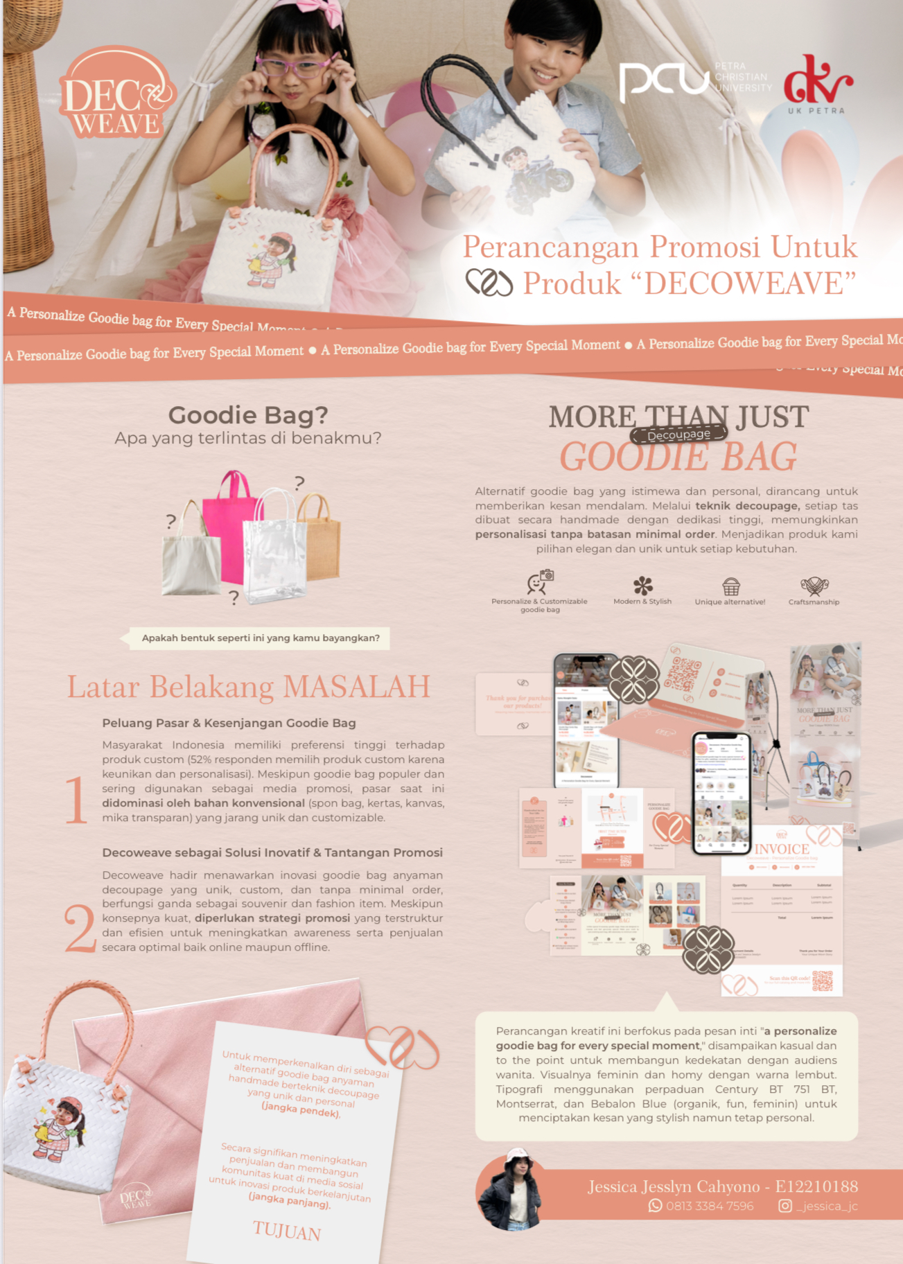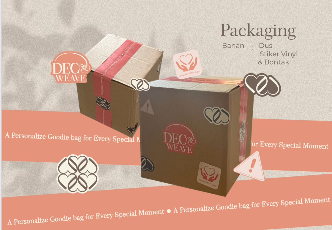 Decoweave merupakan usaha yang berfokus pada goodie bag kustom dengan aplikasi teknik Decoupage. Konsep goodie bag ini berupa tas anyaman berbentuk keranjang dengan sentuhan desain modern. Keunggulan utamanya adalah desain gambar pada goodie bag dapat disesuaikan sepenuhnya dengan preferensi pelanggan, menjadikannya souvenir yang sangat personal dan dapat digunakan kembali (reusable), sehingga tidak terbuang percuma. Lebih dari sekadar wadah belanja, tas keranjang Decoweave juga berfungsi sebagai item fashion yang unik dan dapat melengkapi gaya berbusana. Skripsi ini dirancang untuk membuat strategi promosi yang terintegrasi agar meningkatkan penjualan online, awareness, dan engagement merek Decoweave. Harapannya, dengan strategi ini, Decoweave dapat terus berinovasi, memperluas lini bisnis, serta menciptakan produk goodie bag lain yang sesuai dengan permintaan dan tren pasar. Pendekatan yang digunakan mencakup analisis SWOT dan kerangka AIDA, dirancang untuk menghasilkan dampak optimal dengan batasan anggaran yang ada.