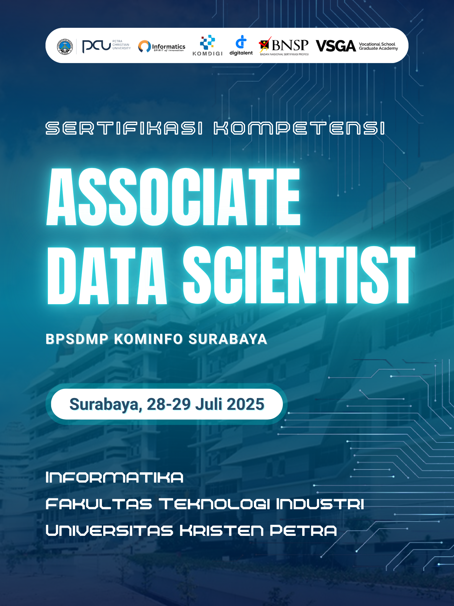 28-29 Juli 2025 Program Studi Teknik Informatika Universitas Kristen Petra bekerja sama dengan BPSDMP Kominfo Surabaya, mengadakan acara "Sertifikasi kompetensi associate data scientist".