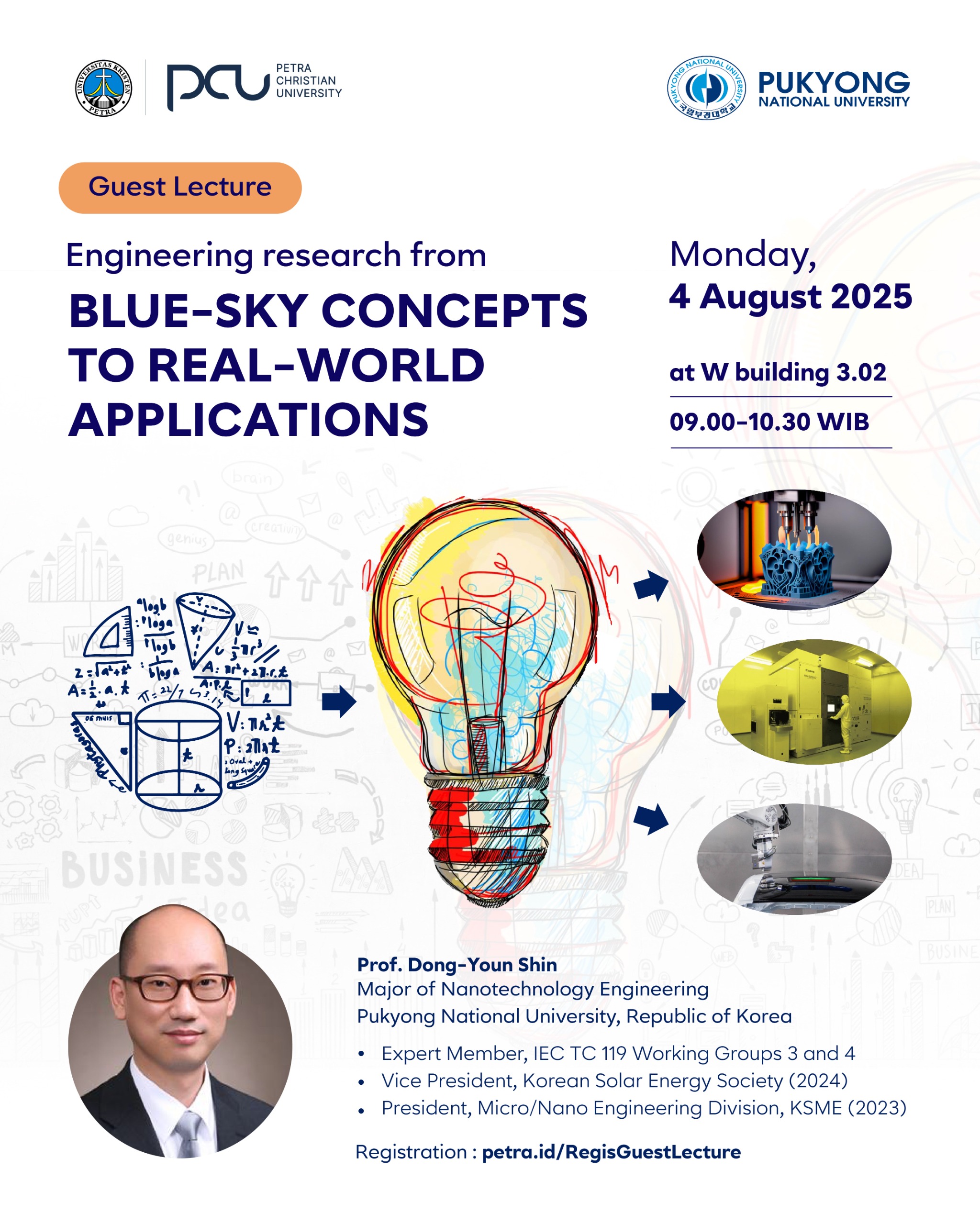 Universitas Kristen Petra Surabaya, pada hari Senin, 04 Agustus 2025 jam 09.00 - 10.30 WIB kedatangan Prof. Dong Youn-Shin dari Korea Selatan. Beliau akan menjadi dosen tamu dengan topik "Engineering research from blue-sky concepts to real world application". Bertempat di gedung W.302.