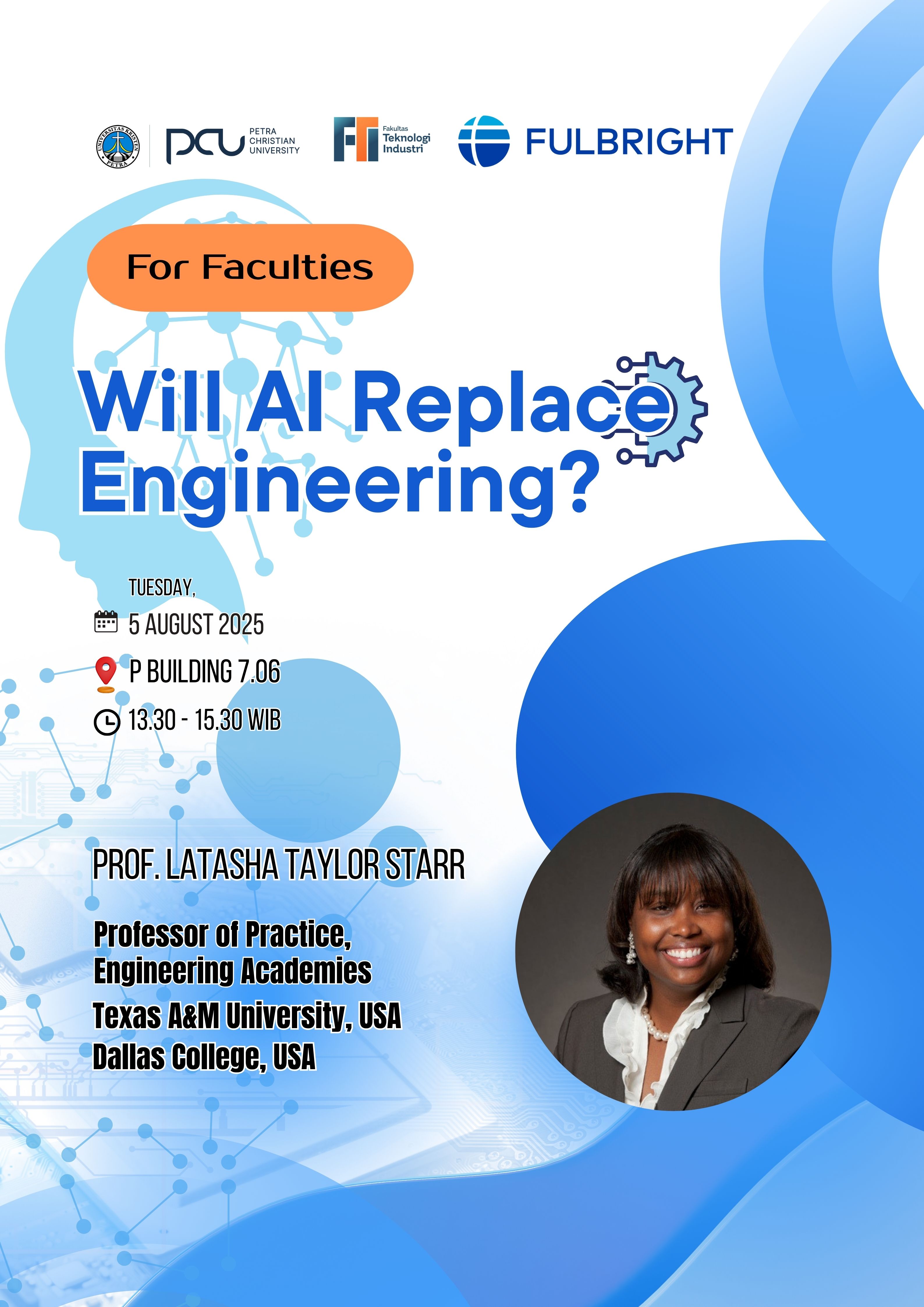 Fakultas Teknologi Industri UK Petra Surabaya pada tanggal 05 Agustus 2025 jam 13.30 - 15.30 WIB bertempat di P.706 mengadakan seminar yang diperuntukan bagi seluruh dosen dilingkup FTI. Dengan mengundang Prof. Latasha Taylor Starr sebagai narasumber dengan mengangkat tema will AI replace engineering.