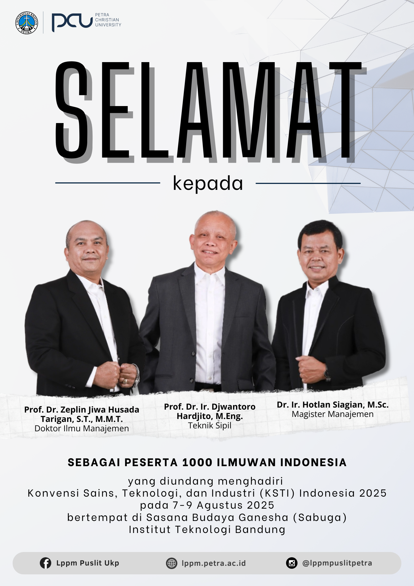 Selamat atas prestasi yang diraih oleh Prof. Zeplin Jiwa Husada Tarigan, Prof. Djwantoro Hardjito dan Dr. Hotlan Siagian sebagai peserta 100 ilmuwan Indonesia yang diundang menghadiri Konvensi Sains, Teknologi dan Industri (KSTI) Indonesia 2025, pada 07-09 Agustus 2025 di Sasana Budaya Ganesha (Sabuga) Institut Teknologi Bandung.