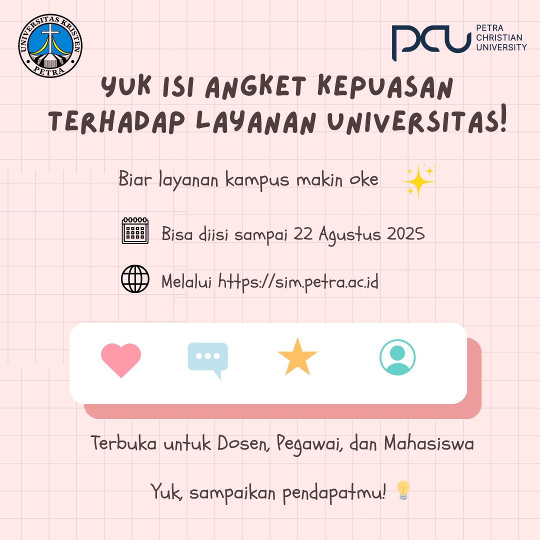 Untuk meningkatkan layanan di dalam kampus Universitas Kristen Petra, maka Badan Penjaminan Mutu UK Petra melaksanakan survey kepuasan. Terbuka bagi semua dosen, tenaga kependidikan, serta mahasiswa UK Petra. Survey dilaksanakan hingga 22 Agustus 2025.