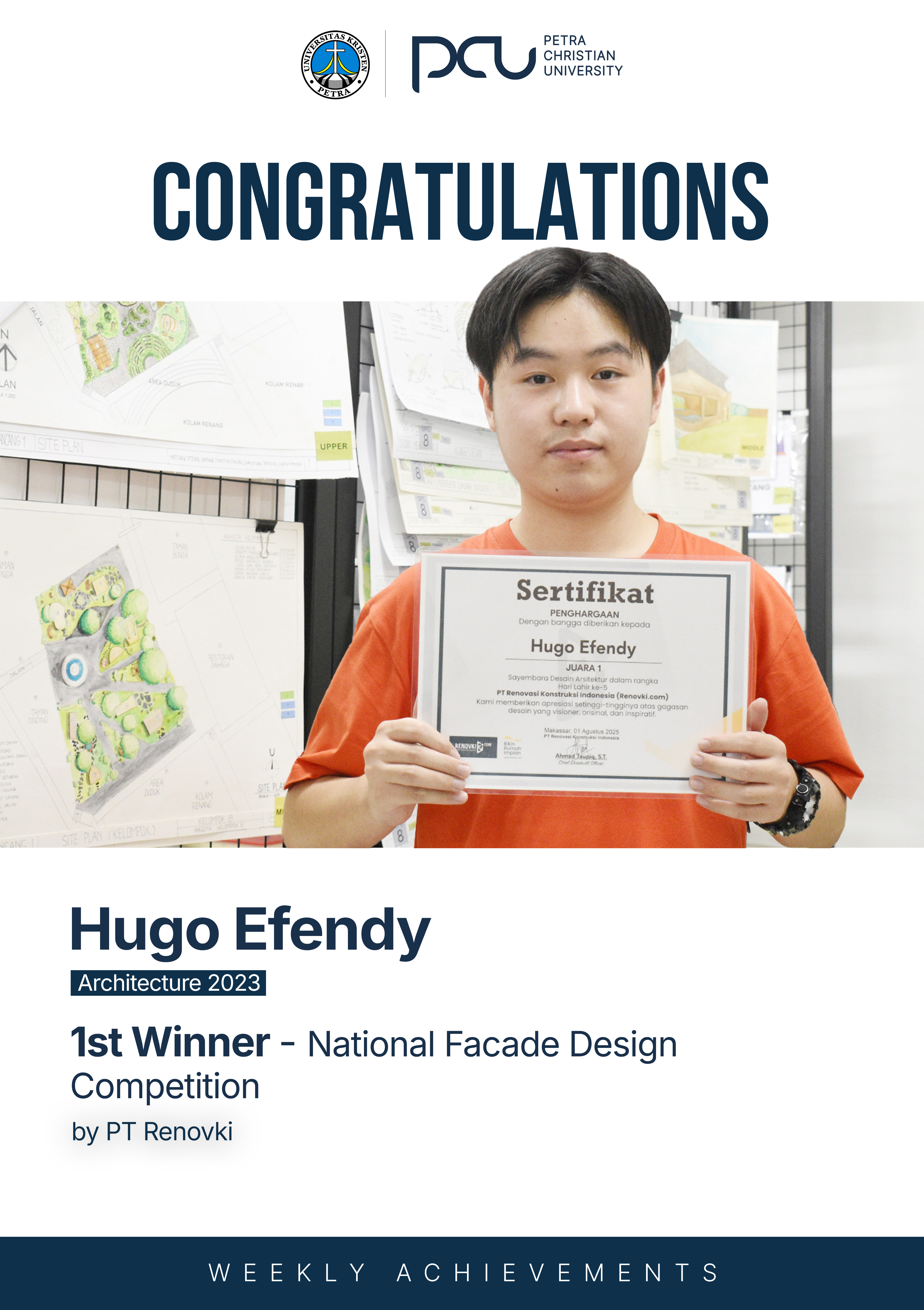 Selamat atas prestasi yang diraih oleh Hugo Efendy sebagai 1st Winners of National Facade Design Competition by PT Renovki