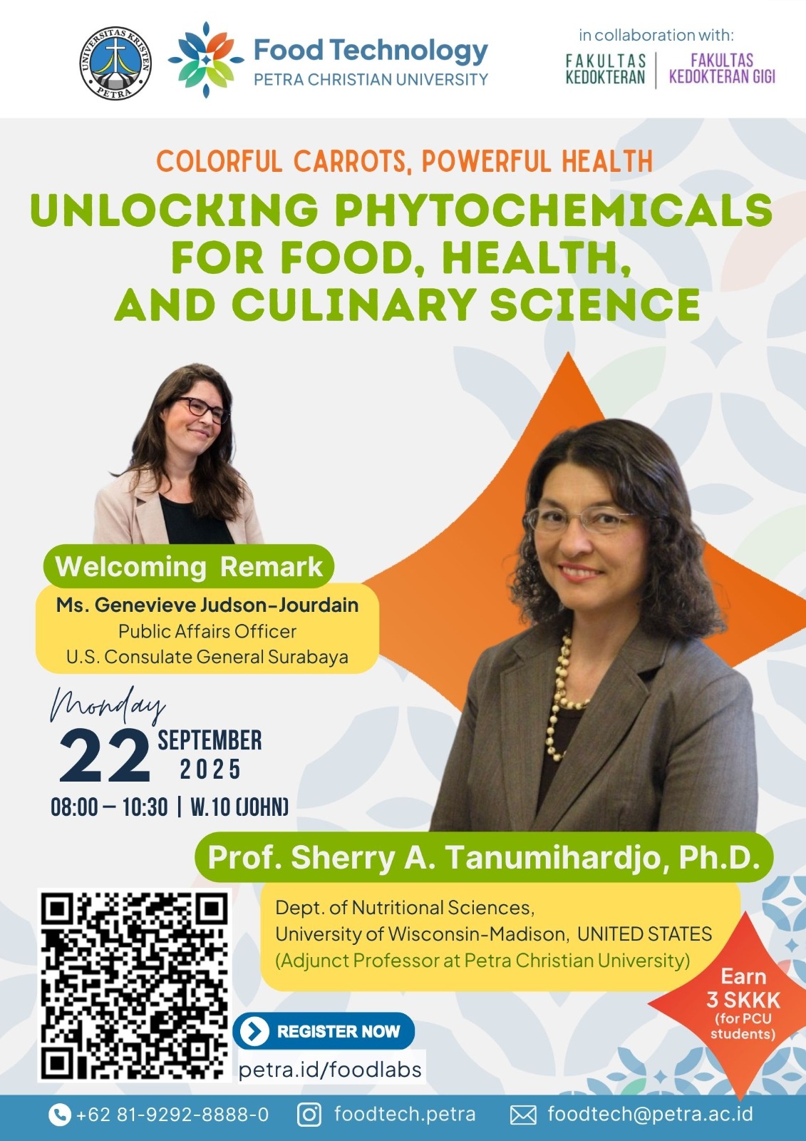 Di tengah tantangan mendesak kesehatan masyarakat di Indonesia, khususnya terkait kekurangan gizi, peran pangan fungsional menjadi semakin penting. Dengan pergeseran global menuju pola makan yang kaya buah dan sayuran, dampak potensialnya terhadap kesehatan tidak bisa diremehkan. Konteks ini menjadi latar belakang kuliah tamu yang akan disampaikan oleh Profesor Sherry A. Tanumihardjo, Ph.D., dari Departemen Ilmu Gizi, University of Wisconsin-Madison. Penjelajahannya ke dalam dunia wortel yang beragam dan penuh warna menawarkan perspektif baru tentang gizi yang berpotensi membawa perubahan besar bagi lanskap kesehatan masyarakat Indonesia. Wortel, yang dulu dianggap hanya sayuran oranye sederhana, ternyata merupakan sumber kompleks dari berbagai nutrisi penting. Penelitian Profesor Tanumihardjo menyoroti biofortifikasi wortel, yaitu peningkatan kandungan provitamin A serta pengembangan varietas baru berwarna oranye-ungu-merah yang mengandung spektrum karotenoid, antosianin, dan likopen yang bermanfaat. Senyawa-senyawa ini menjanjikan manfaat mulai dari mendukung kesehatan penglihatan dan sistem imun hingga melindungi dari penyakit jantung dan penurunan fungsi kognitif. Saat Indonesia masih berjuang menghadapi tantangan gizi, kuliah ini memberikan wawasan yang tepat waktu tentang bagaimana wortel biofortifikasi dapat membantu mengatasi defisiensi vitamin A, sebuah masalah serius yang berdampak pada kebutaan malam dan kesehatan secara umum. Dengan mengadopsi pendekatan berbasis pangan utuh alih-alih hanya mengandalkan suplemen, masyarakat Indonesia dapat meningkatkan gizi mereka secara berkelanjutan. Kuliah tamu ini diselenggarakan pada 22 September 2025. Jam 08.00 -10.30 WIB bertempat di ruang W.10.