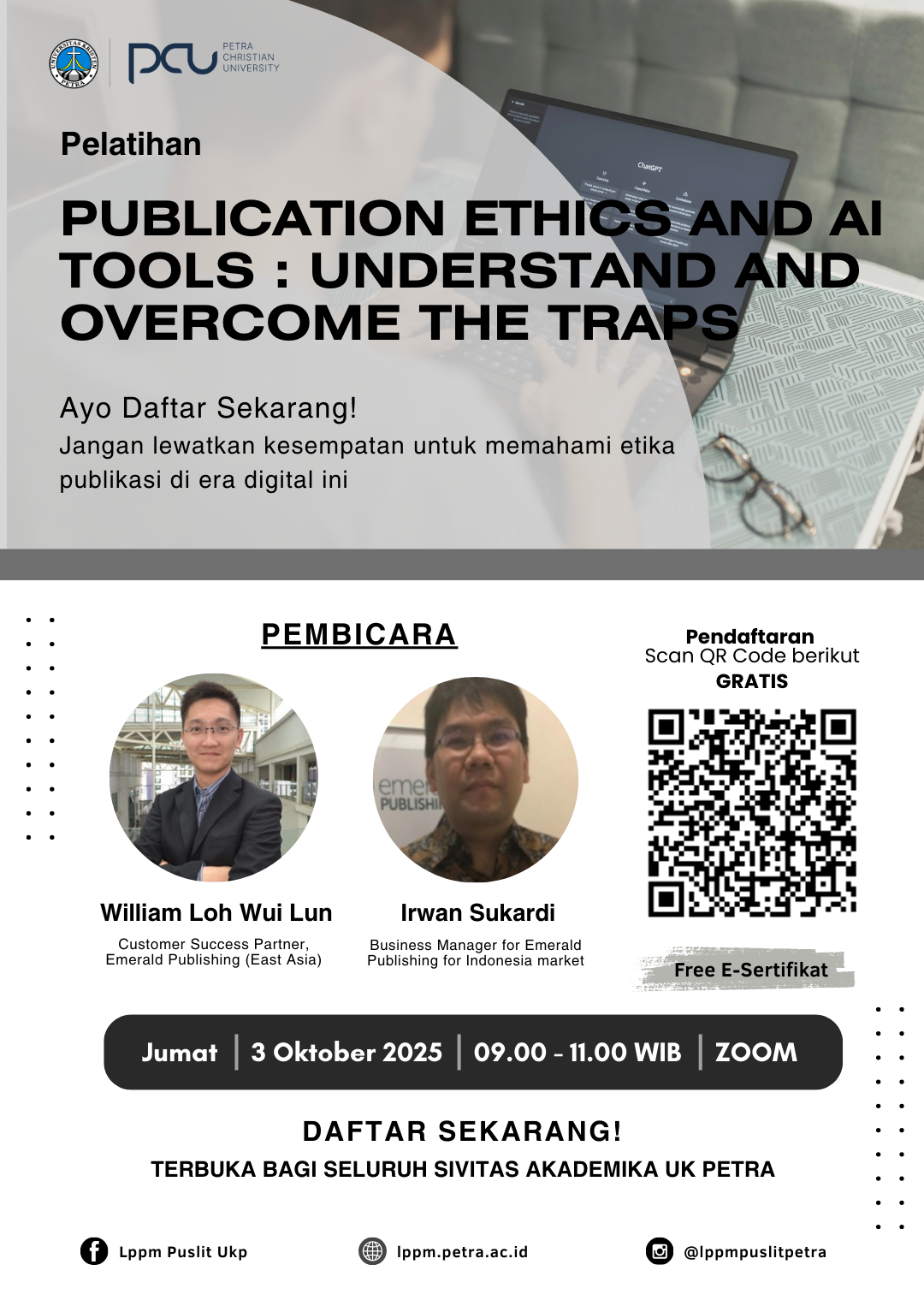 Pada Jumat, 03 Oktober 2025 jam 09.00 - 11.00 WIB Lembaga Penelitian dan Pengabdian Masyarakat UK Petra mengadakan acara Pelatihan publication ethics and AI tools: understand and overcome the trapse. Acara ini dilangsungkan secara online dengan narasumber William Loh Wui Lun serta Irwan Sukardi.