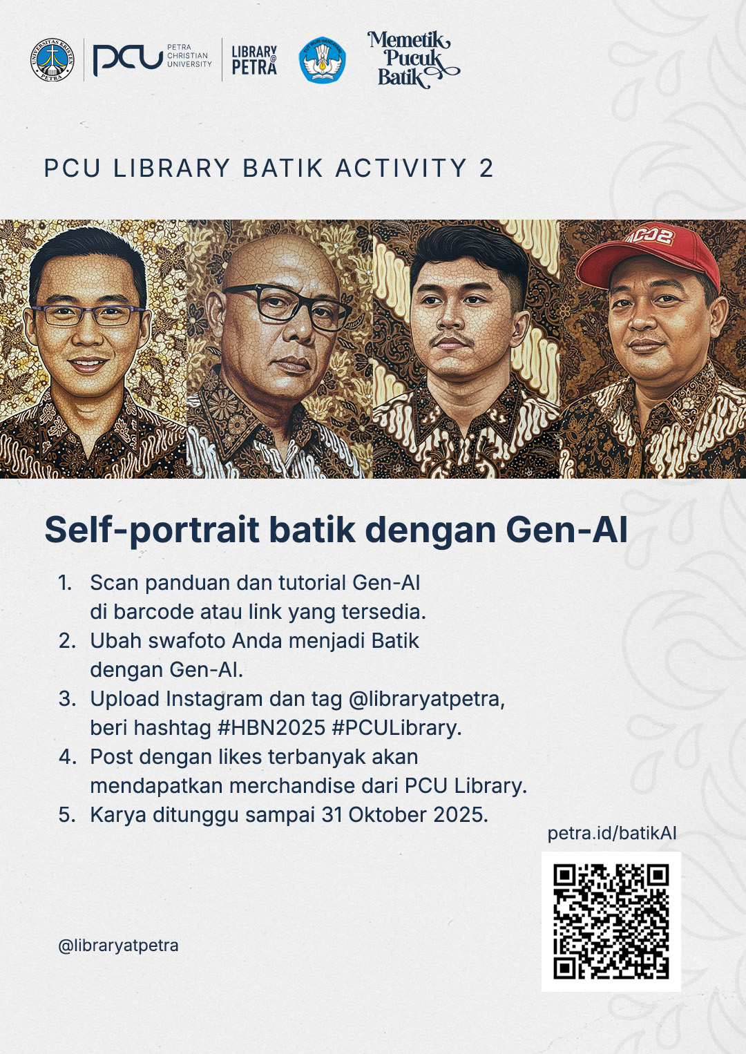 Perpustakaan UK Petra dalam rangka Hari Batik Nasional, mengadakan acara selfie dengan batik menggunakan teknologi AI (Gemini). Kemudian hasil selfie diupload di instagram dan tag @libraryatpetra dan beri hastag #HBN2025 #PCULibrary