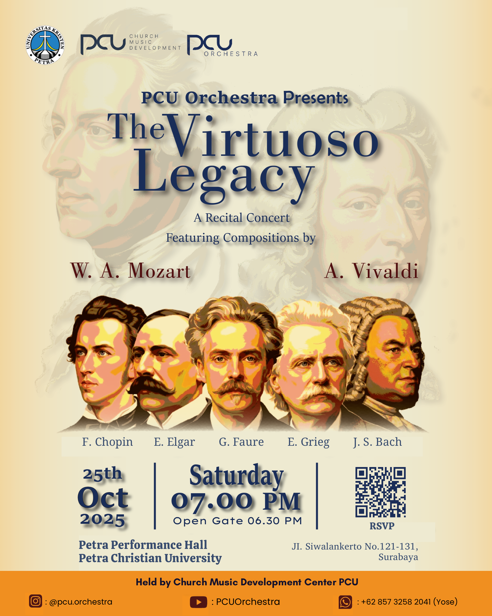 Orchestra Universitas Kristen Petra akan menggelar event tahunan. Pada Sabtu, 25 Oktober 2025, jam 19.00 WIB bertempat di Petra Performance Hall akan mempersembahkan klarya terbaiknya dengan topik The Virtuoso Legacy.